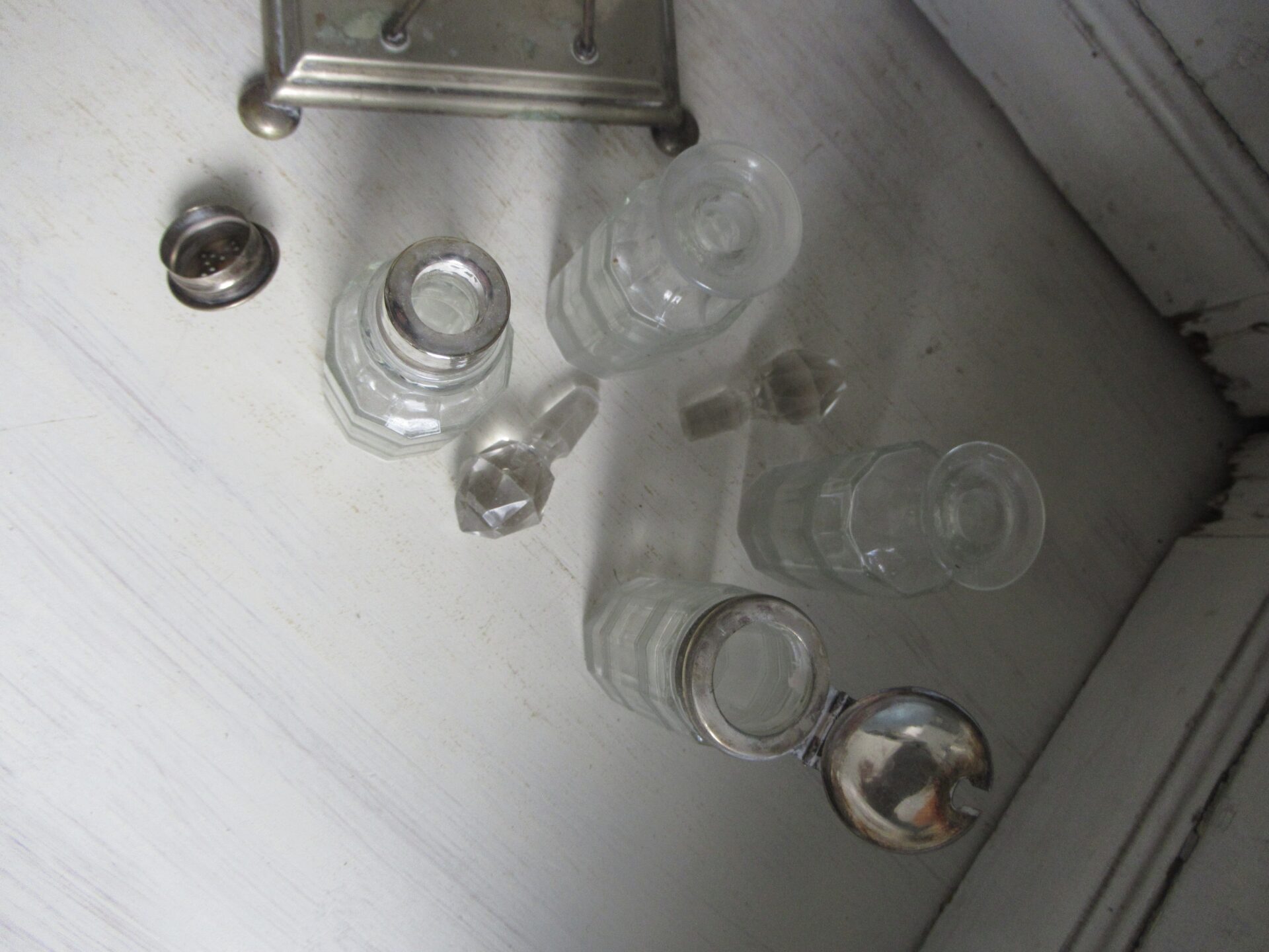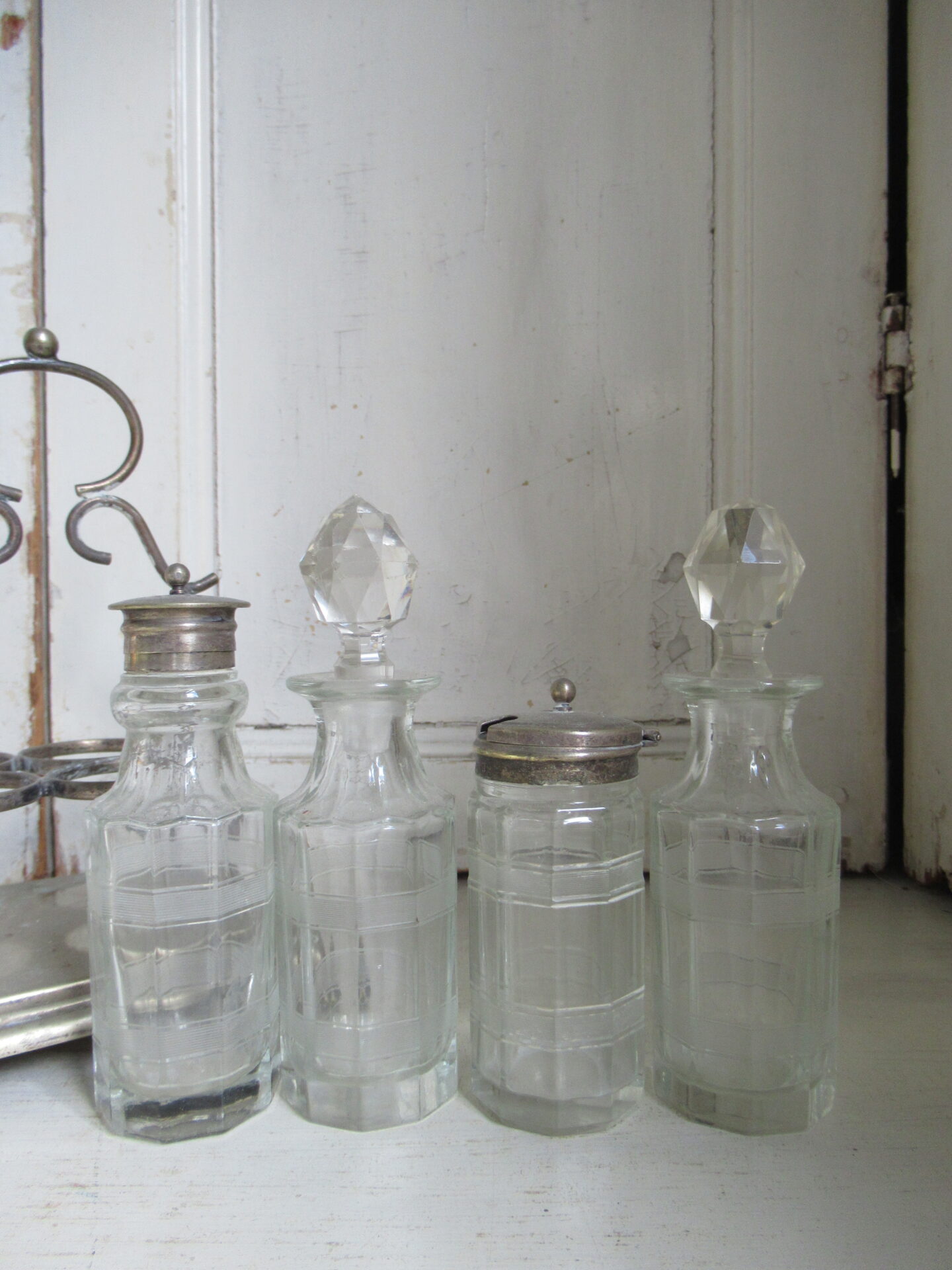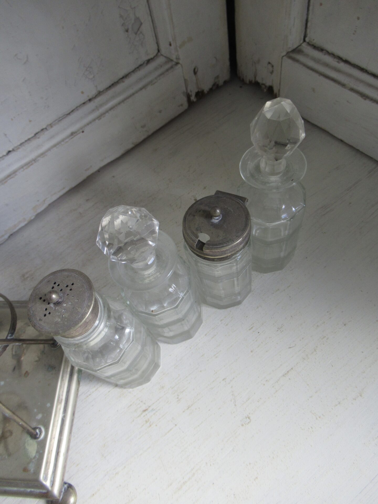 antiek Engels ‘oil and vinegar’ setje, menage, in prachtige staat, setprijs (rekje 16 bij 16 cm, 22 cm hoog)
