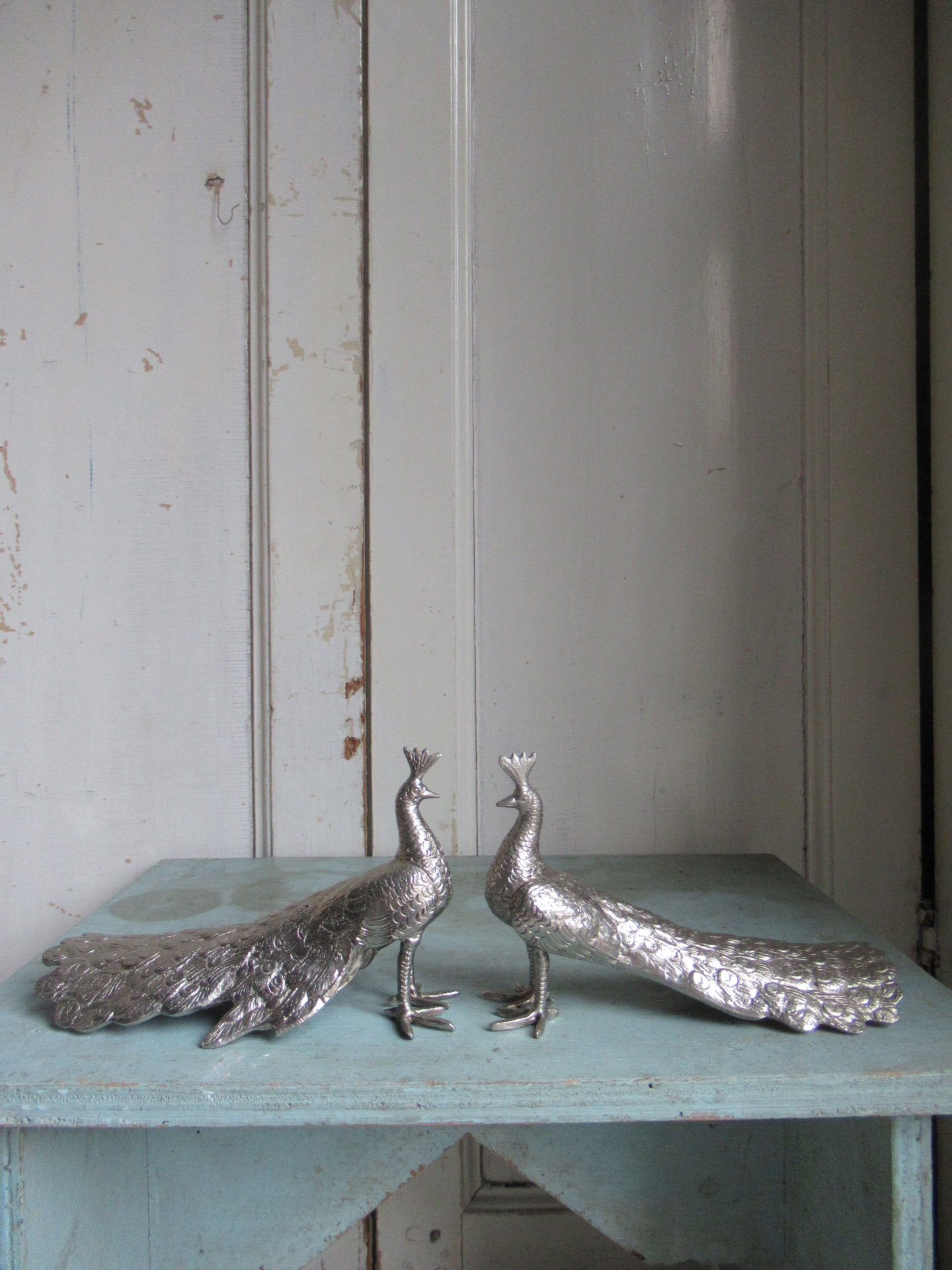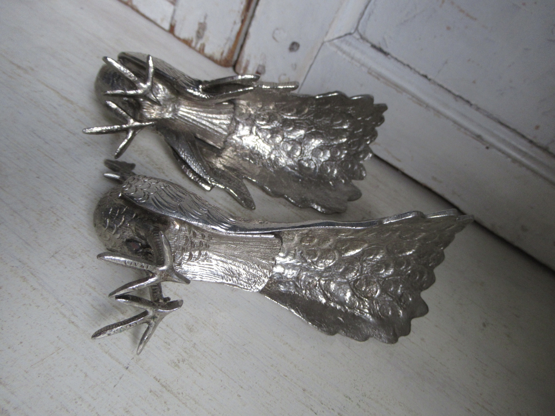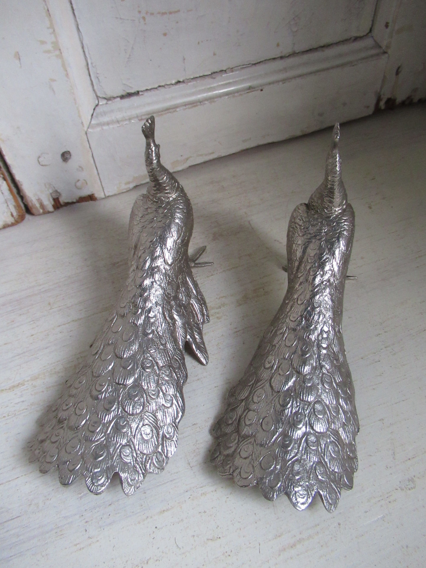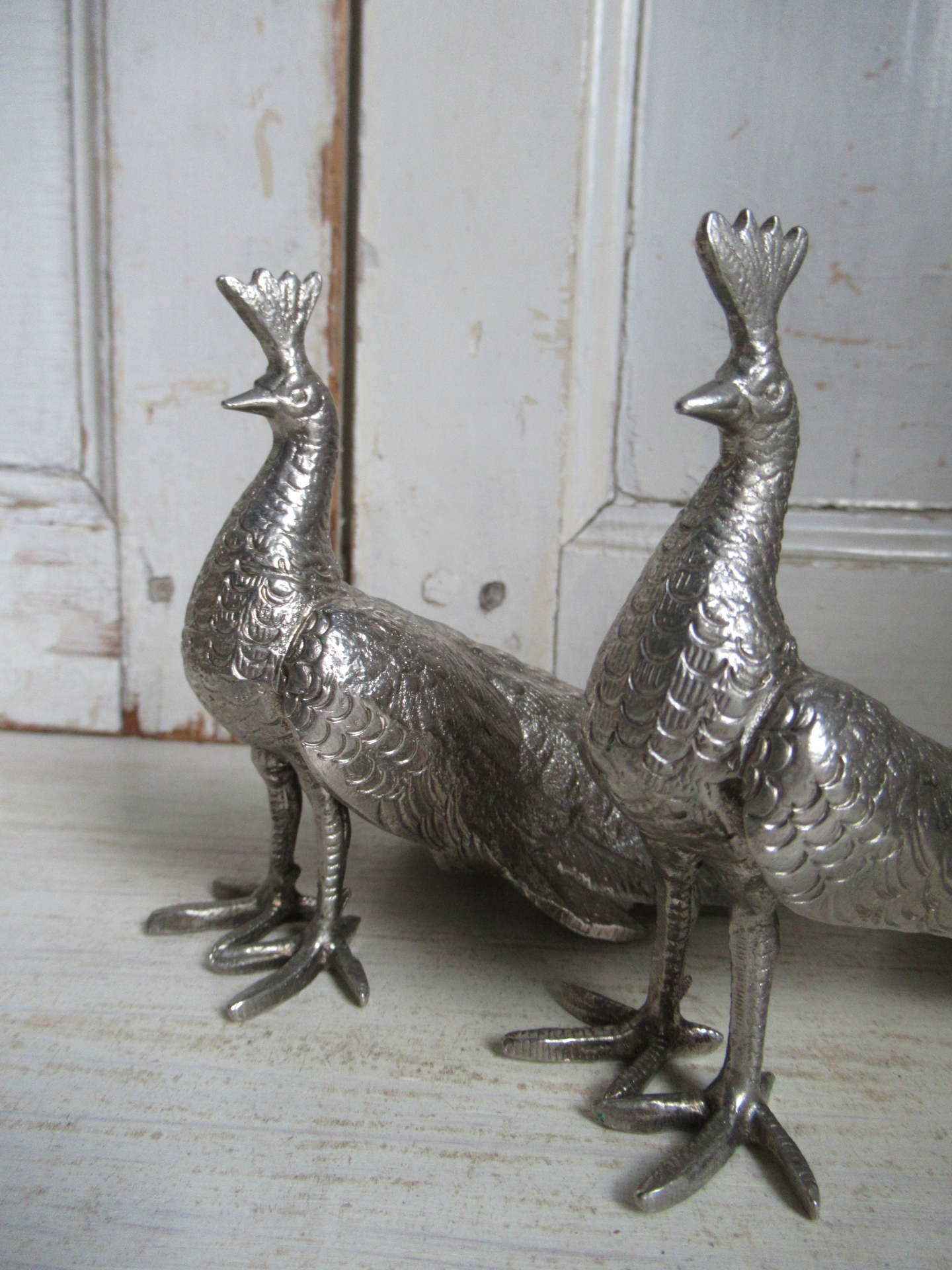 2 oude pauwen, hen en haan, zilverkleurig metaal, tafel decoratie, meegenomen uit Engeland, setprijs (17 bij 8 cm, hoogte 11 cm)