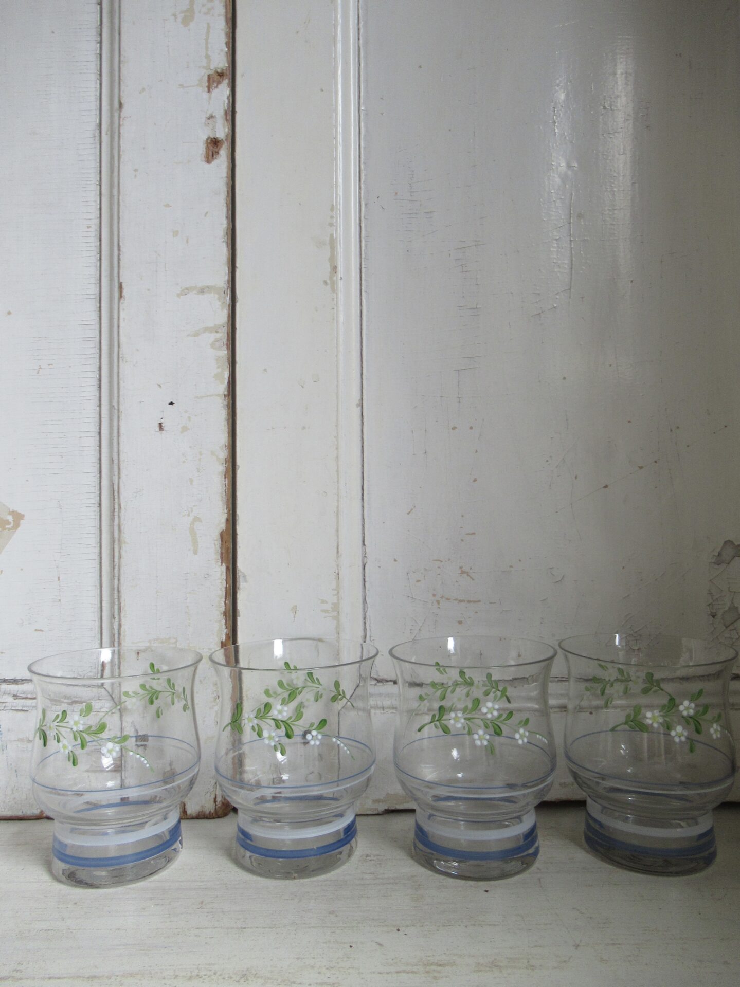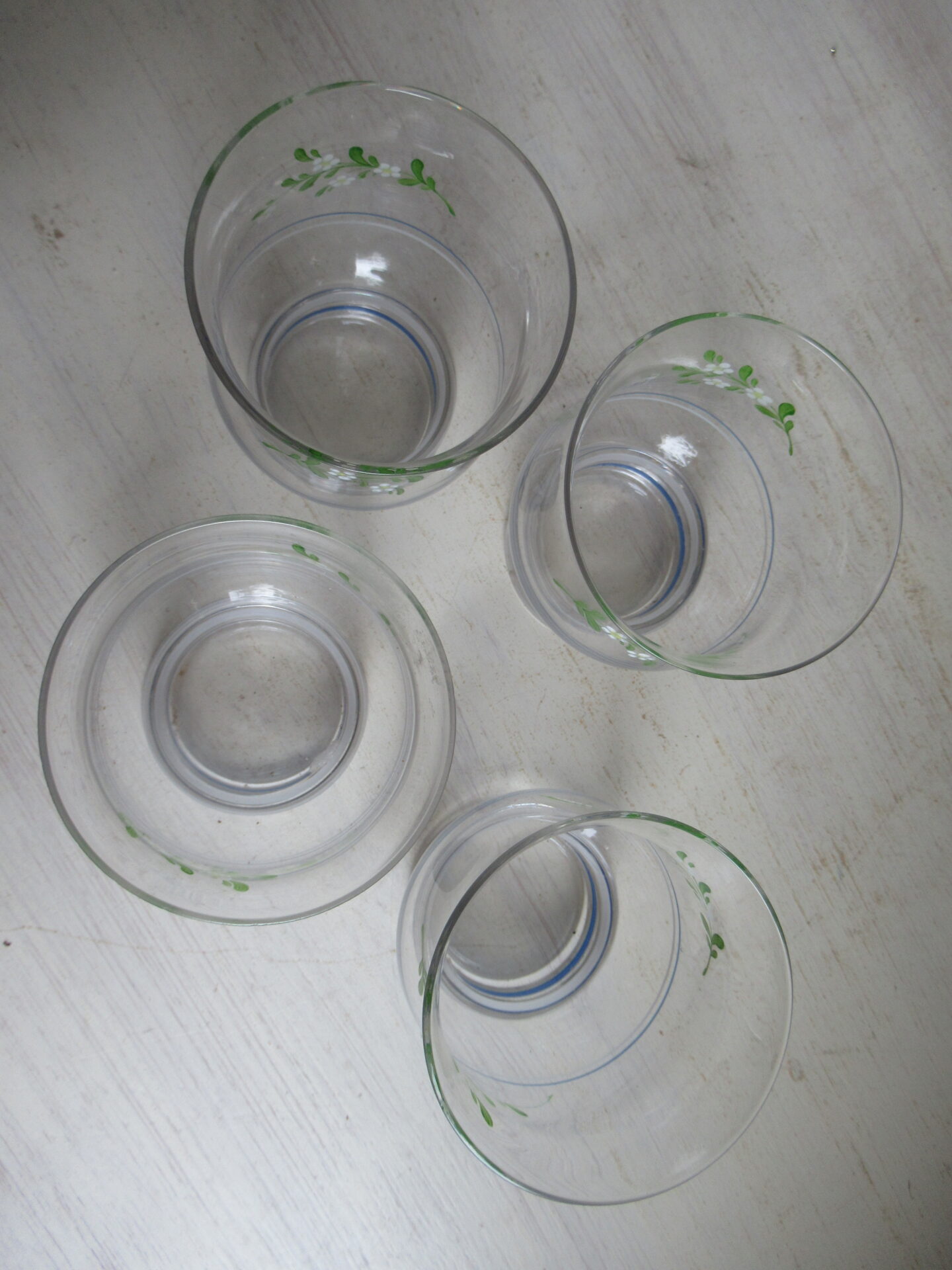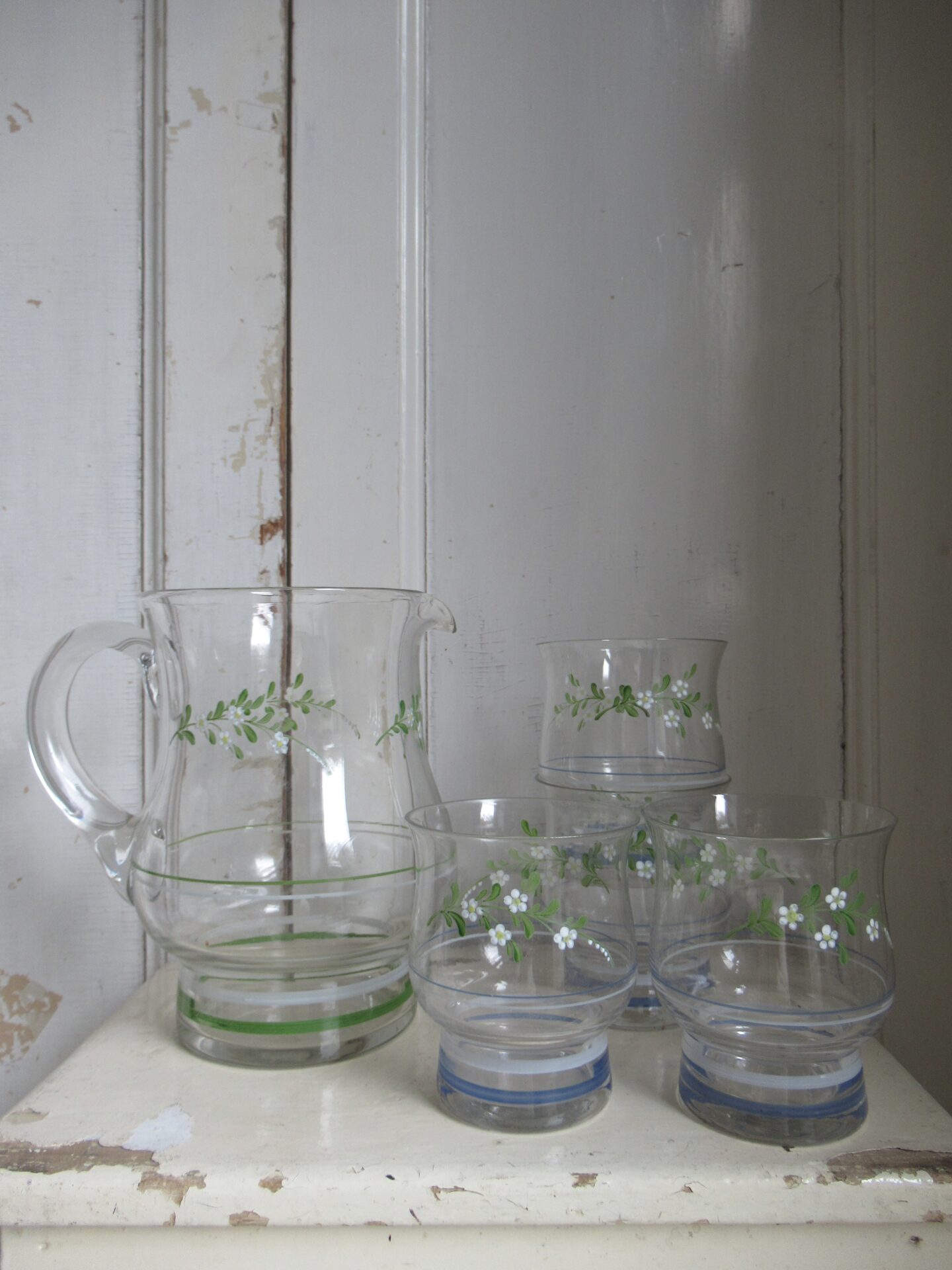 4 oude Franse glazen met bijbehorende kan, blauw-witte en groen-witte streepjes en schattige groene takjes met witte bloemetjes erop geschilderd, setprijs (hoogte kan 18,5 cm, hoogte glazen 10 cm)