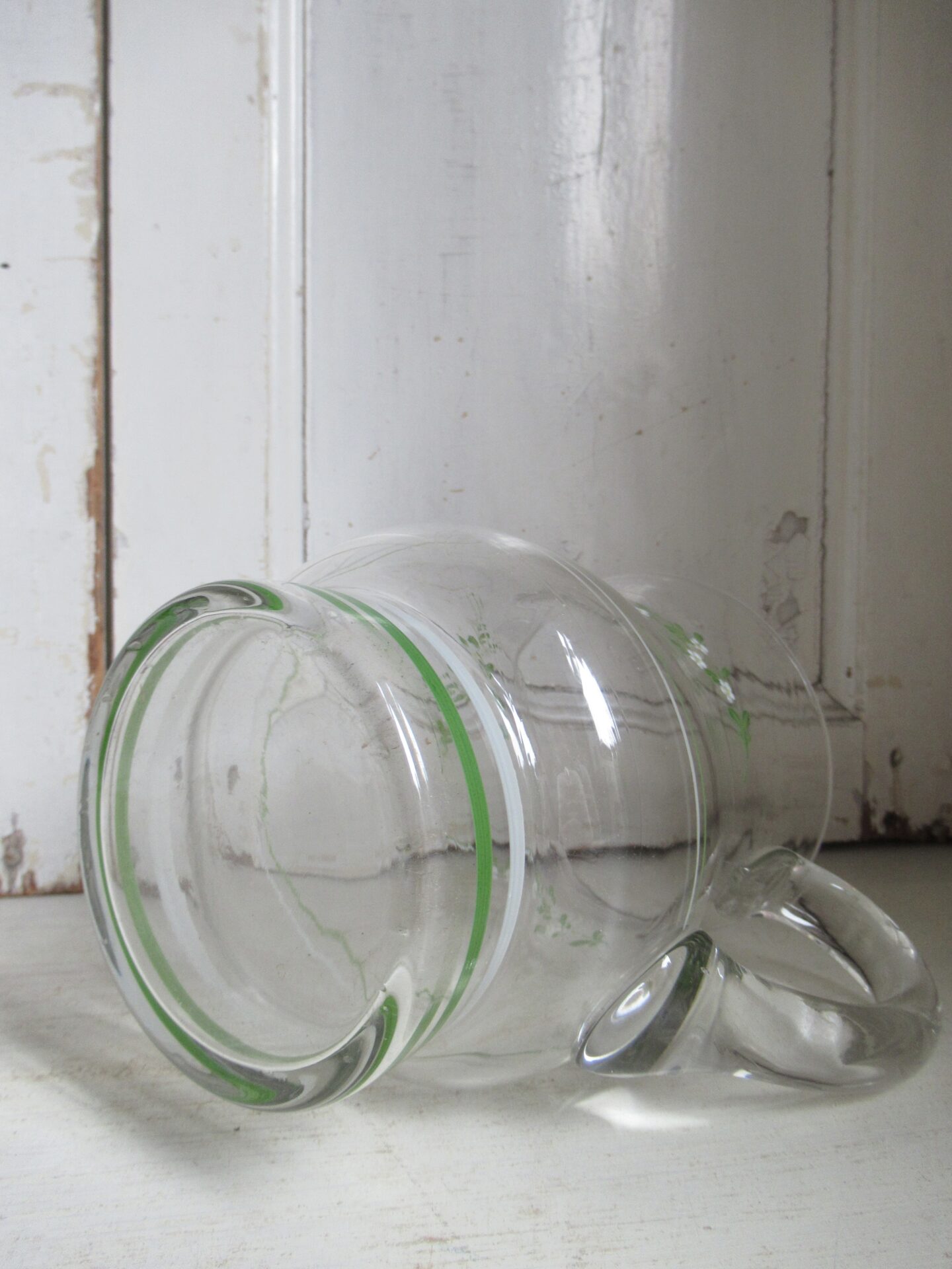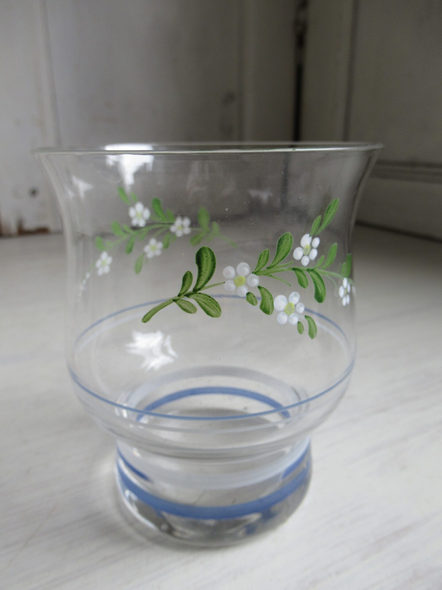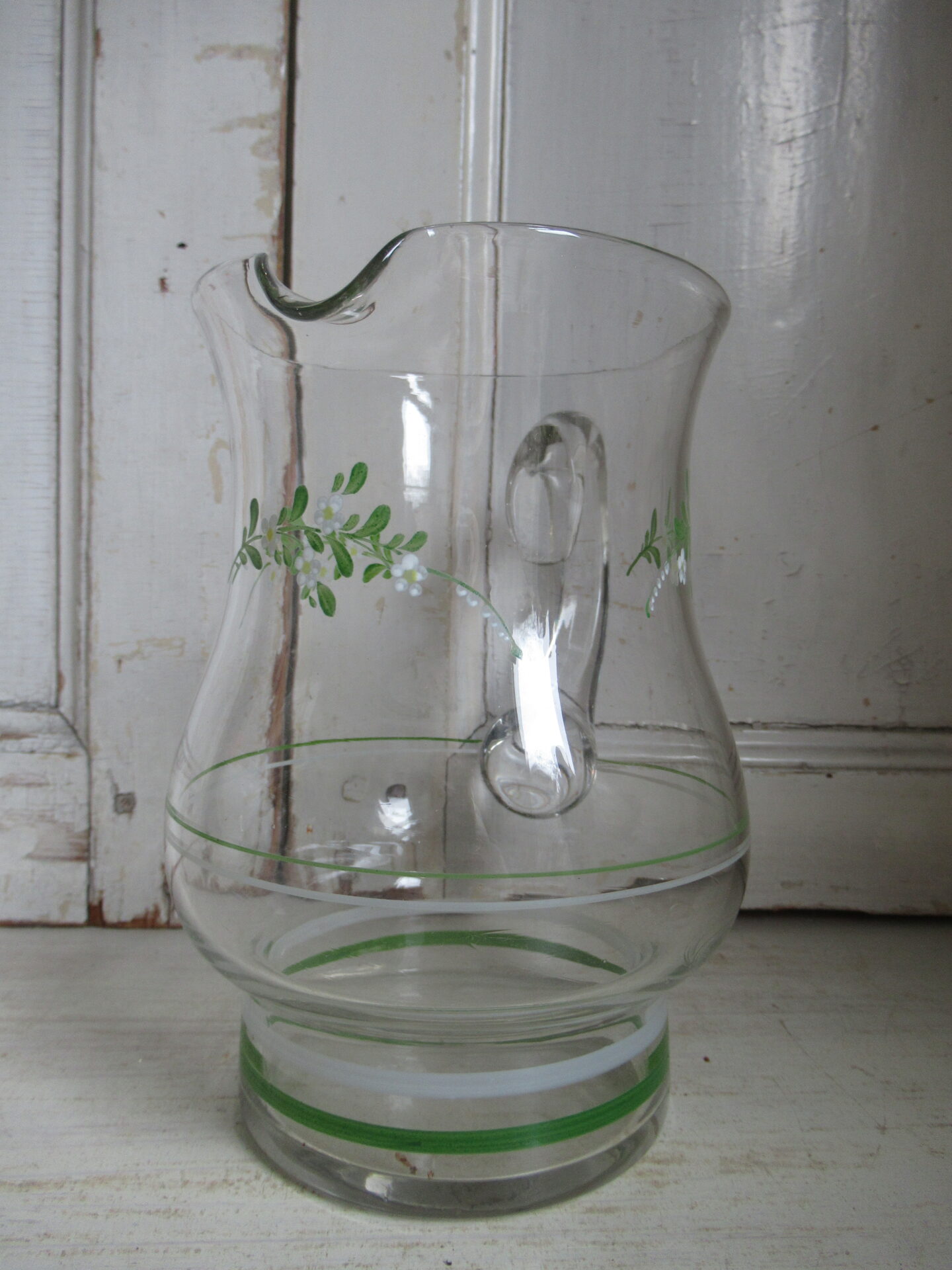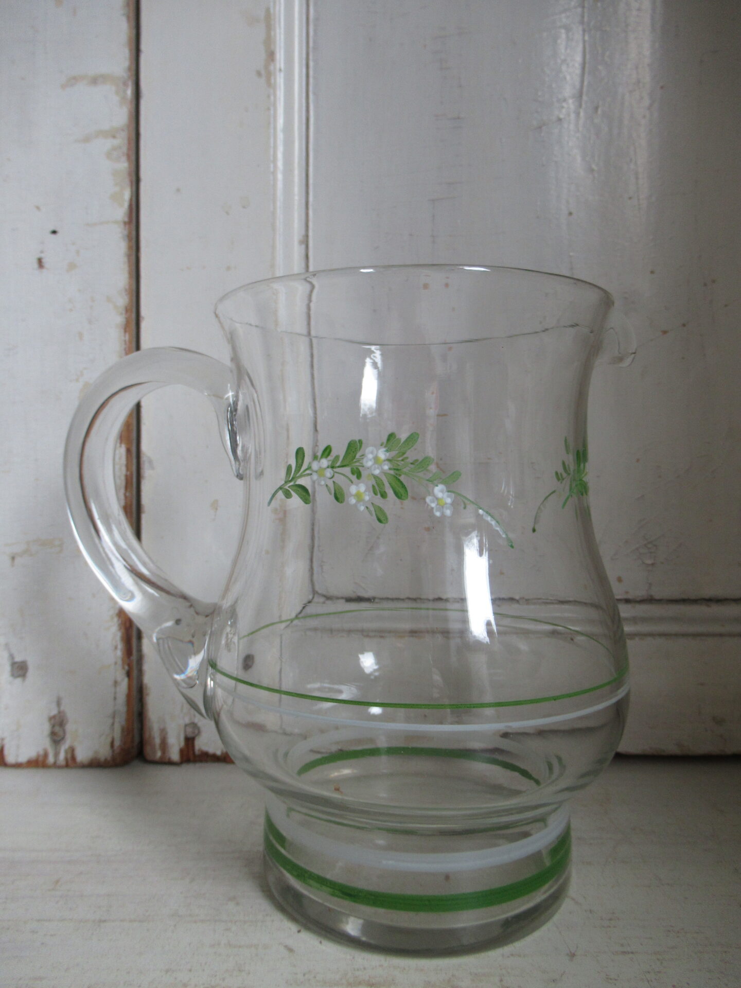 4 oude Franse glazen met bijbehorende kan, blauw-witte en groen-witte streepjes en schattige groene takjes met witte bloemetjes erop geschilderd, setprijs (hoogte kan 18,5 cm, hoogte glazen 10 cm)