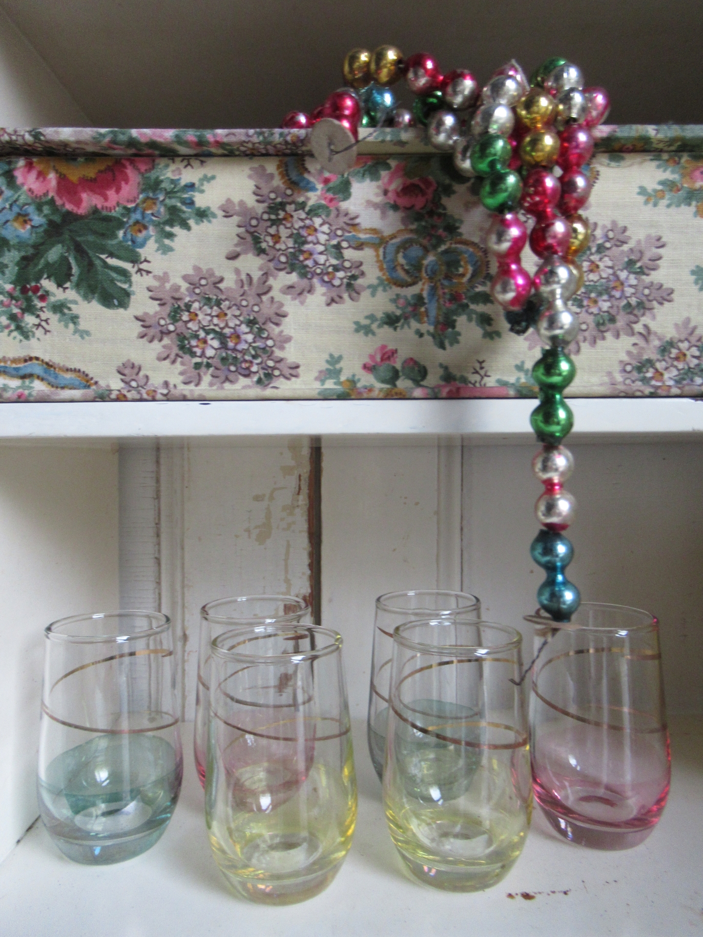 6 oude glaasjes in de originele doos, 1 glaasje heeft een hoekje uit de rand, kan ook een maakfout zijn, niet goed te zien (hoogte glaasjes 6,5 cm)