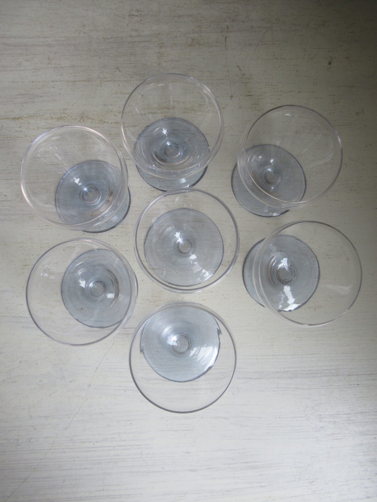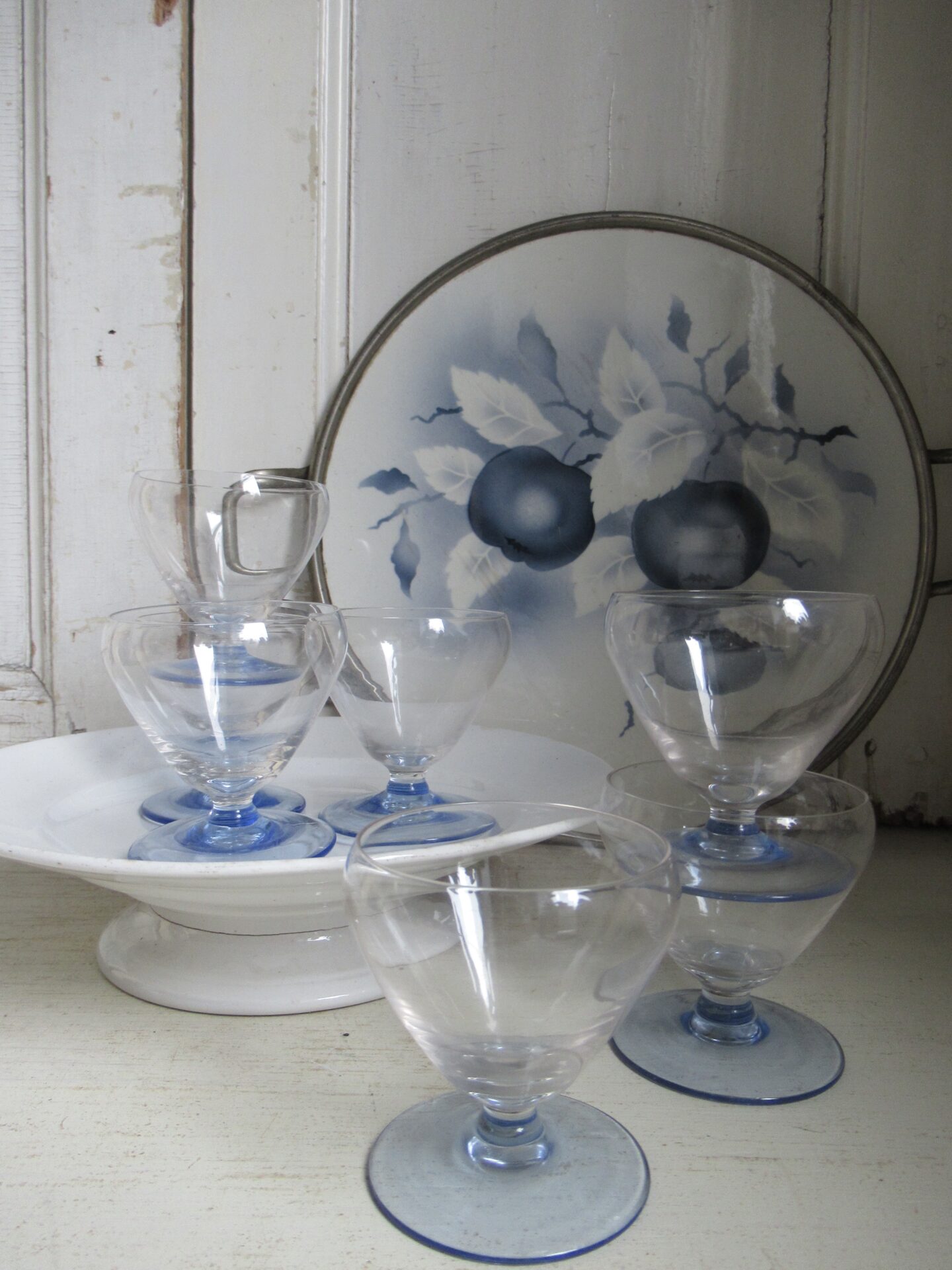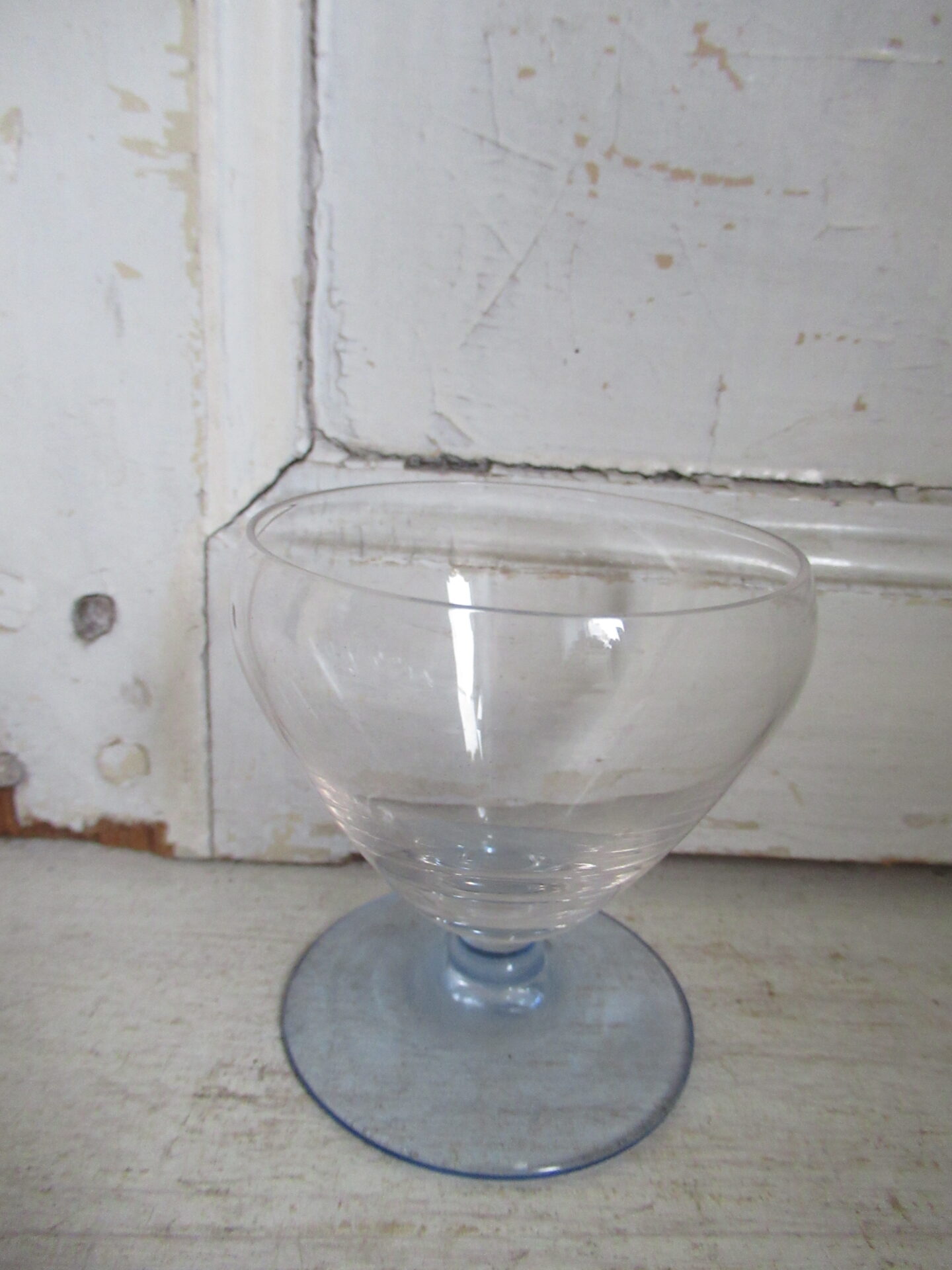 7 mooie oude Franse glaasjes, op blauw glazen voetje, ook leuk om te gebruiken voor een (klein) voorgerechtje, bijvoorbeeld, setprijs (hoogte 7 cm, doorsnede 6,5 cm)