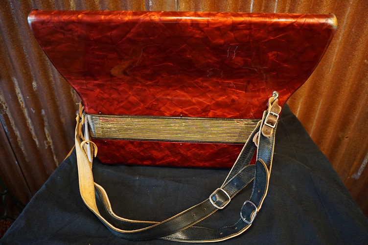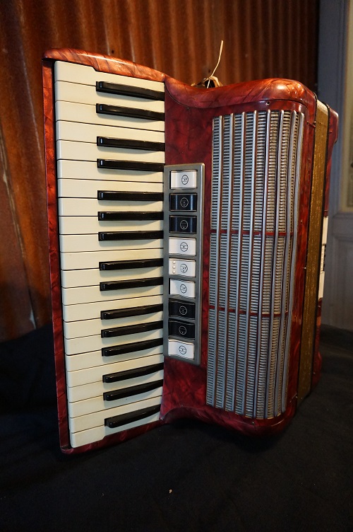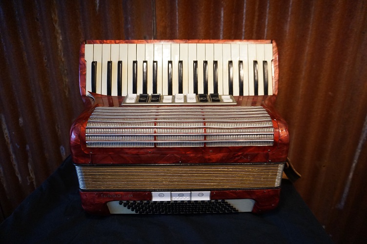 Hohner Tango Iim accordeon in de kleur rood. Klavieraccordeon. 96 bas. In redelijk goede staat. Heeft onderhoud nodig. De afsluitleertjes bovenzijde en onderzijde zijn stuk. De balg is in goede staat. De accordeon wordt geleverd met vintage koffer. Afmeting: 50 cm hoog, 40 cm breed en ongeveer 25 cm diep.