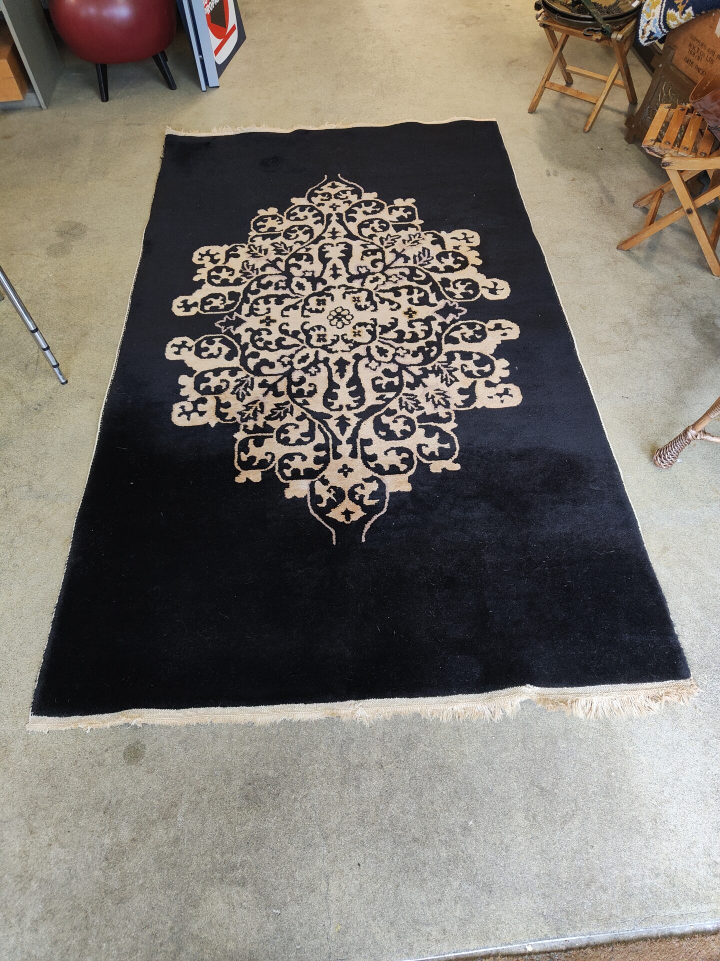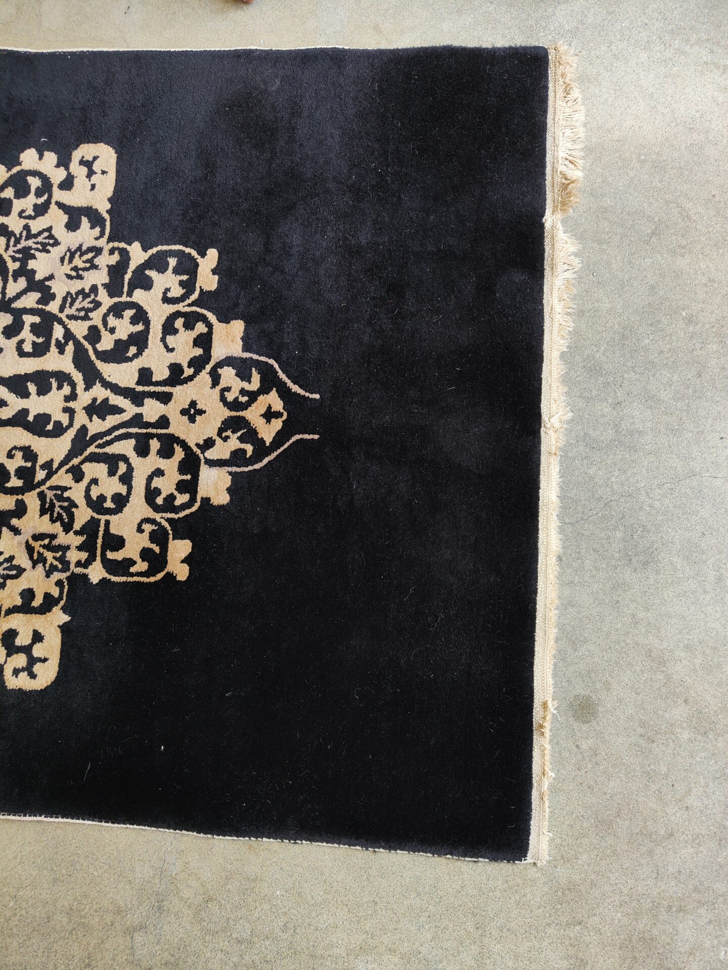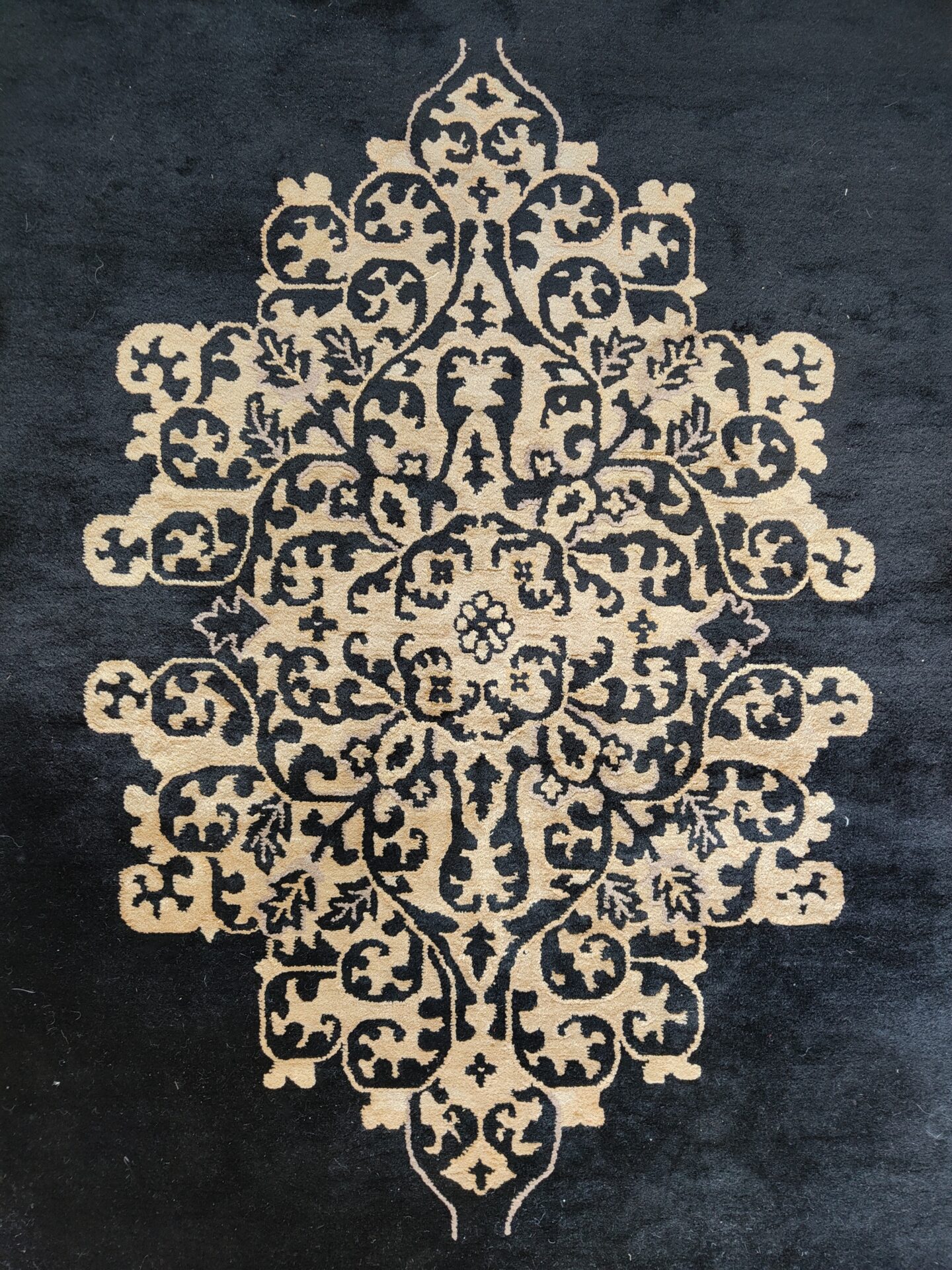 Bijzonder antiek vintage Art Deco vloerkleed uit de jaren ’20. Meer dan honderd jaar oud en in goede staat. Materiaal is wol en is zeer dicht met de hand geweven. Gemaakt in China. De kleur is zwart met een crème kleurig motief in het midden van het kleed. Het kleed verkeerd in zeer goede staat en heeft geen slijtplekken.