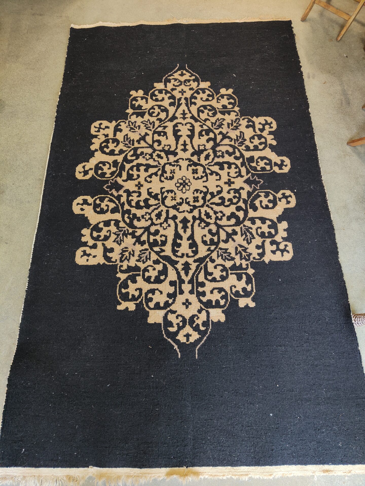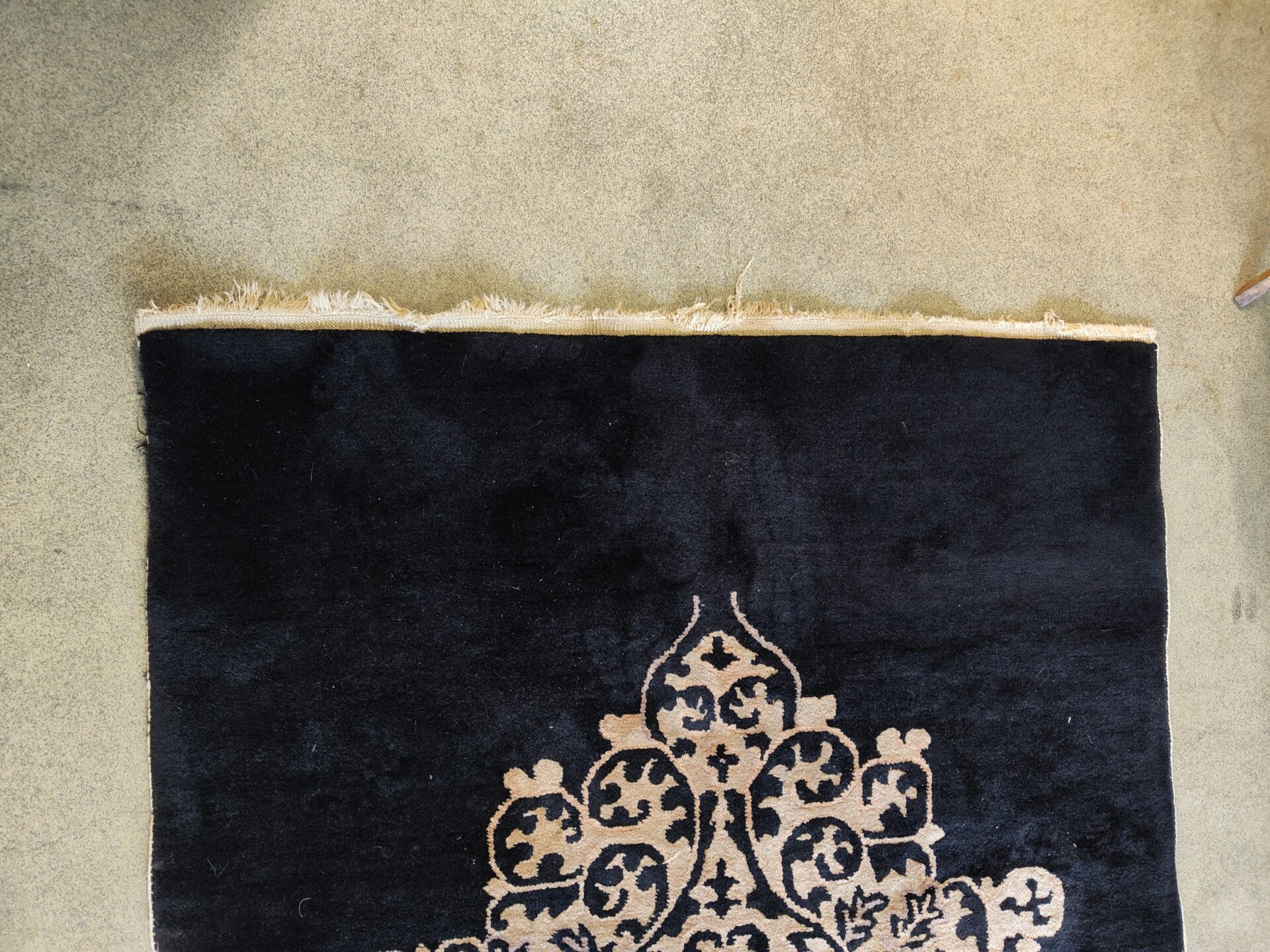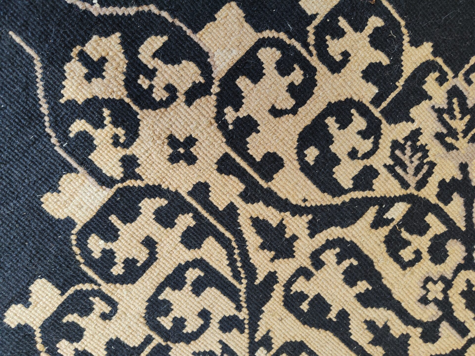 Bijzonder antiek vintage Art Deco vloerkleed uit de jaren ’20. Meer dan honderd jaar oud en in goede staat. Materiaal is wol en is zeer dicht met de hand geweven. Gemaakt in China. De kleur is zwart met een crème kleurig motief in het midden van het kleed. Het kleed verkeerd in zeer goede staat en heeft geen slijtplekken.