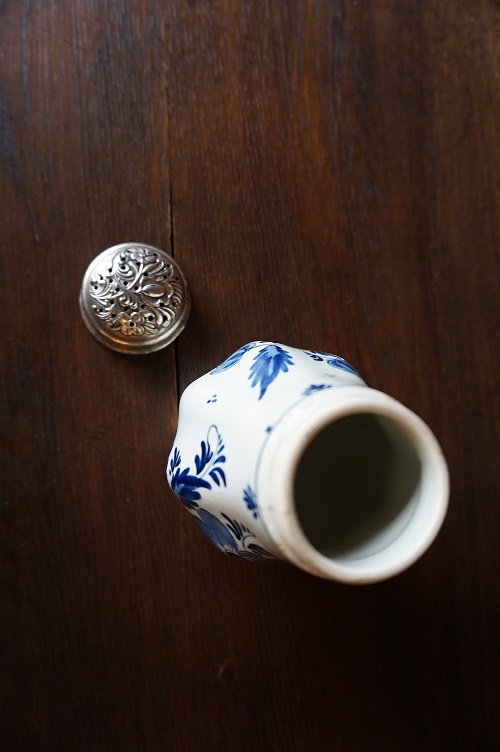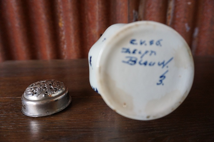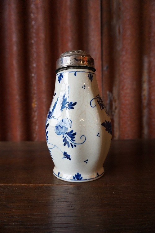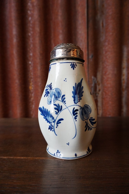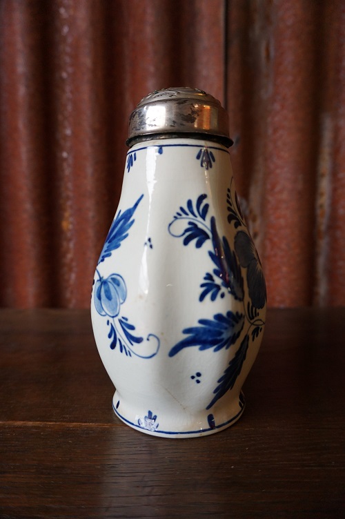 Antieke Delfts Blauwe strooibus met zilveren dop