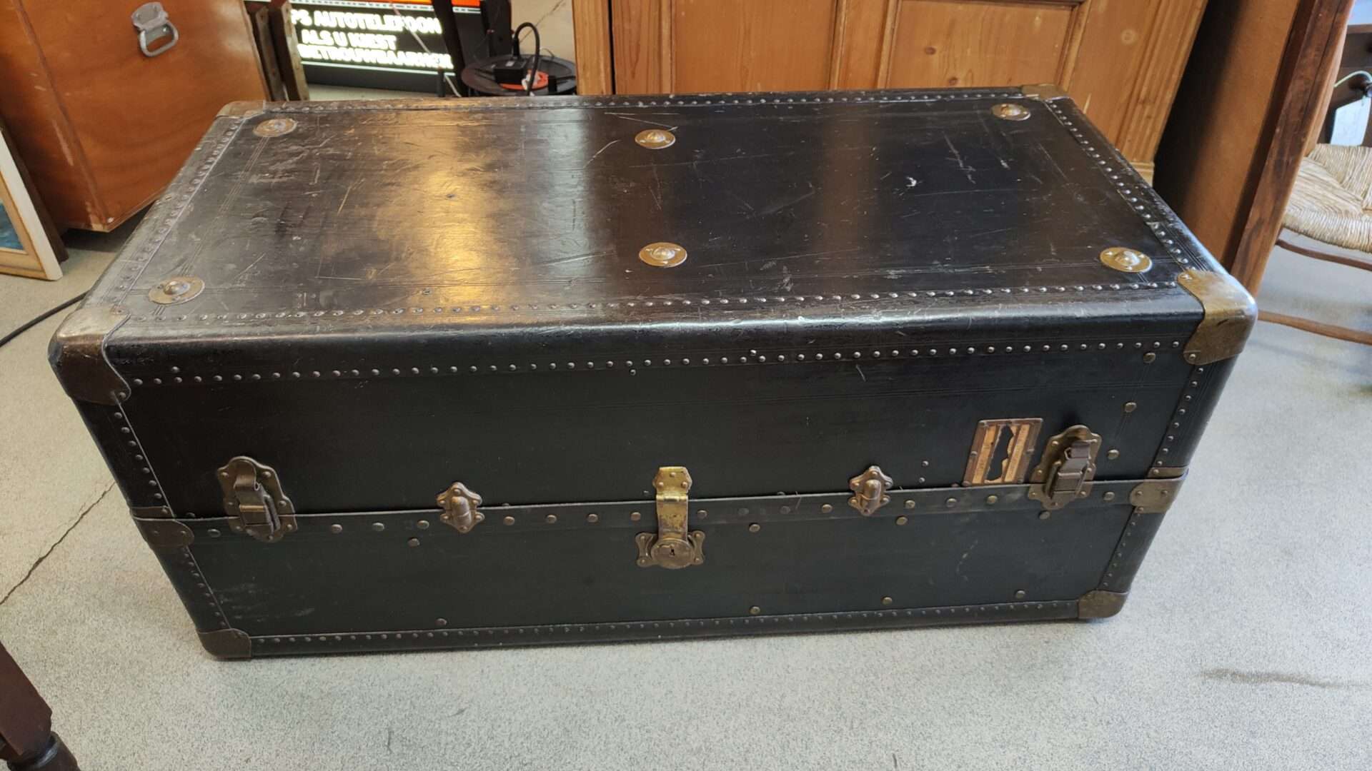 De kist is meer dan 100 jaar oud, maar verkeert in goede staat. De koffer is zwart leder afgezet met nagels, scharnieren en sloten. Aan de binnenzijde zitten lades met spanbanden, een hanggedeelte wat naar buiten kan worden getrokken, zakjes voor sokken e.d. en 2 open vakken.