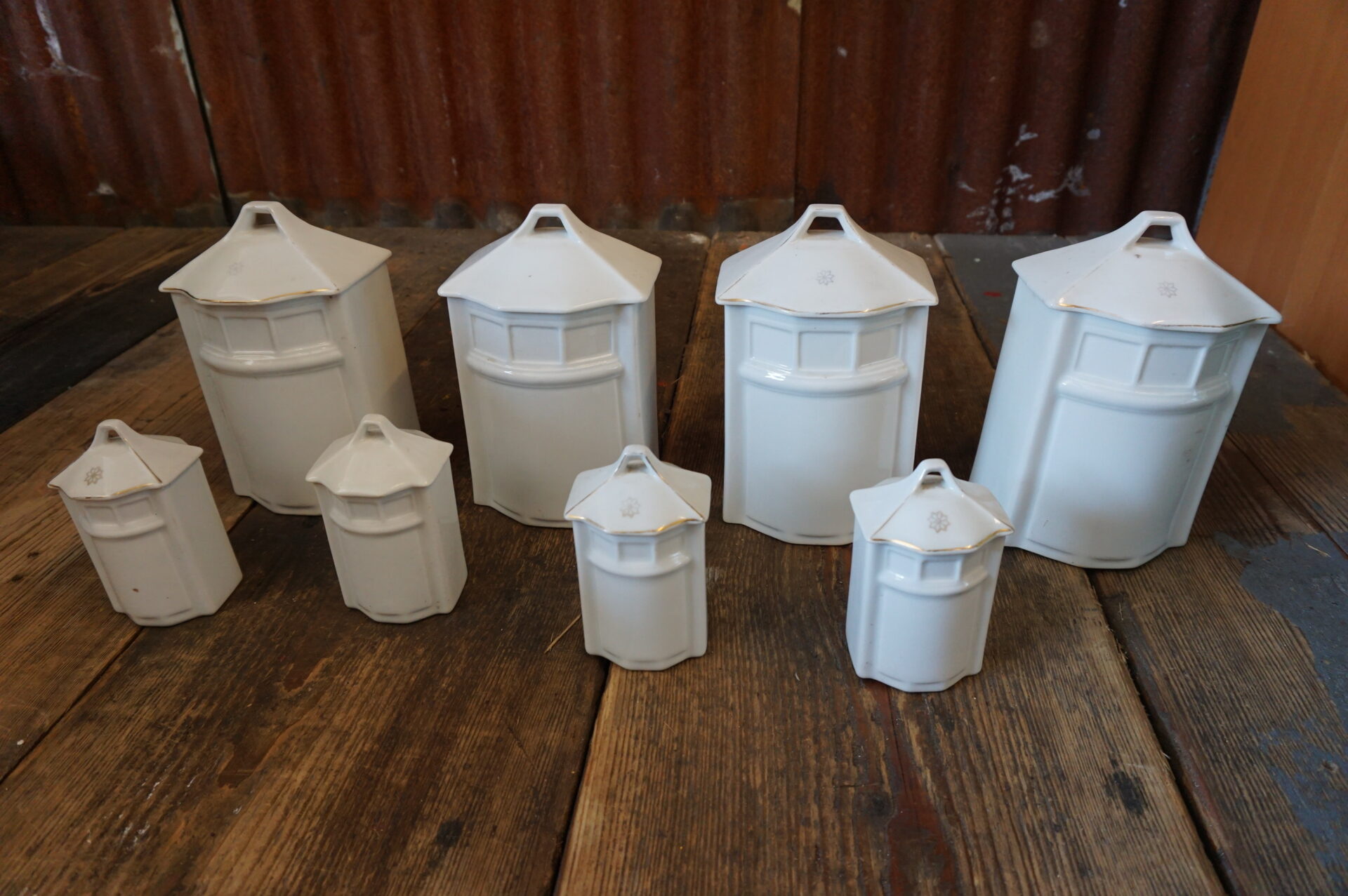Antieke porseleinen voorraadpoteen/kruidenpotten met Nederlandse tekst. Art Deco. In goede staat. 8-delig, 4 grote en 4 klein potten. Gemerkt op met bloem. De foto’s spreken voor zich. Afmeting grote pot ongeveer 12.5 cm breed, 11.5 cm diep en 20 cm hoog. Afmeting kleine potje: ongeveer 7 cm breed, 6.5 cm diep en 12 cm hoog.