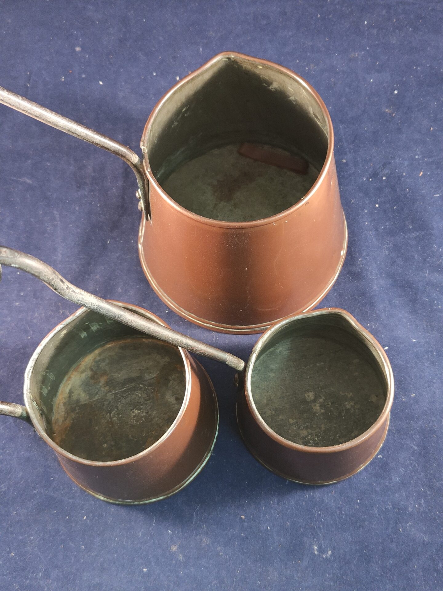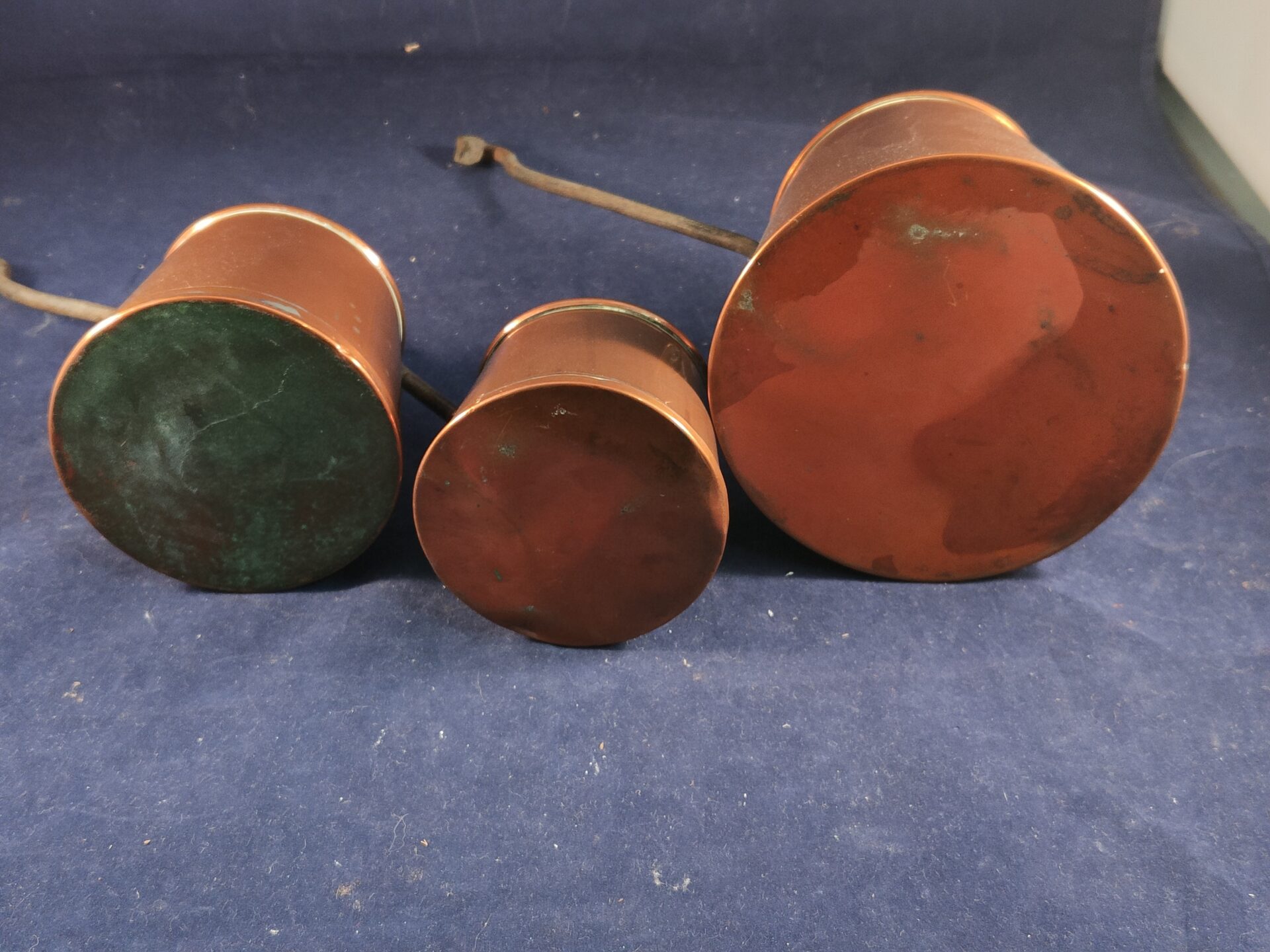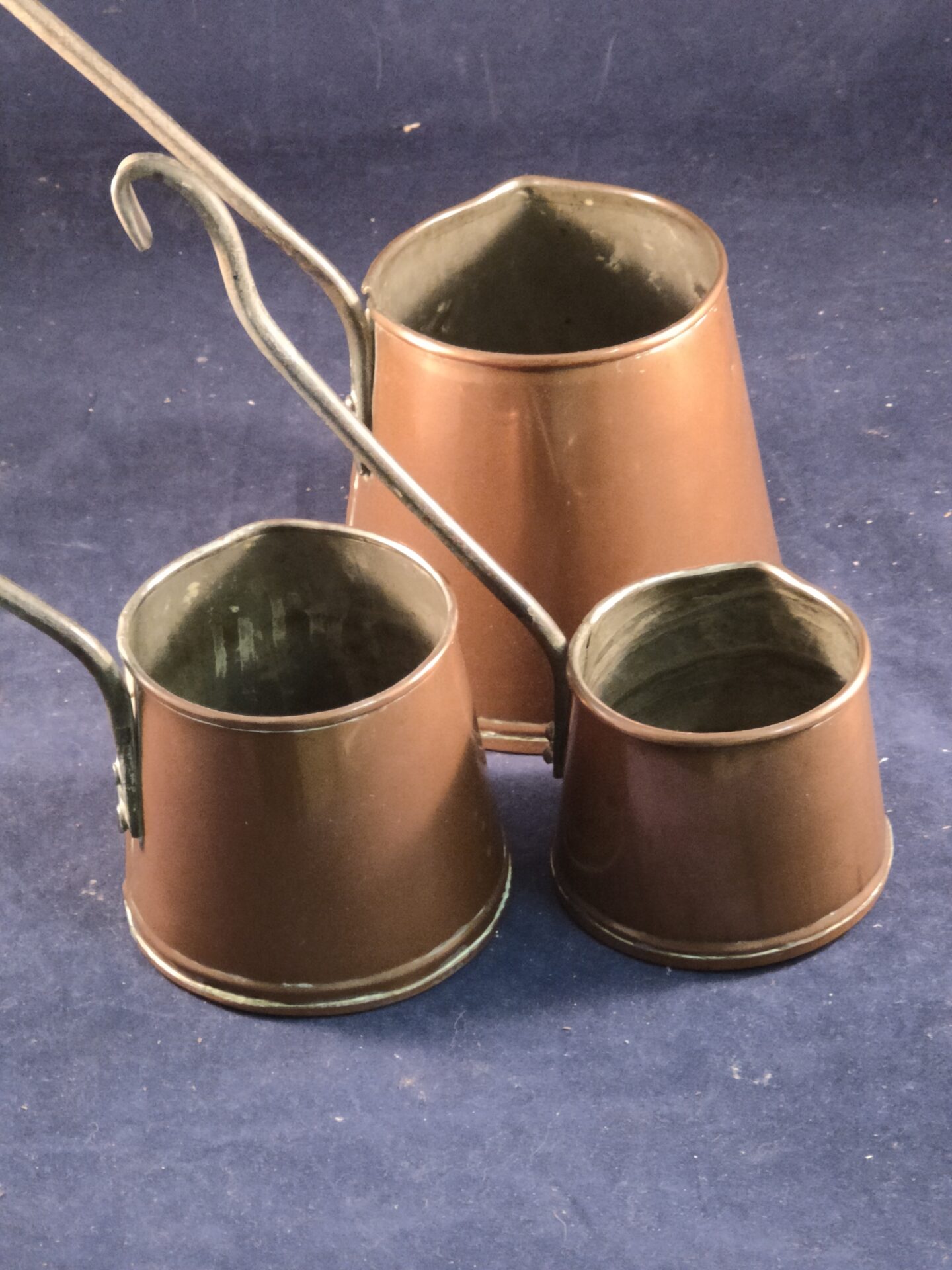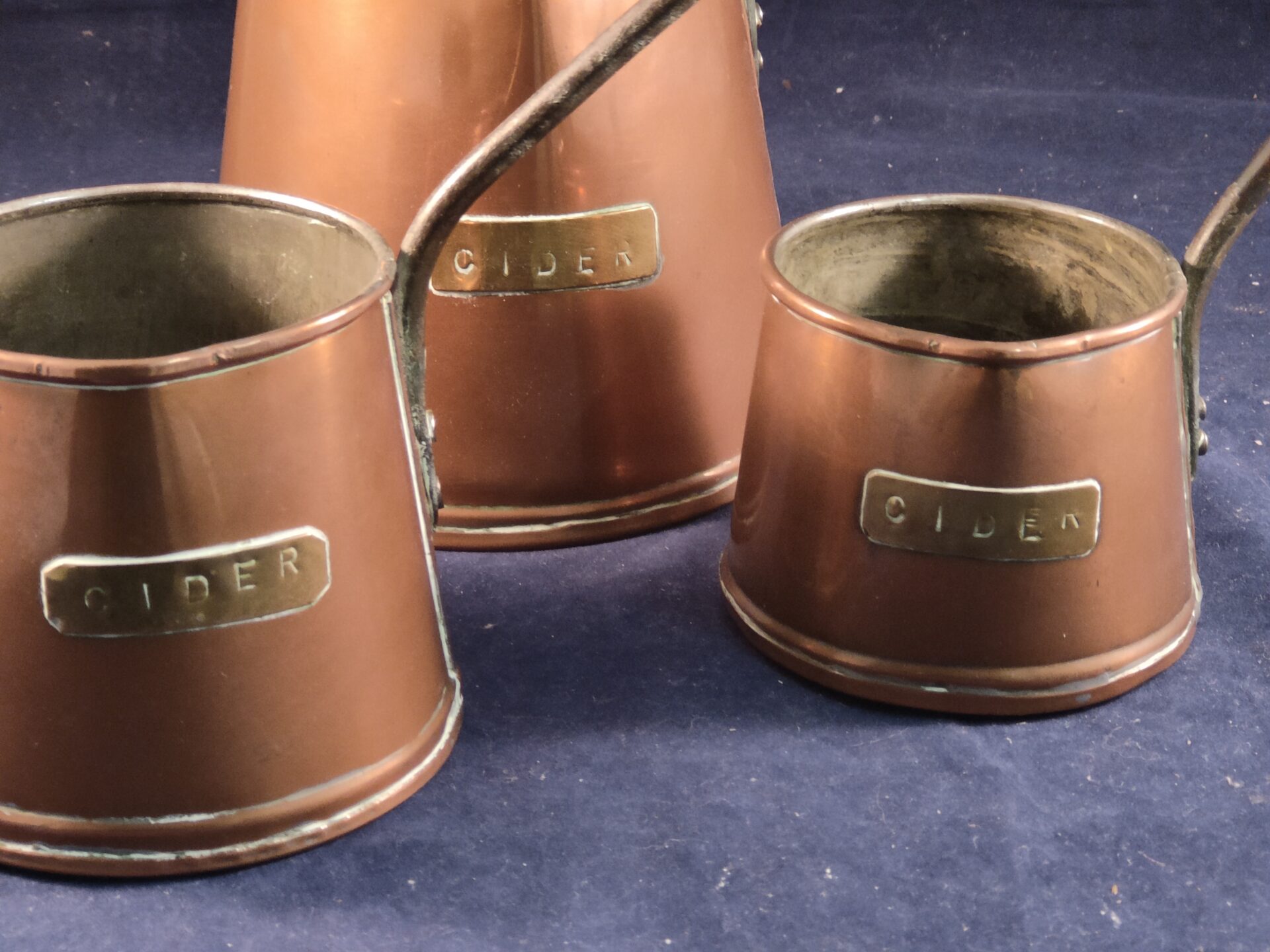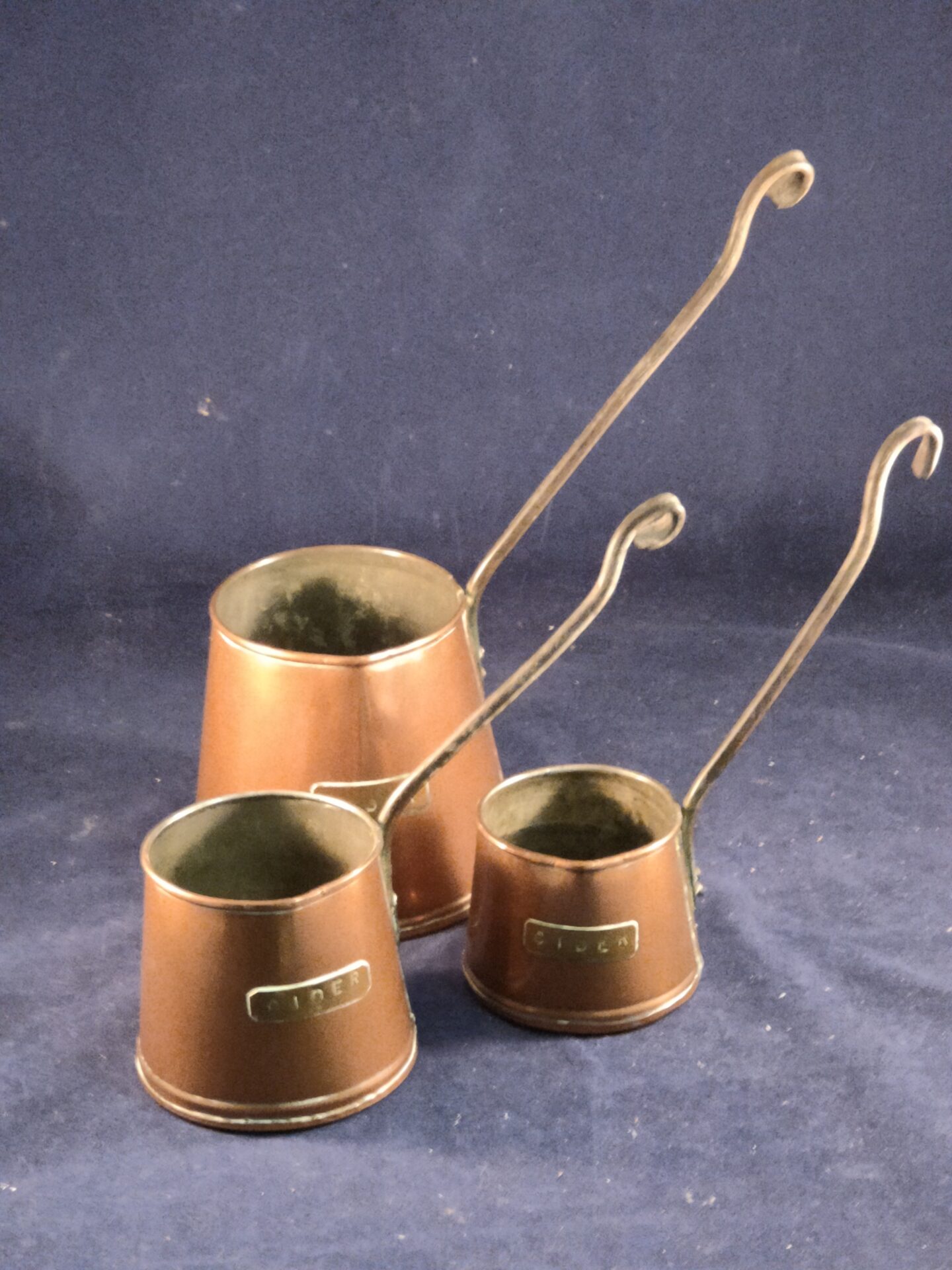 Drie koperen cider maatbekers met metalen hangstelen. Antiek. In goede staat. Leuk ter decoratie.