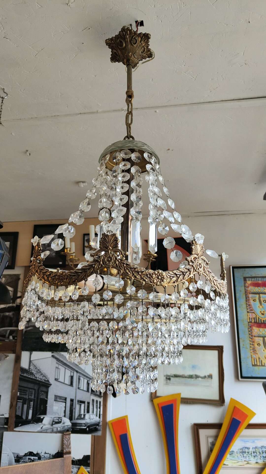 Antieke kristallen kroonluchter, vaak een zakkroon genoemd vanwege de vorm waarin de kristallen pegels aan de onderzijde zijn geregen.