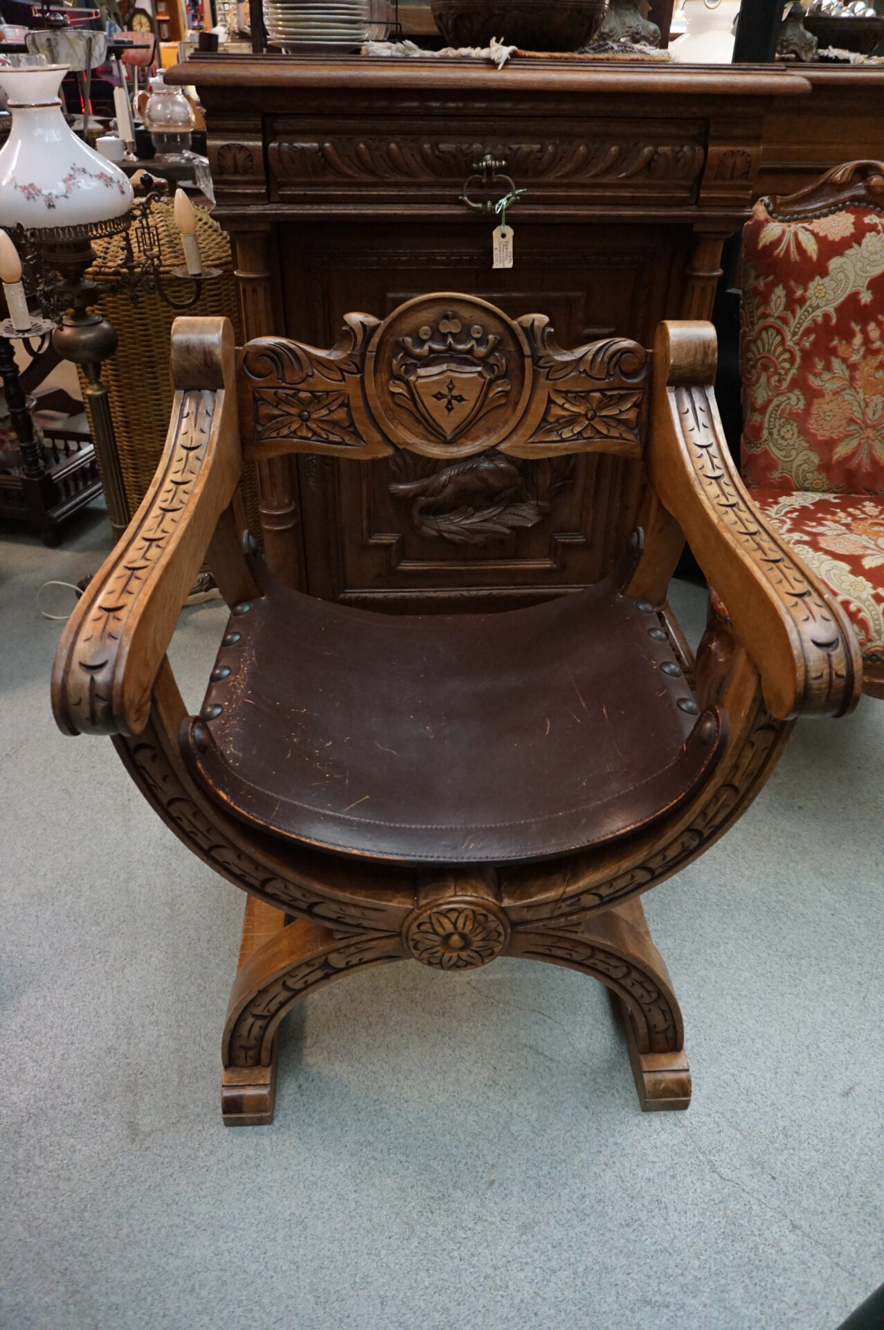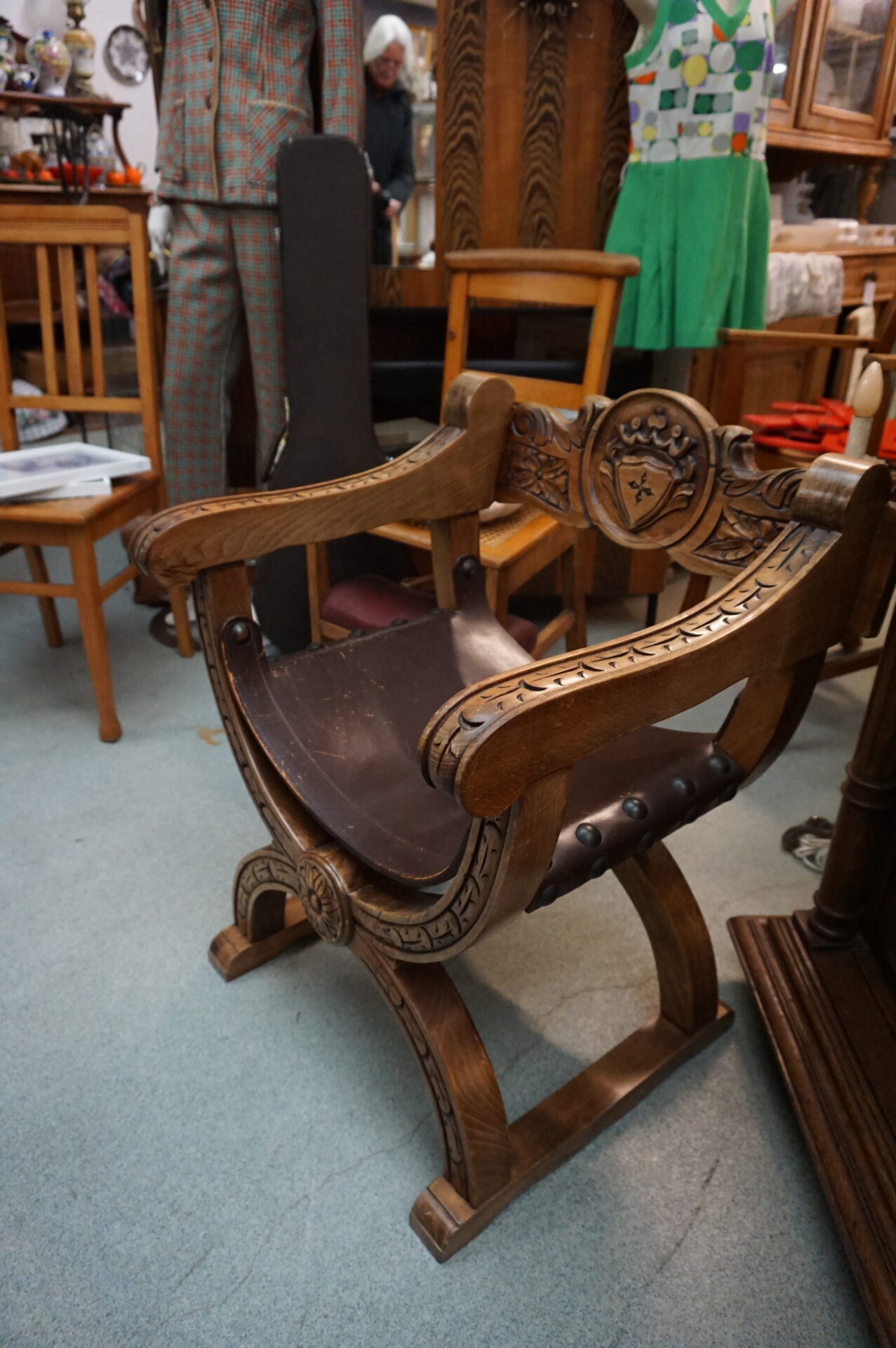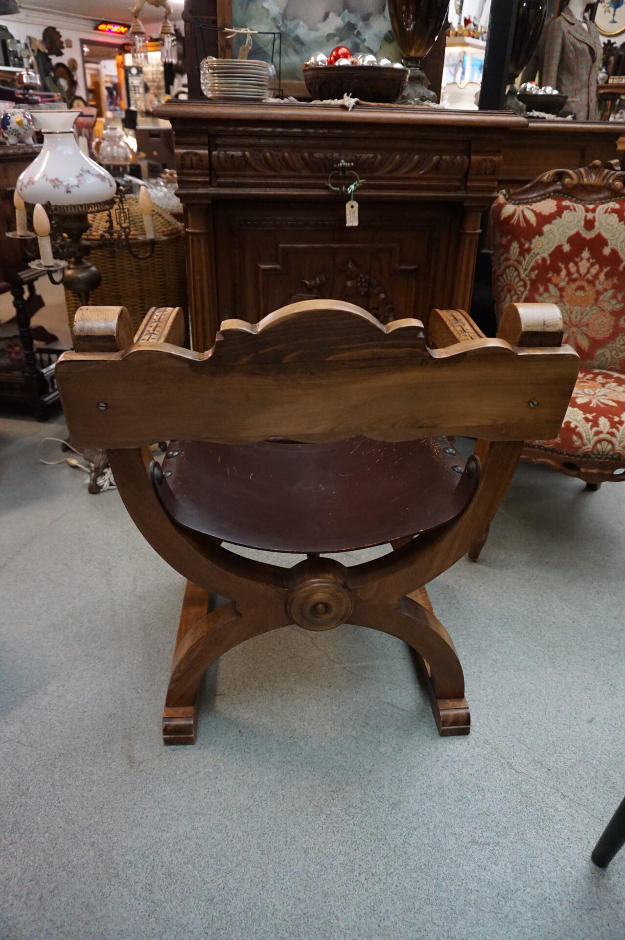 Antieke troonstoel Spaanse stijl. Hout met leren zitting. Ook wel Dagobert stoel, Curulische zetel or Renaissance fauteuil genoemd.
