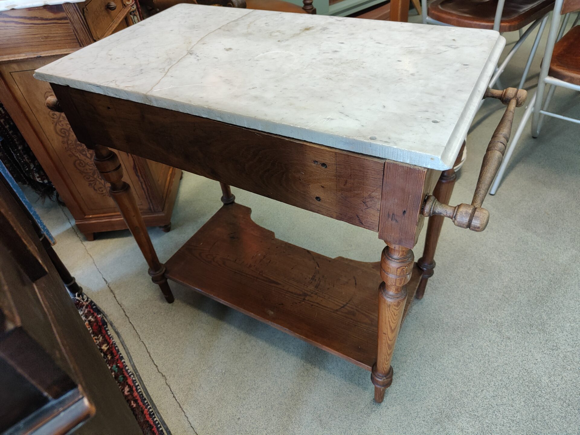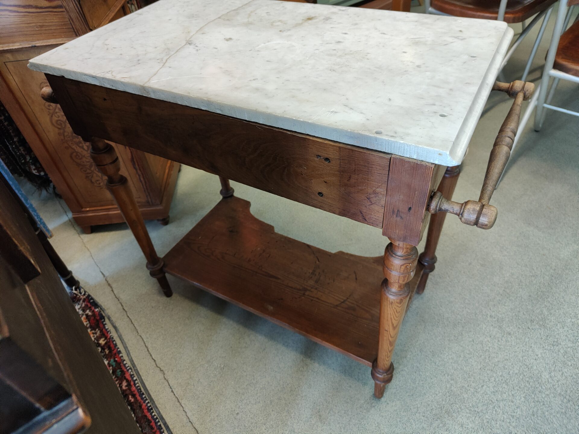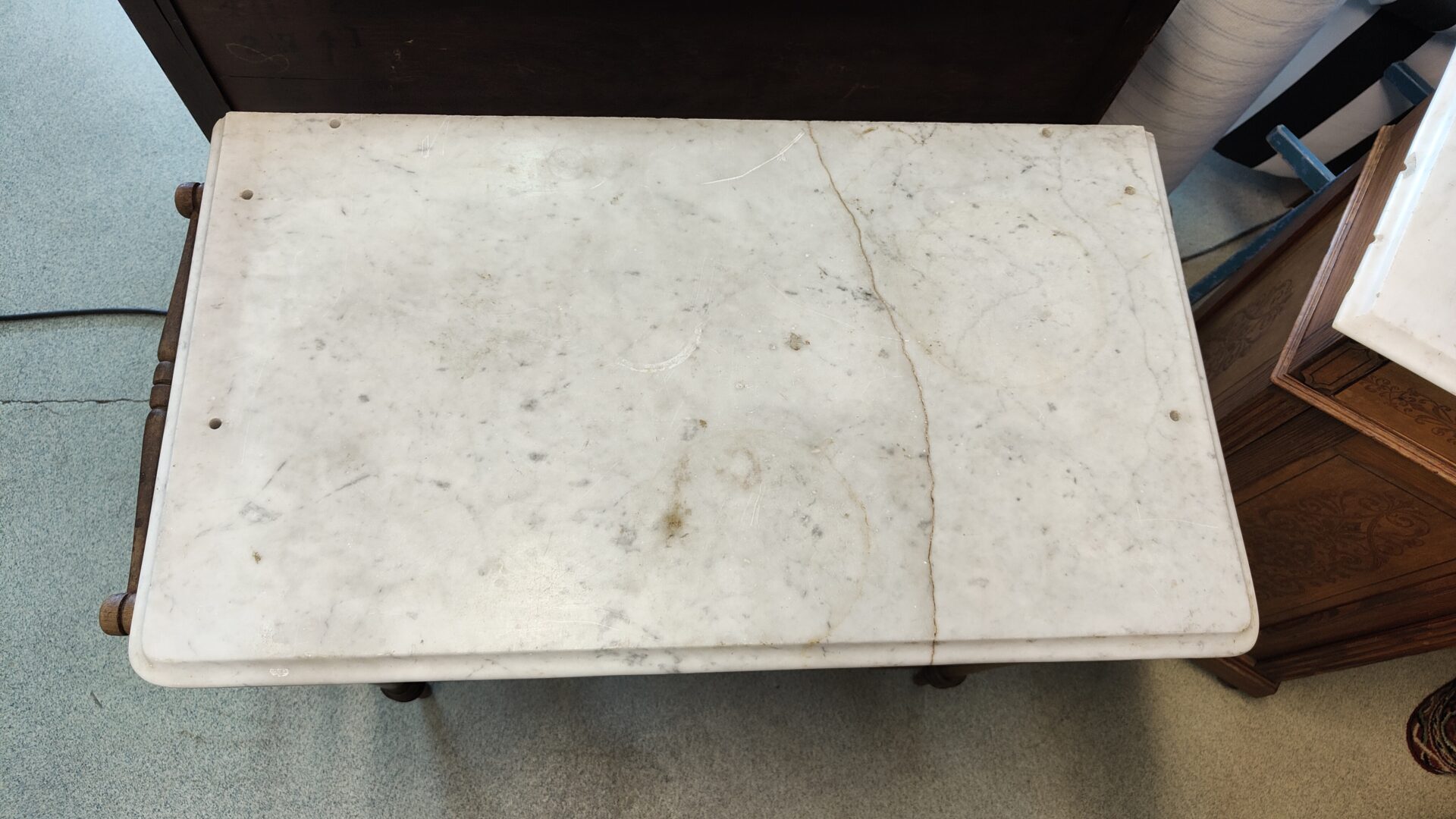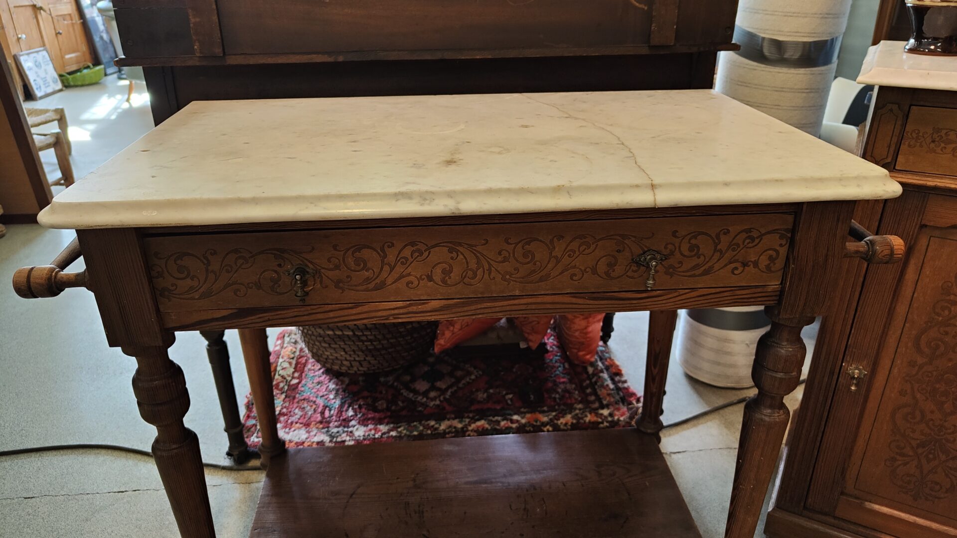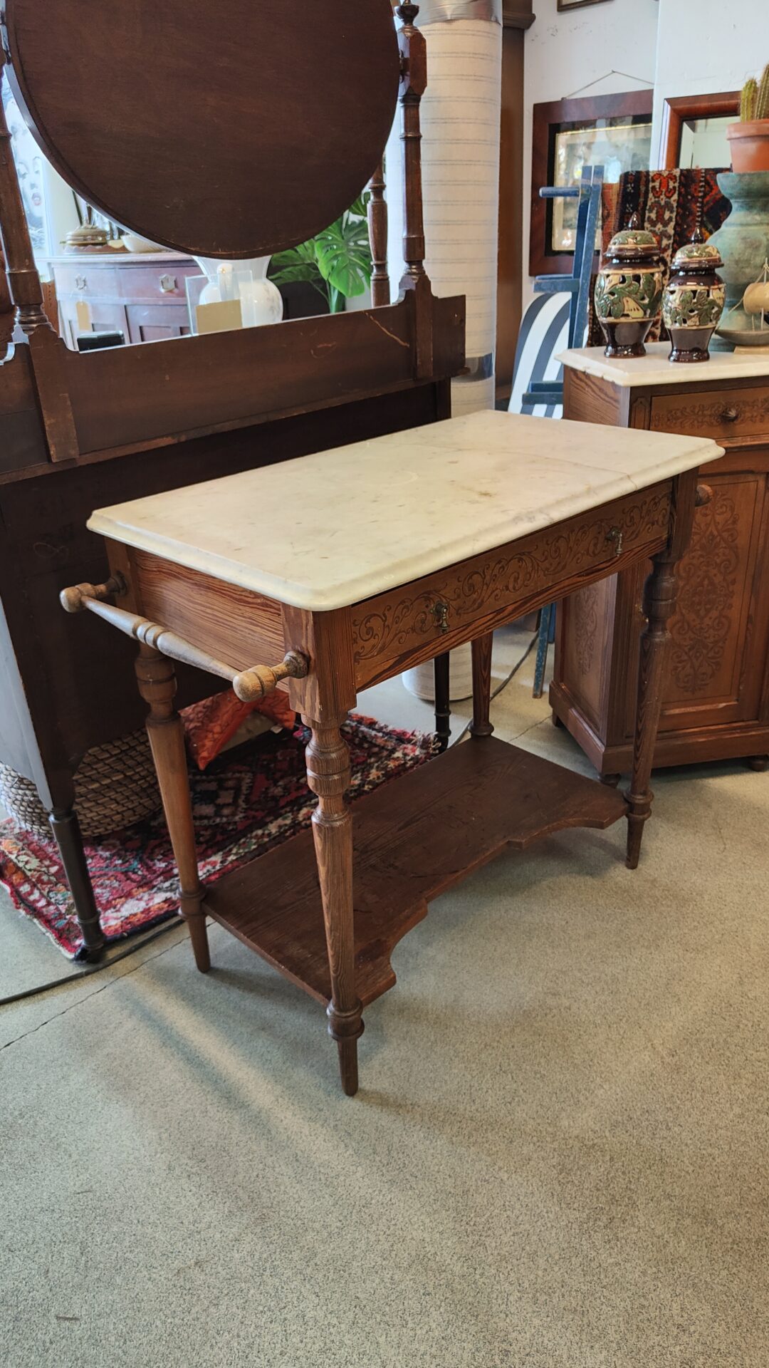 Een wastafel/commode met marmerblad. Beide versierd door mooi houtwerksnijwerk. De tafel heeft 1 lade, een bodemplaat en aan beide zijde een handdoekstang.