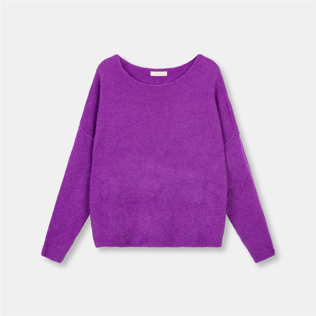 Paarse Mohair Trui van Beauregard in de kleur Violla, heeft een boothals en lange mouwen. Op de mouwen en op het achterpand loopt een zoom, als speels detail.