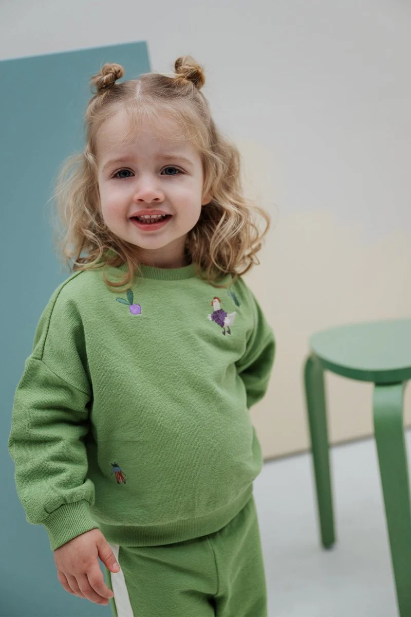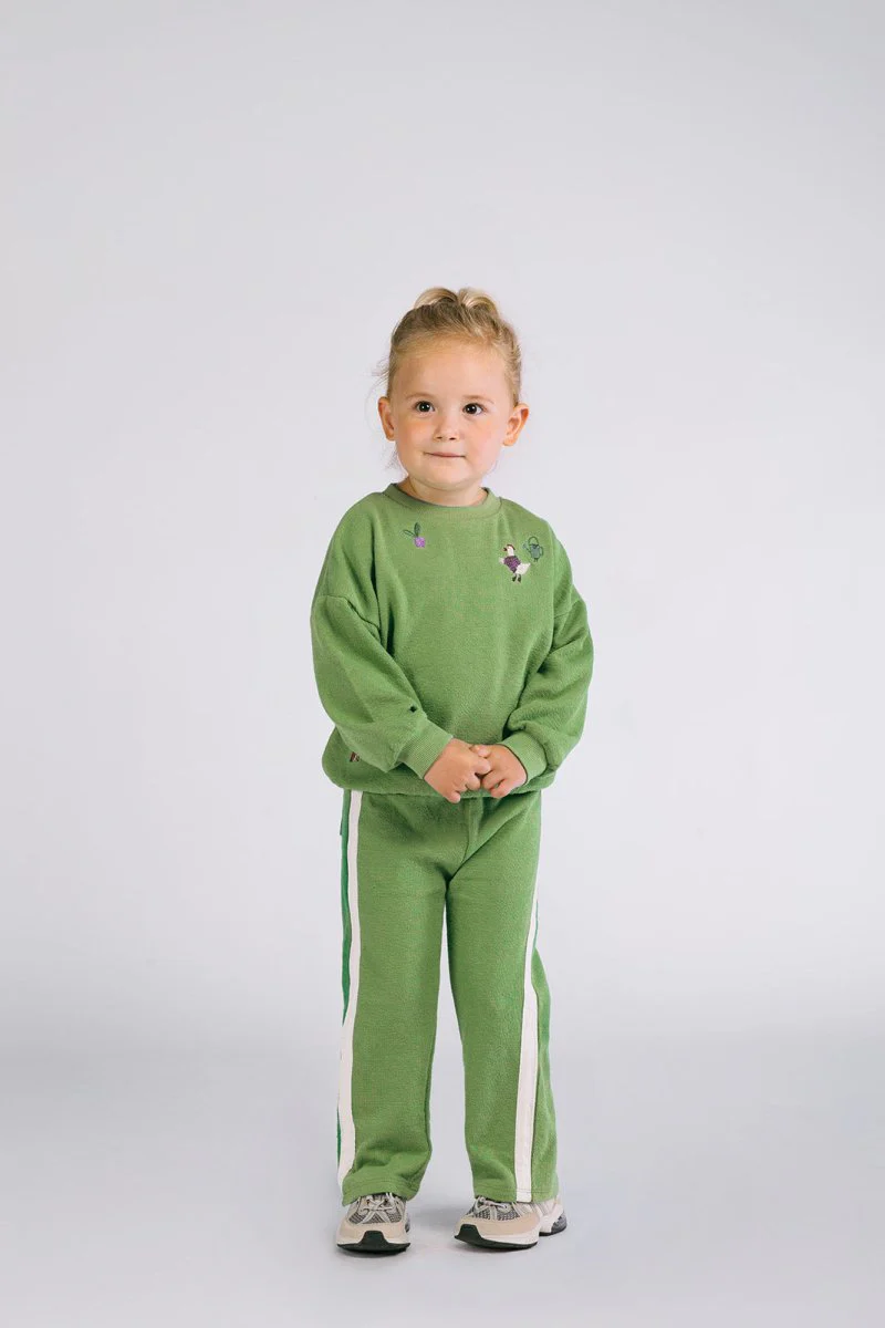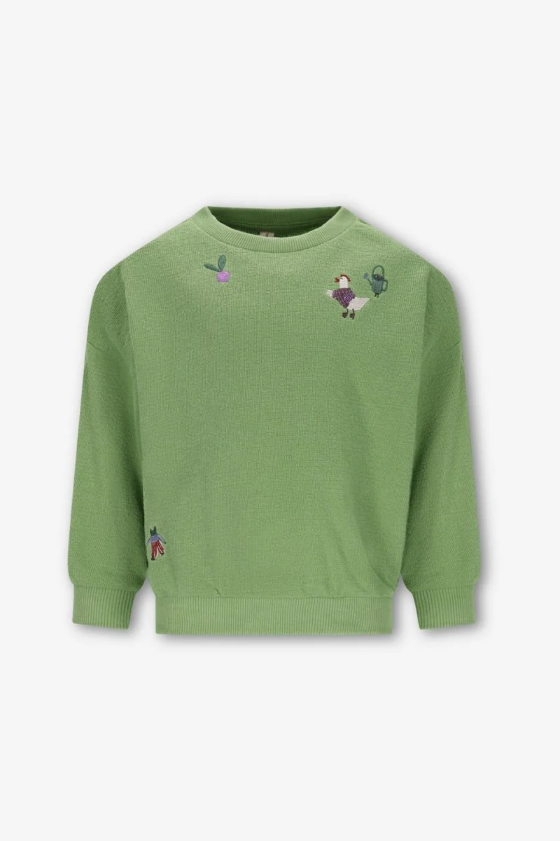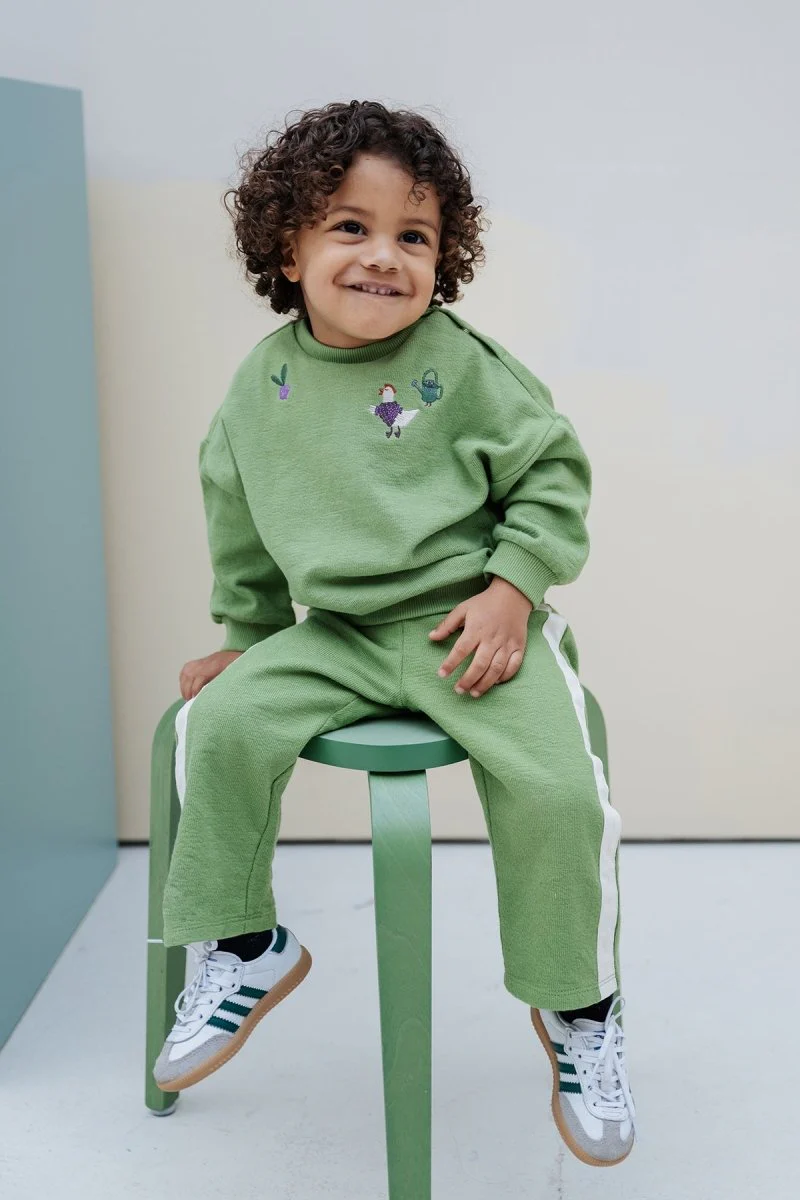 Deze groene Billie sweater is gemaakt van een zachte structuur sweatstof. De Billie is versierd met vier kleine borduurtjes: een kikker, een kip, een gieter en een bietje. Subtiel en toch vol karakter – net als je mini. De relaxte fit en comfy stof maken ‘m perfect voor elke dag. Dit chapter is in samenwerking met @anouskaband. Duurzaam gemaakt.