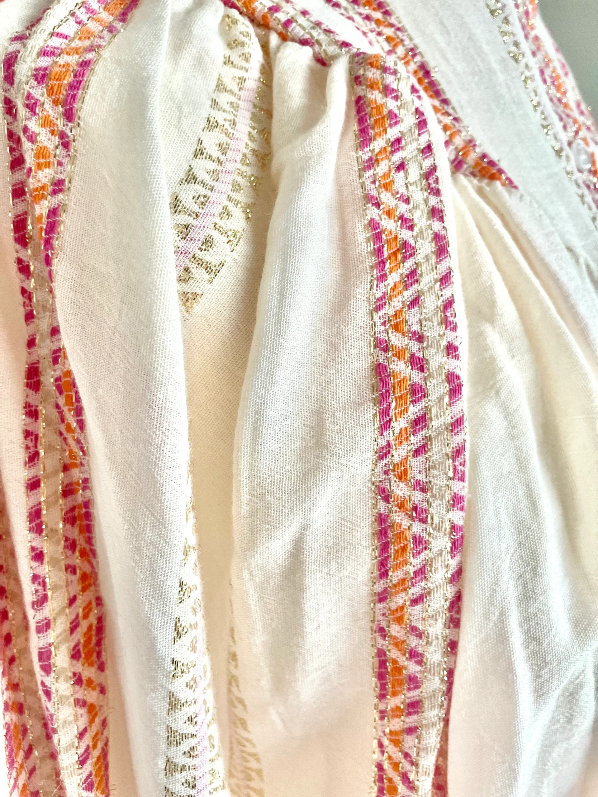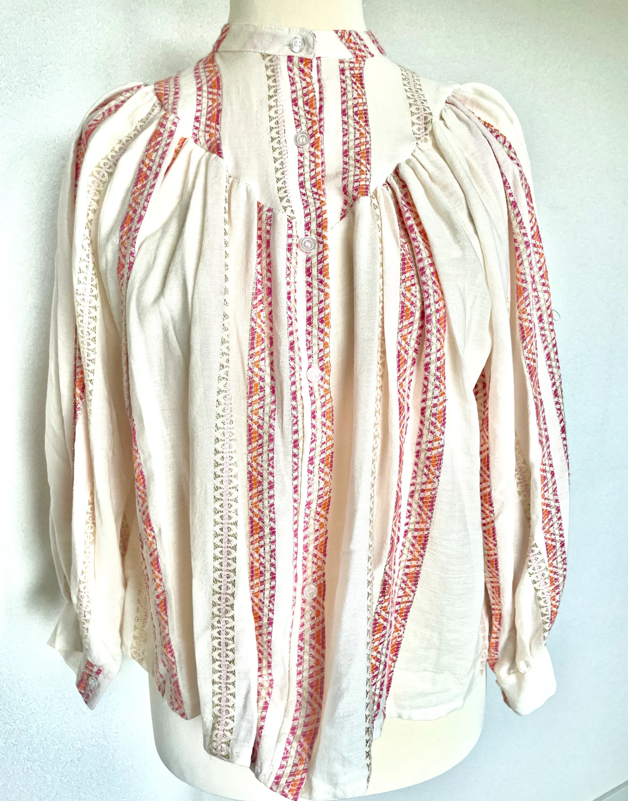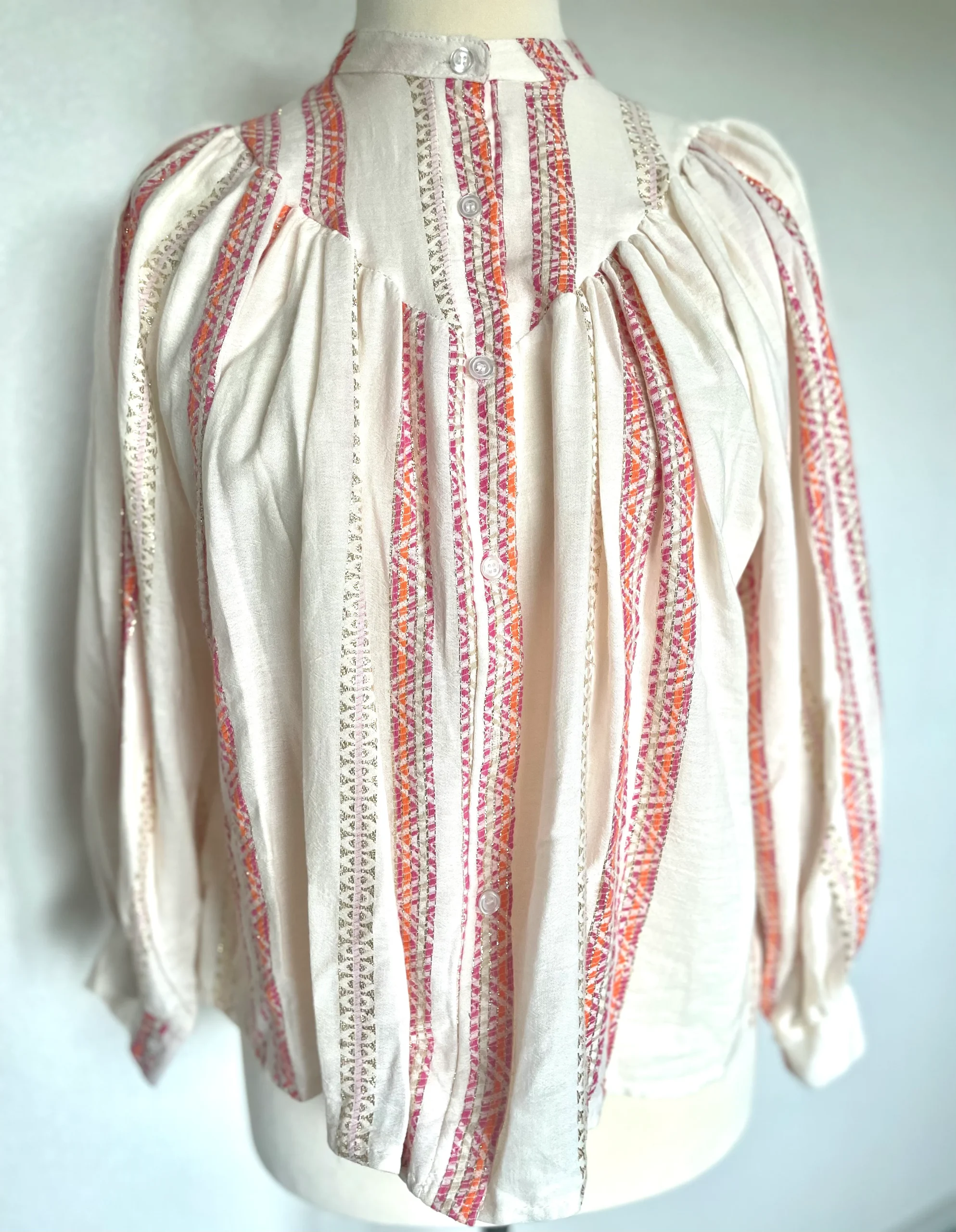 Oversized katoenen blouse, een heerlijk luchtige wijde blouse met lange mouwen, heeft op het voorpand en het achterpand een dubbel gestikt stuk in een punt, als leuk detail. Deze blouse heeft een mooi patroon in kleur met lurex draad. Deze blouse is verkrijgbaar in verschillende kleuren: Beige/Blue, Beige/Pink, Beige/Green.