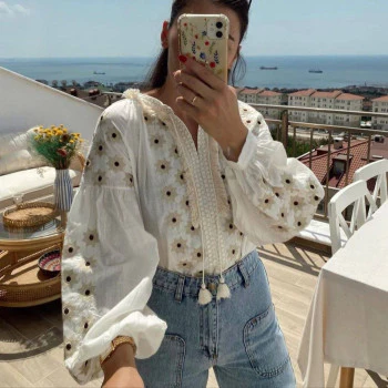 Oversized katoenen blouse, is een heerlijk luchtige wijde blouse, recht model met ronde boord, lange wijde pofmouwen met plooitjes en een smalle manchet met knoopje. De top heeft op het voorpand gestikte bloemen en patroon en is afgezet met ruches, als prachtig detail. De top kan open gedragen worden en kan gesloten worden met een koord met flosjes.