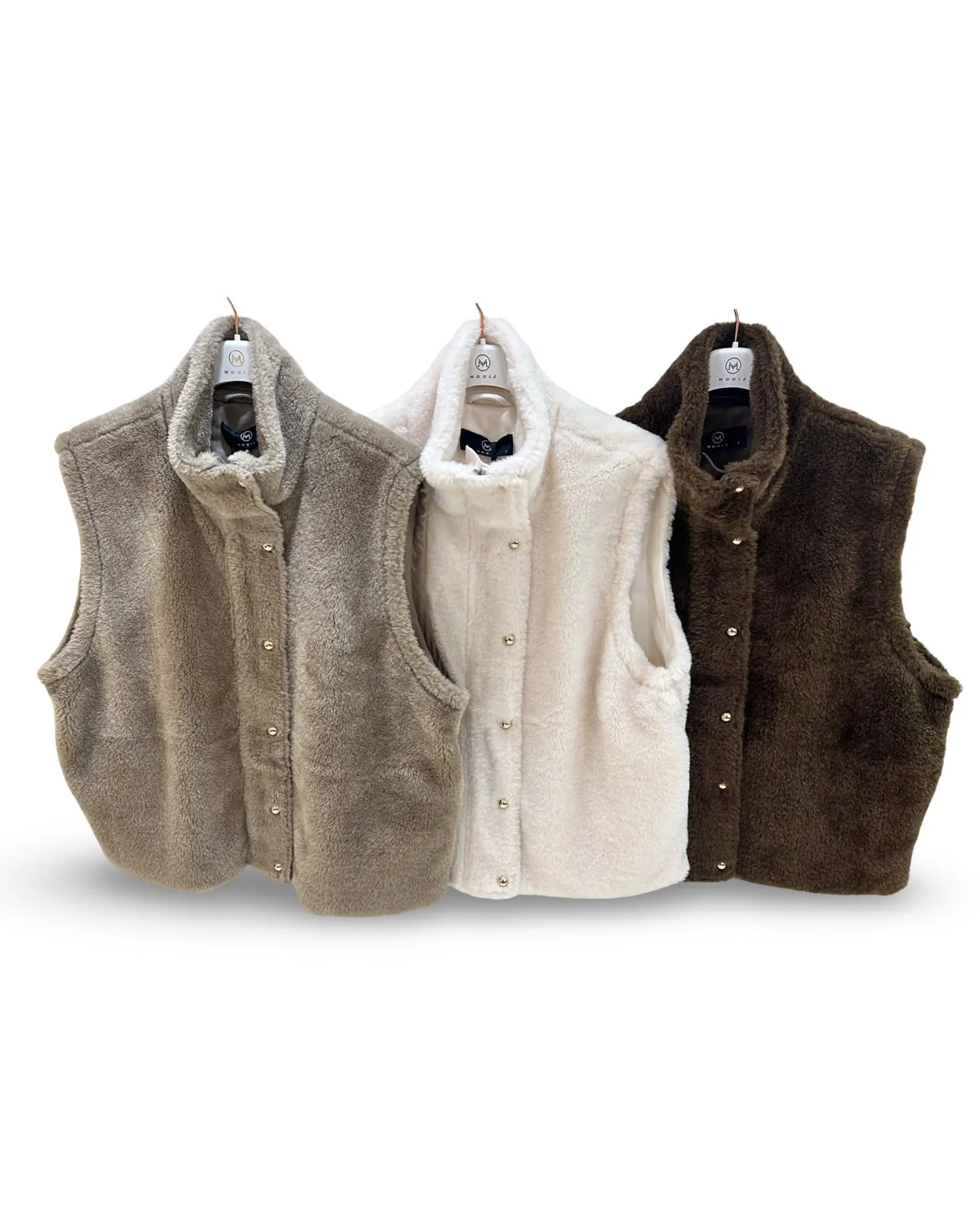 Warme en zachte faux fur bodywarmer van Mooij met opstaande kraag, ritssluiting, steekzakken en goudkleurige drukknopen. Bodywarmer Deluxe Nola is volledig gevoerd en afgewerkt met suèdine, wat deze bodywarmer een luxe uitstraling geeft.