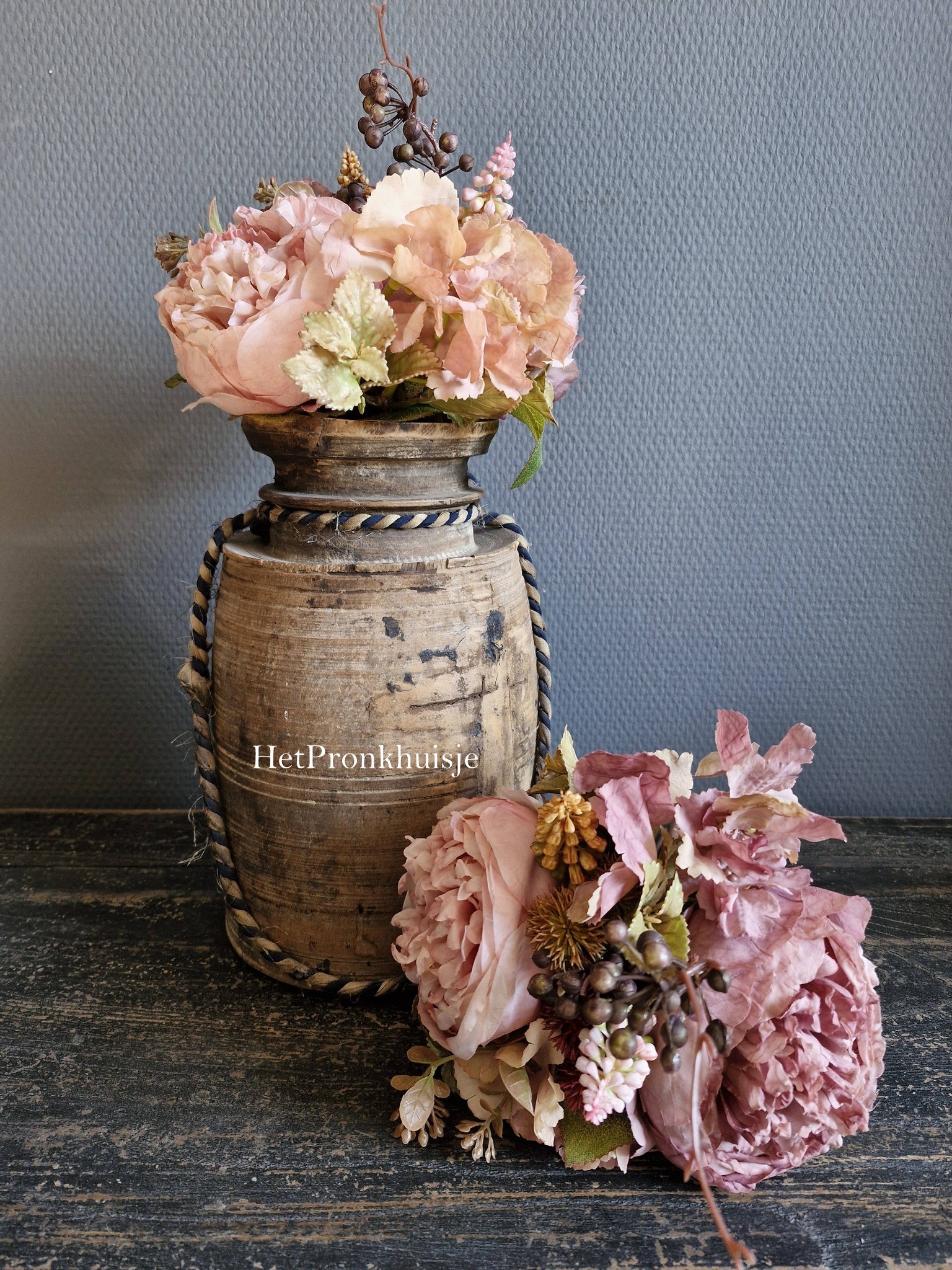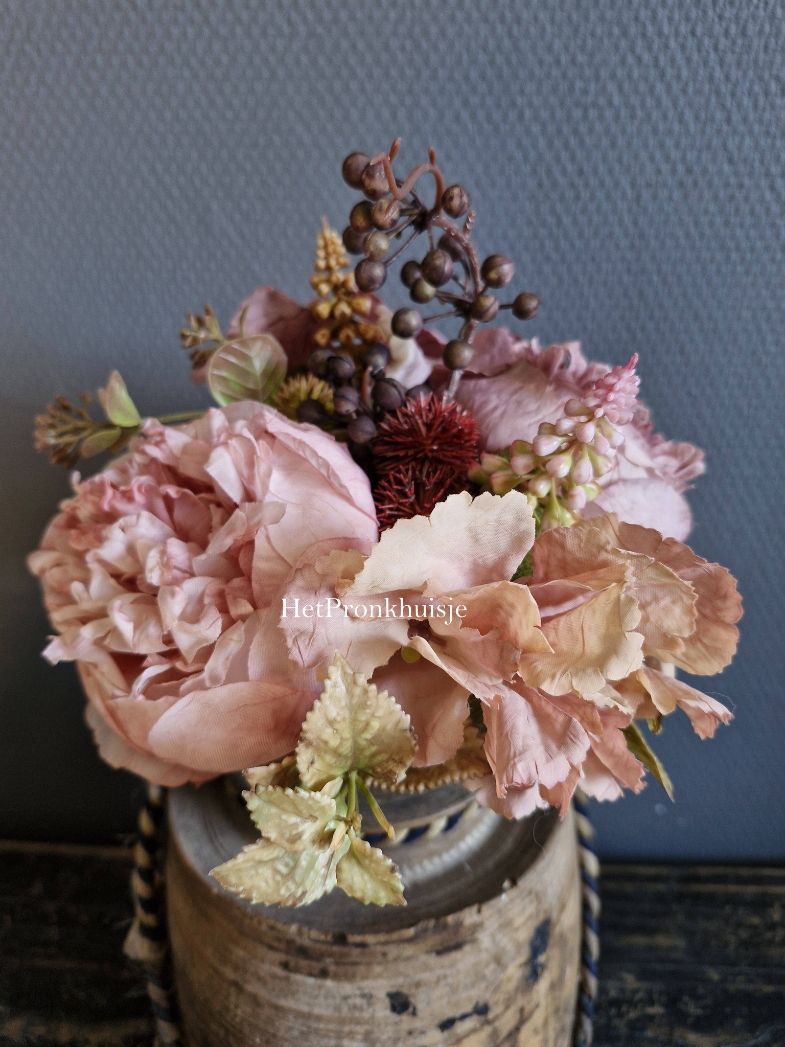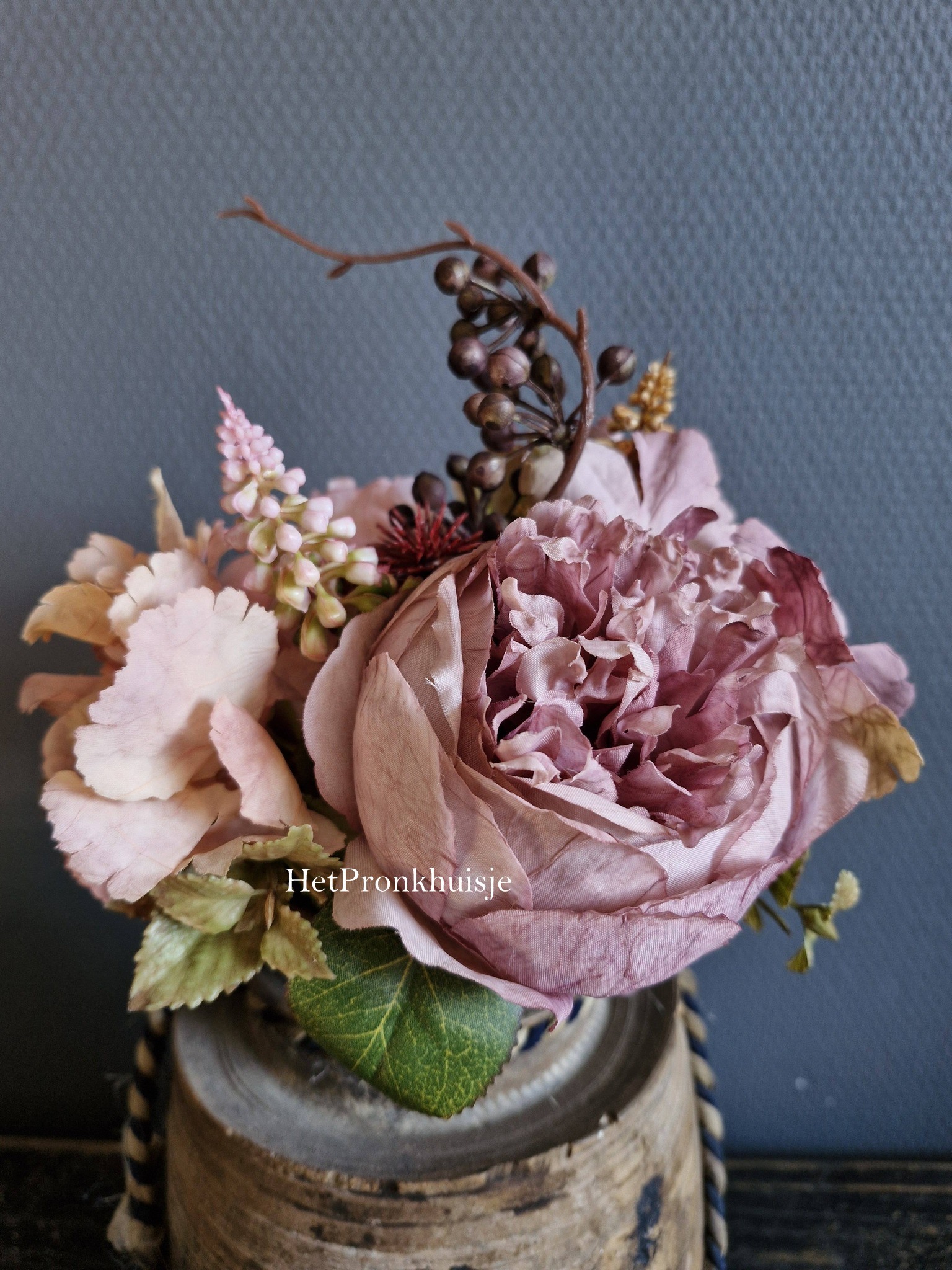 Het kunstboeket bestaat uit zorgvuldig samengebrachte bloemen in een oud roze kleurenpalet.