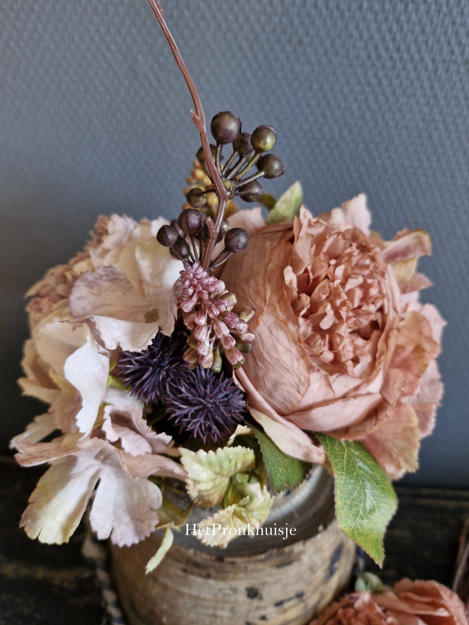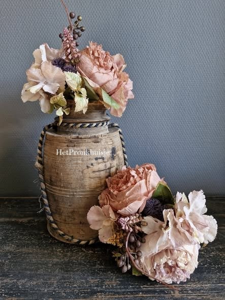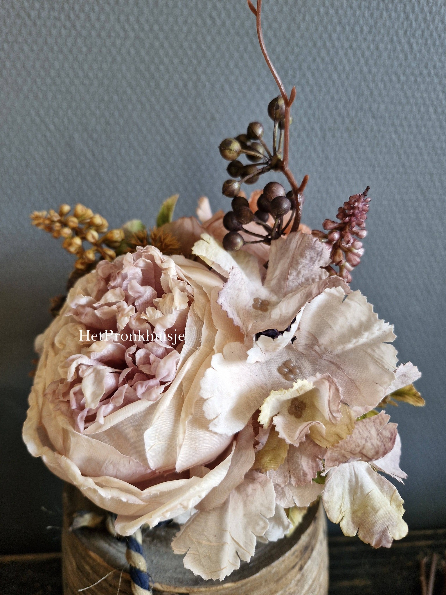 Het kunstboeket bestaat uit zorgvuldig samengebrachte bloemen in een zacht roze kleurenpalet.
