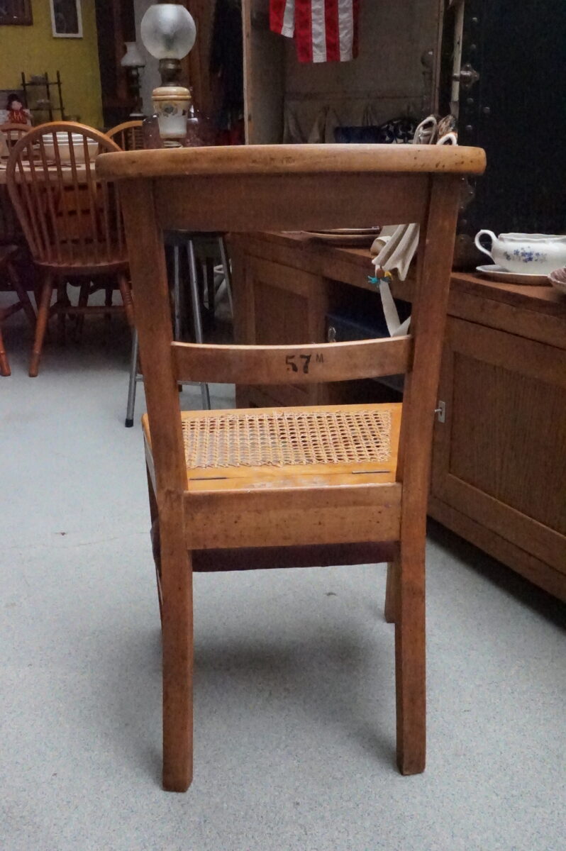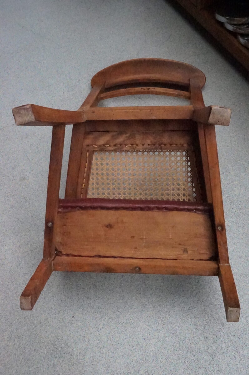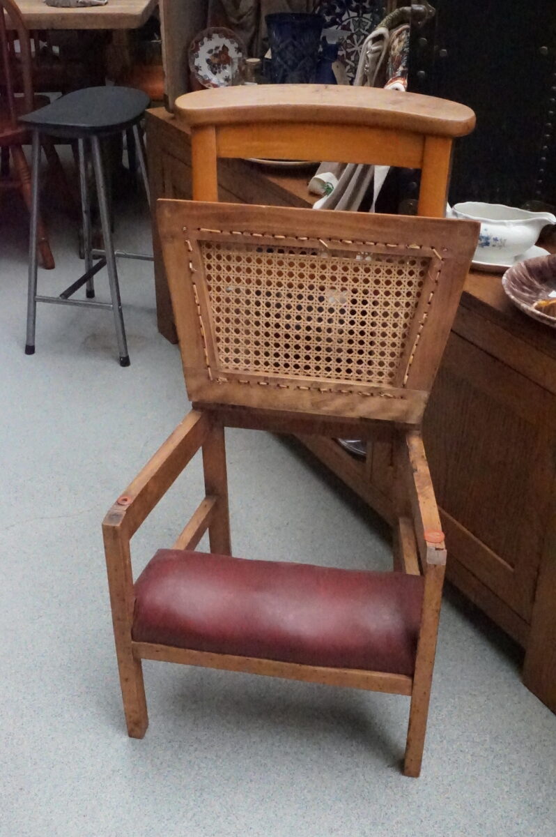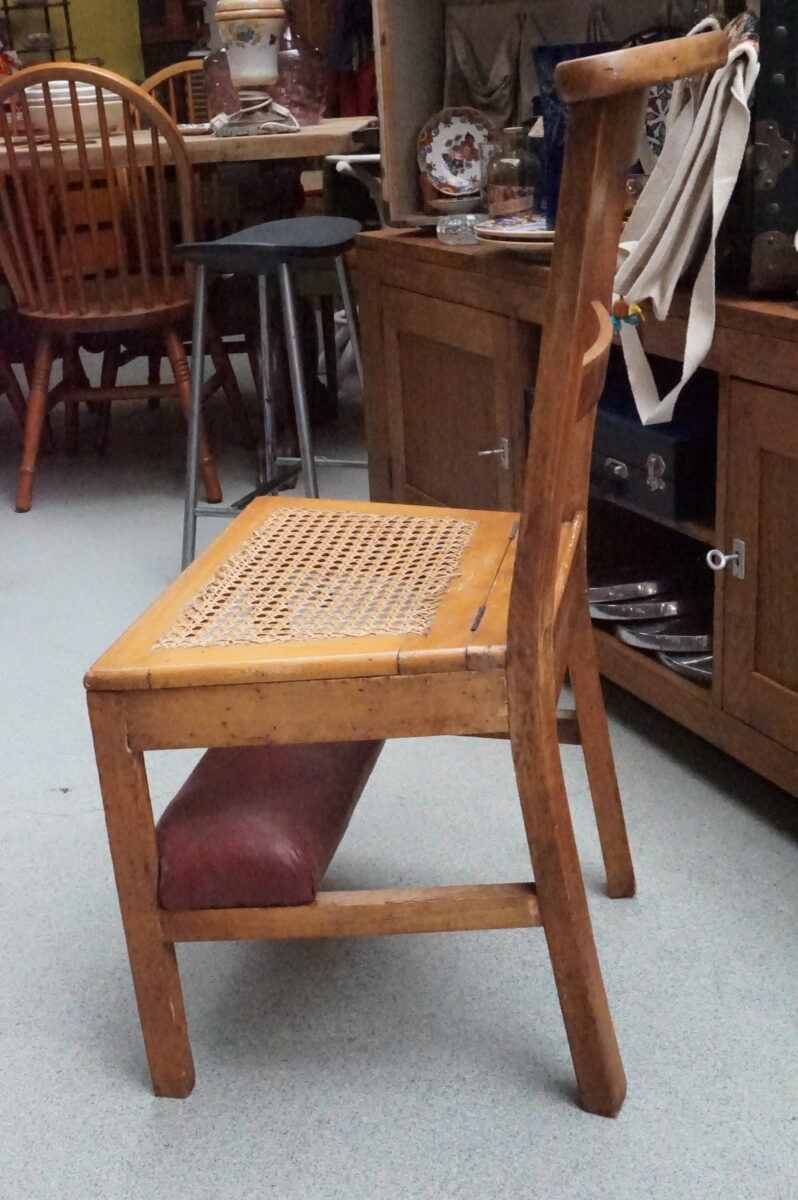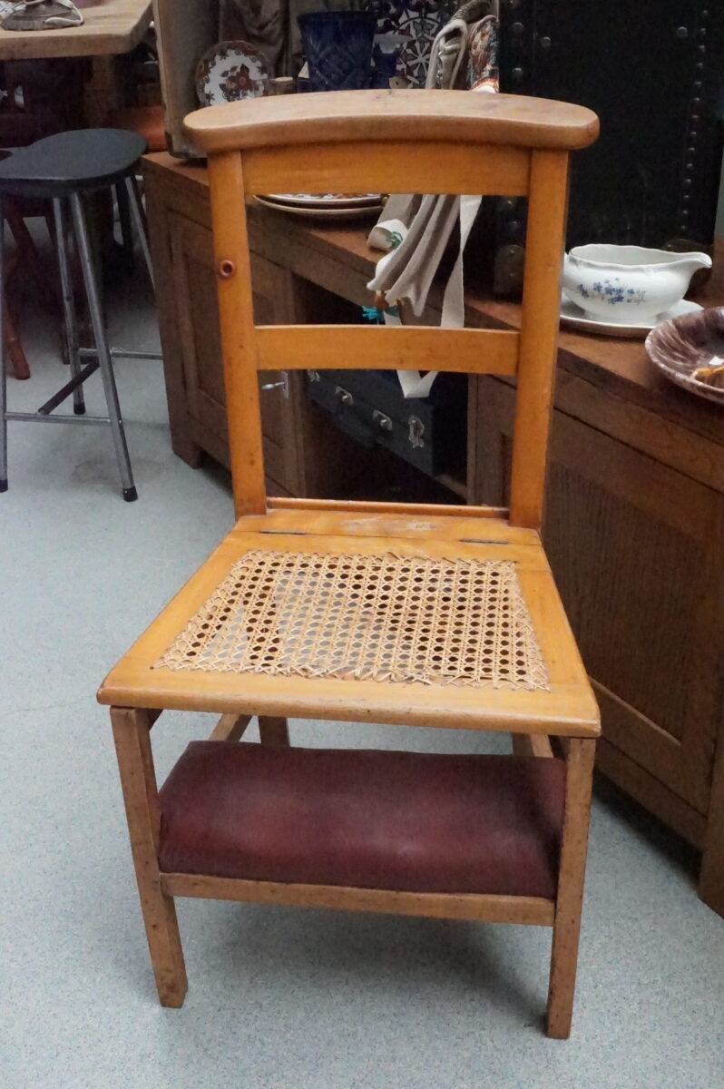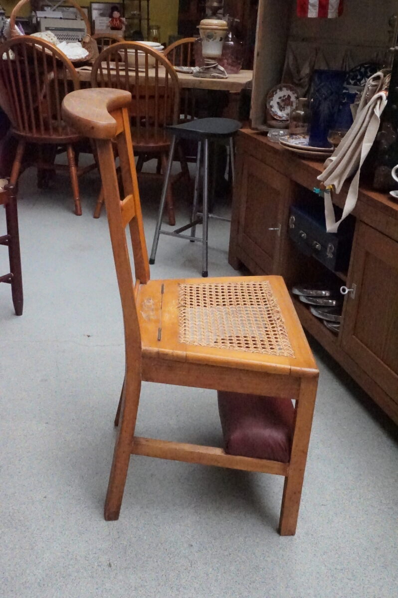 Brocante antieke bidstoel met webbing zitting en knielkussen. De zitting is klapbaar, zodat het knielgedeelte gebruikt kan worden. Afmeting: 47.5 cm breed, 44 cm diep en 88 cm hoog.
