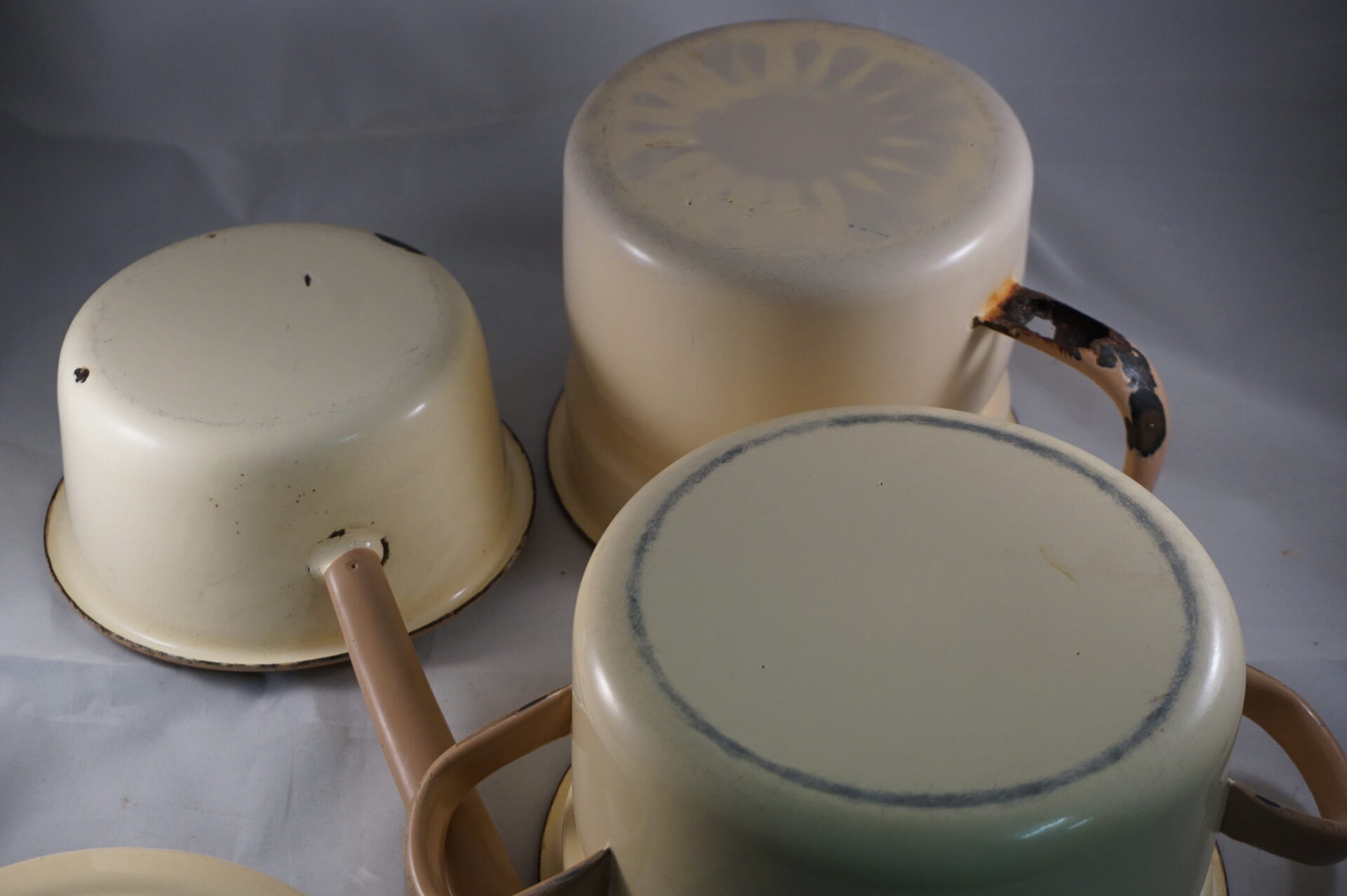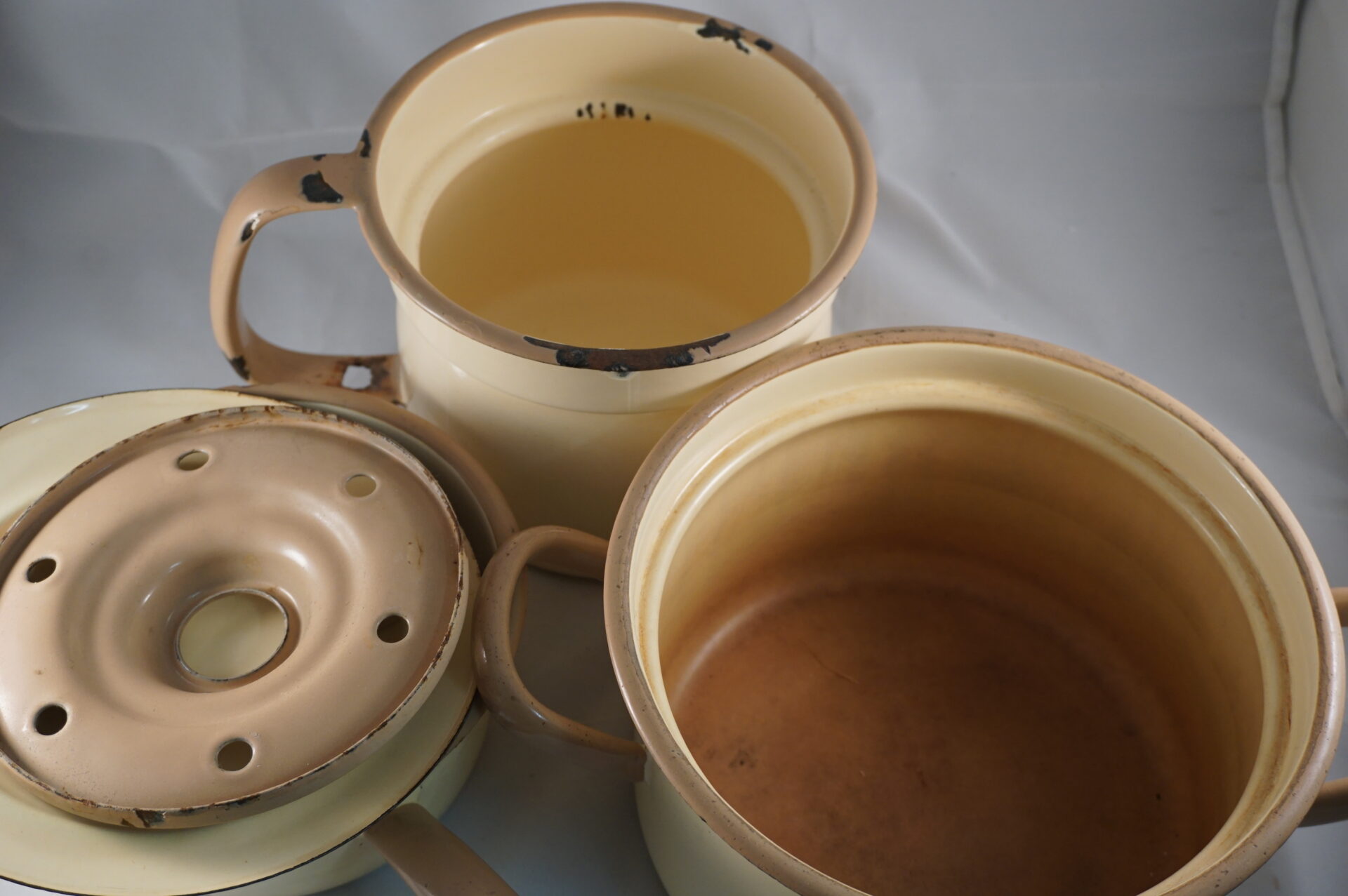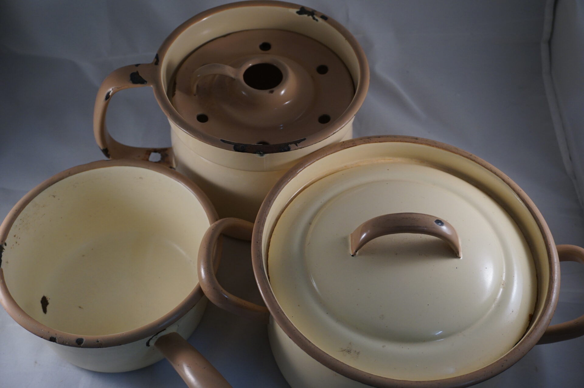 Brocante emaillen pannenset. In gebruikte staat, waardoor de pannen geschikt zijn ter decoratie. De set bestaat uit een kookpan met deksel, steelpan en melkkoker met overkookdeksel. Kleur: wit/creme met donker creme/rose randen.