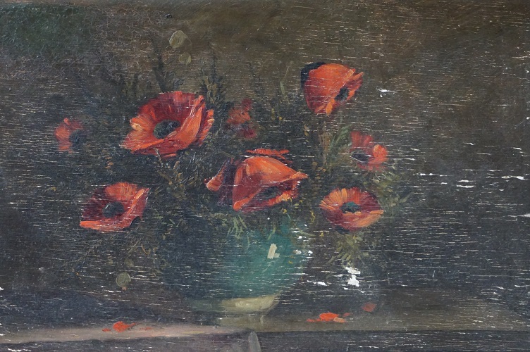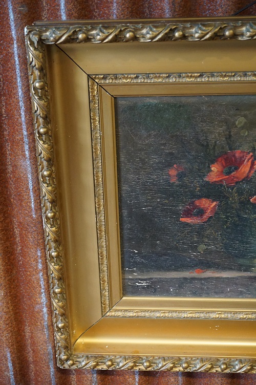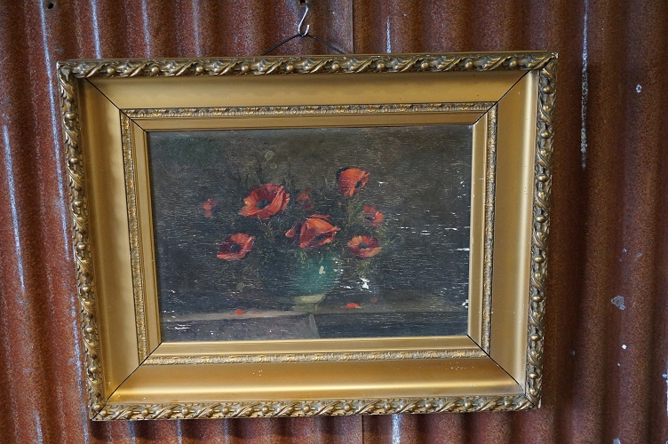 Brocante op paneel geschilderde anemonen met gemberpot in goudkleurige lijst. Afmeting: 70 cm breed en 55 cm hoog. Het paneel heeft een afmeting van 50 bij 35 cm.