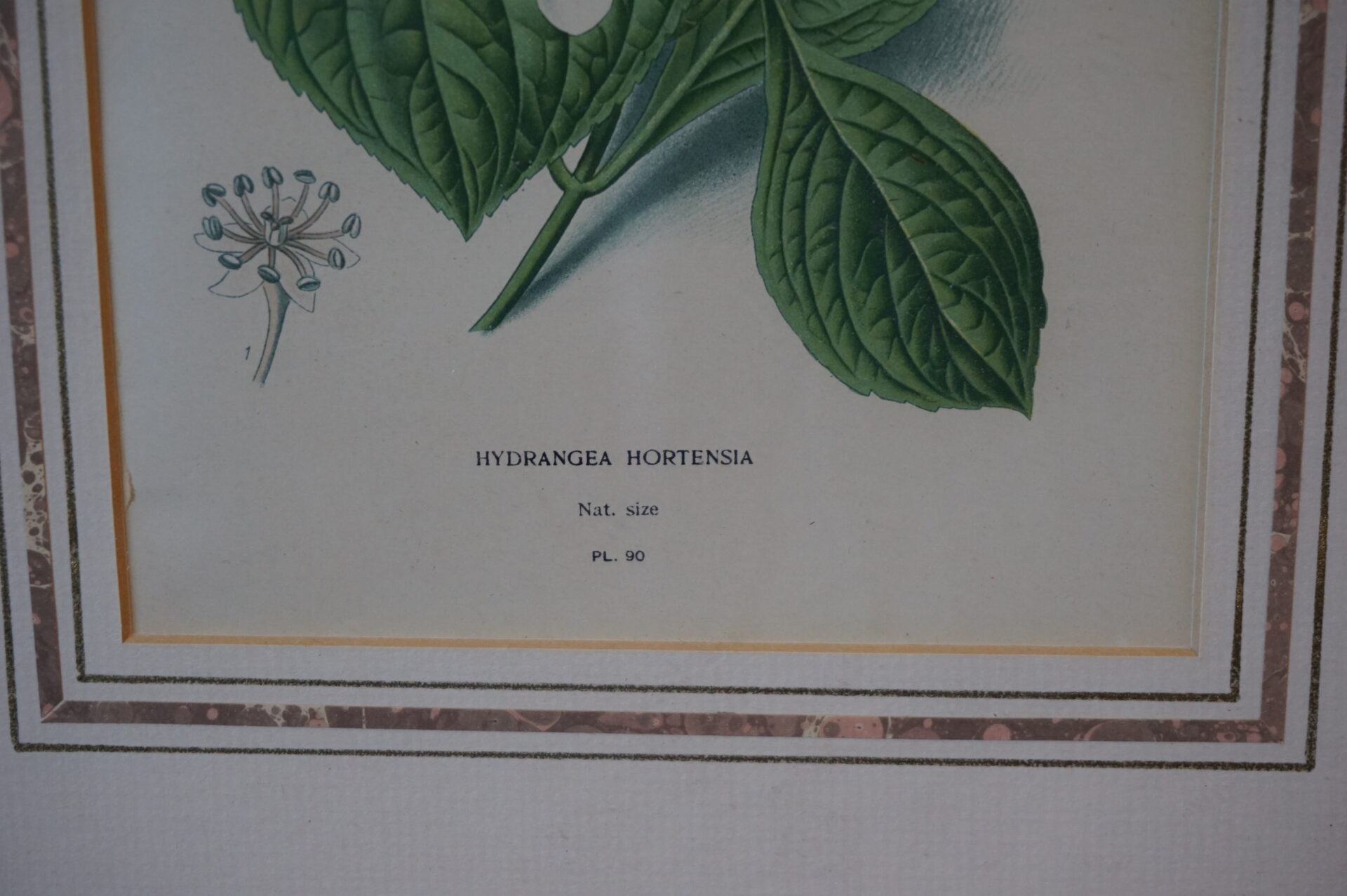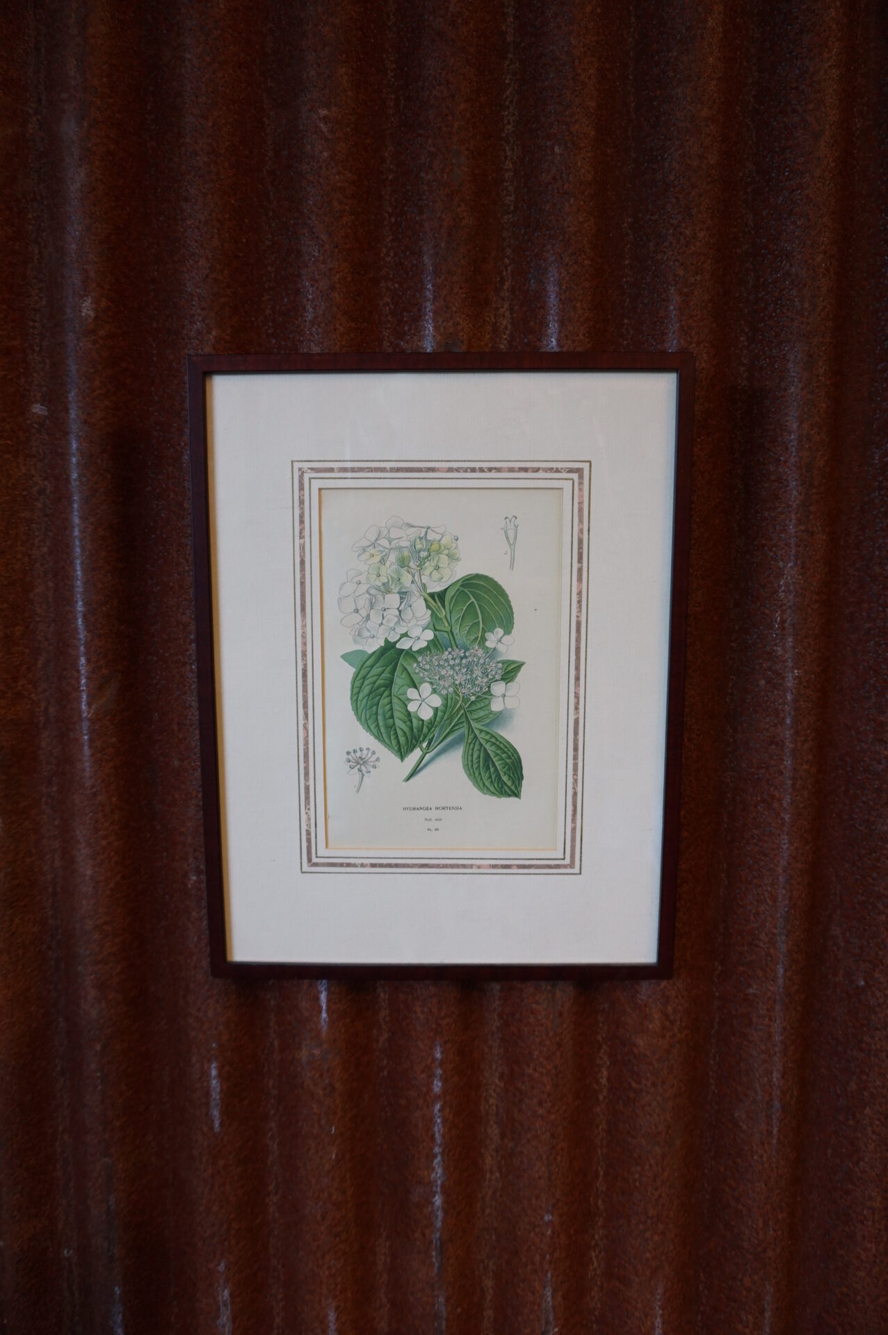 Ingelijste prent van de Hydrangea Hortensia. Het schilderij is opgebouwd uit de prent, een paspartout en glas in houten lijst. Een mooi en rustig geheel. Afmeting: 30 bij 39 cm.
