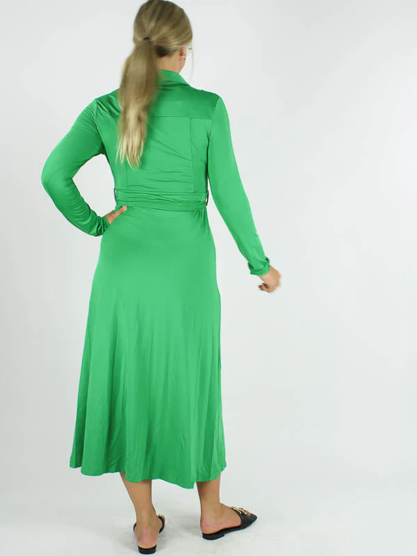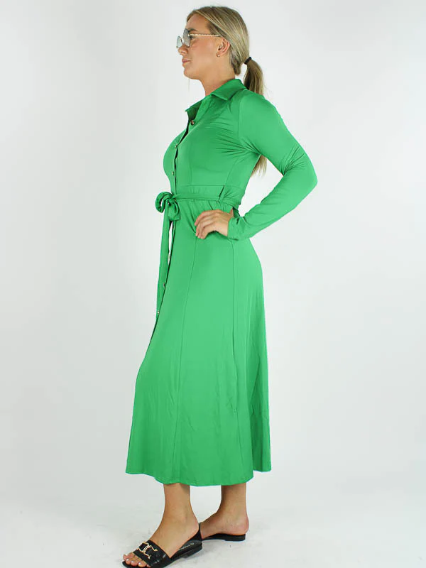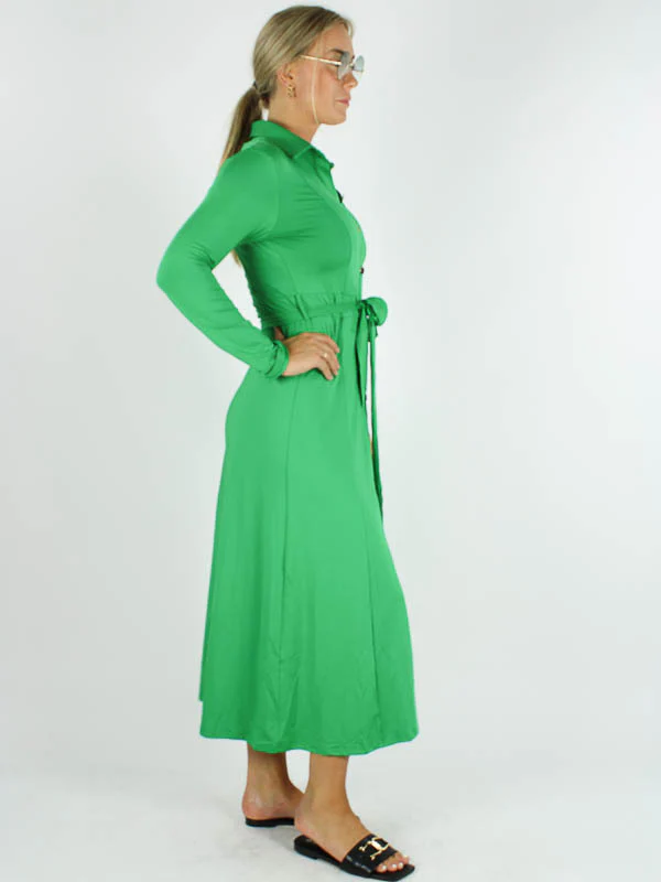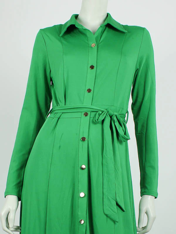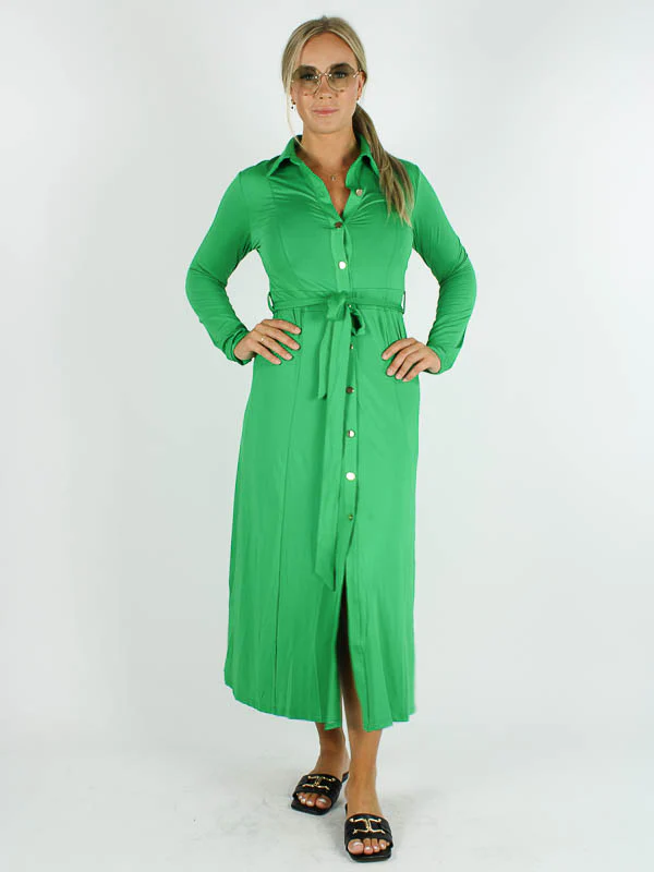 Groene Doorknoop Jurk Valerie is een stijlvolle lange doorknoop jurk met strikceintuur en lange mouw in getailleerd model van By Swan. Deze jurk is van een kreukvrije travel kwaliteit.