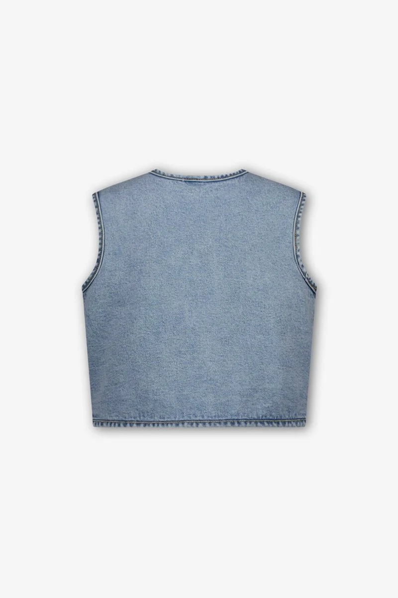 Dit gilet is gemaakt van stevig denim, wat het een eigentijdse en stoere uitstraling geeft. Het gilet heeft een eenvoudige knoopsluiting aan de voorkant en is voorzien van twee praktische, ruime zakken. Perfect om een outfit een trendy touch te geven, en ideaal om te dragen over een T-shirt of sweater voor een laagjeslook. Dit gilet is eindeloos te combineren! Dit chapter is in samenwerking met @_elisee_o.