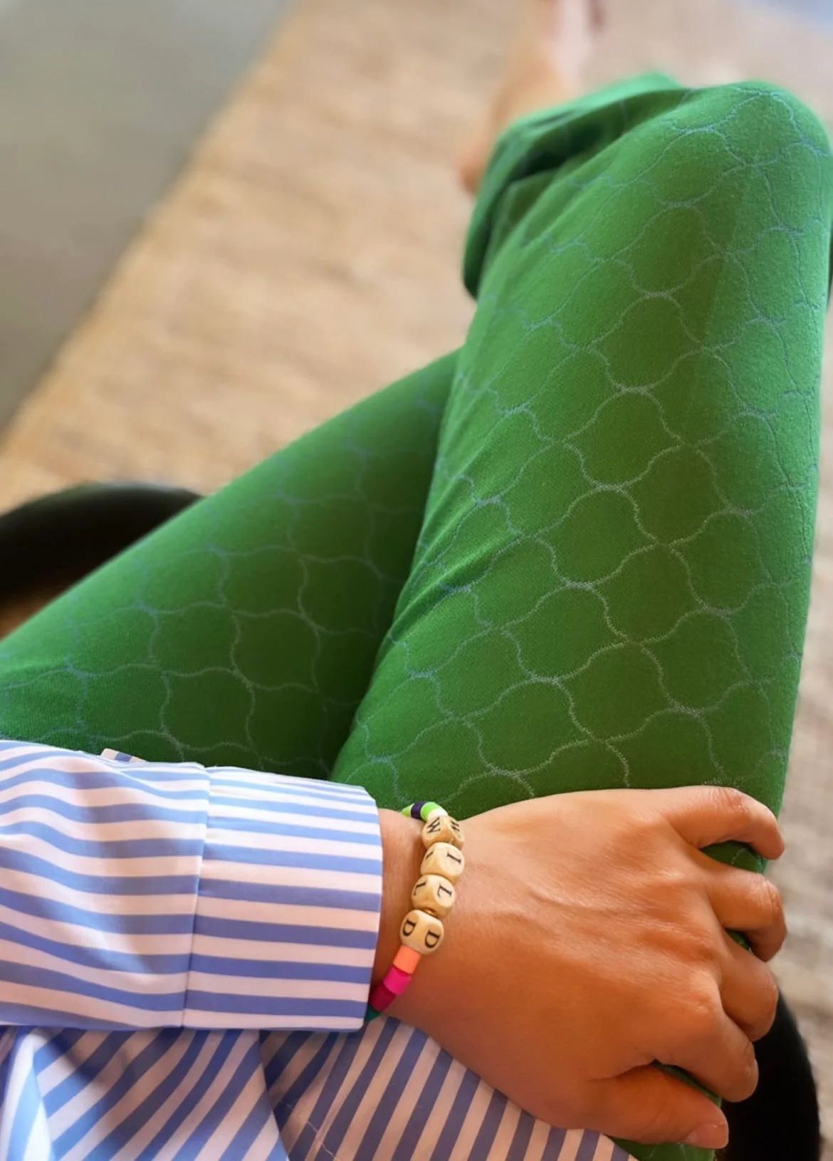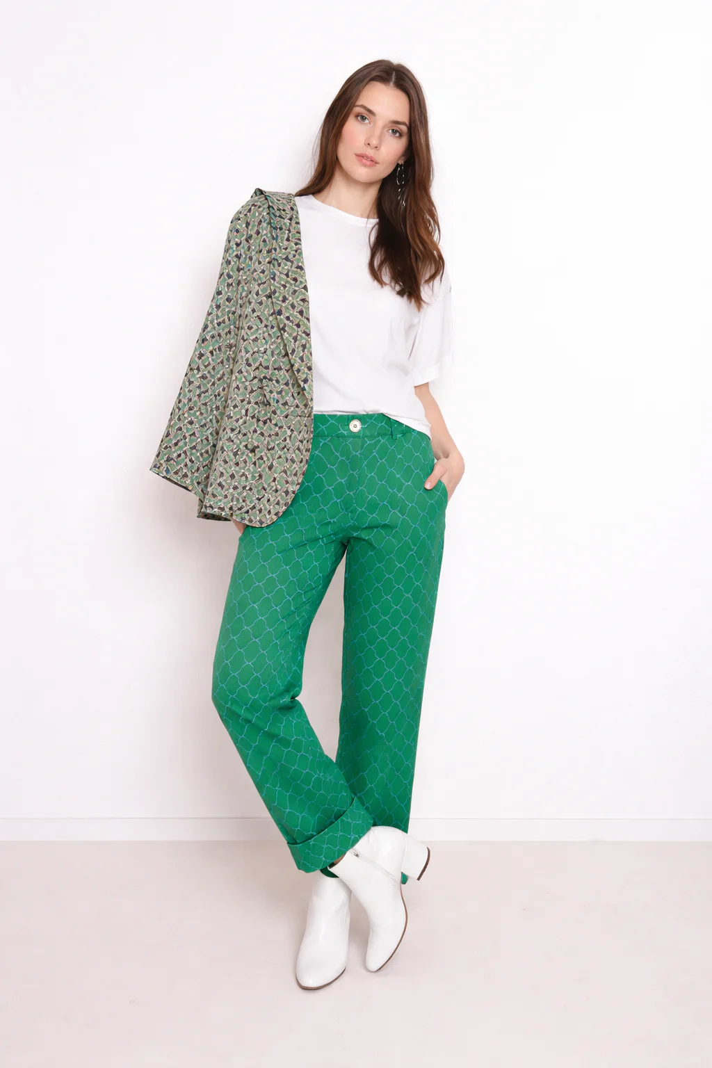Casual broek van Dame Blanche, Foma-A76 Jaquard Green, is een korter recht model met brede omslag. Deze broek heeft steekzakken en een mooi jaquard patroon met licht blauw.