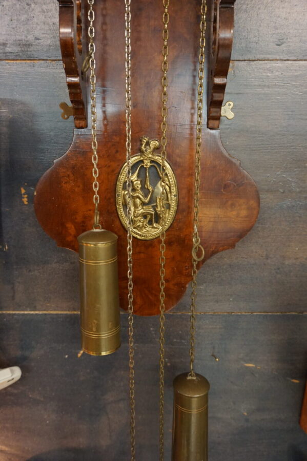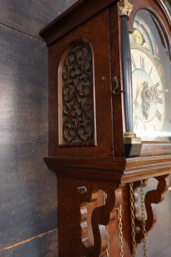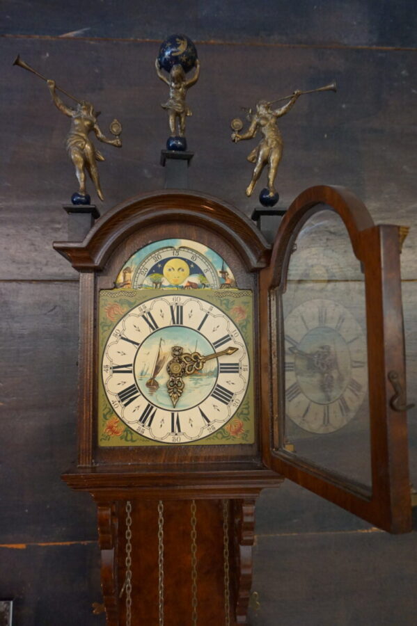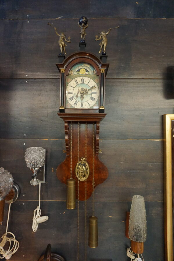 Prachtige oude Friese staartklok met drie beelden op klokkenhuis en een slingerhuis. De klok heeft twee gewichten. Donker eiken met prachtige vormen en mooie geschilderde taferelen. Boven wijzerplaat dag- en nacht voorstelling. Afmeting: 80 cm hoog, 25 cm breed en 15 cm diep. De beelden on top zijn ongeveer 15 cm.