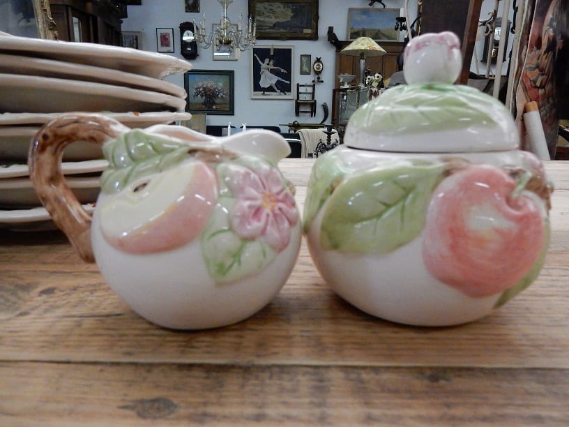 Leuk stel dit suiker en melk stel met voorstelling van bloemen en fruit gemerkt F.G. Doorsnede suikerpot ongeveer 12 cm en de melkkan ongeveer 10 cm. Leuk item om cadeau te geven.