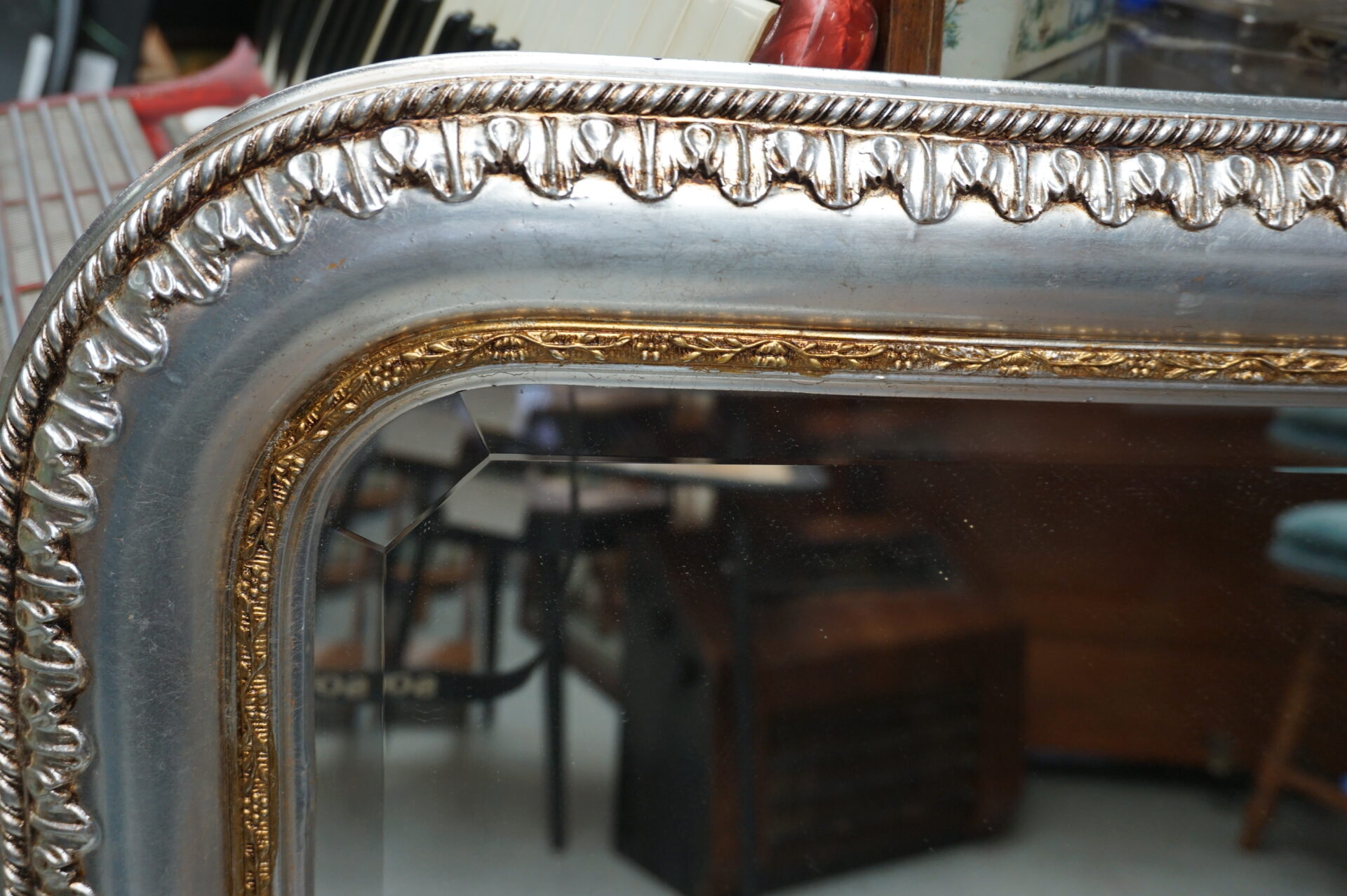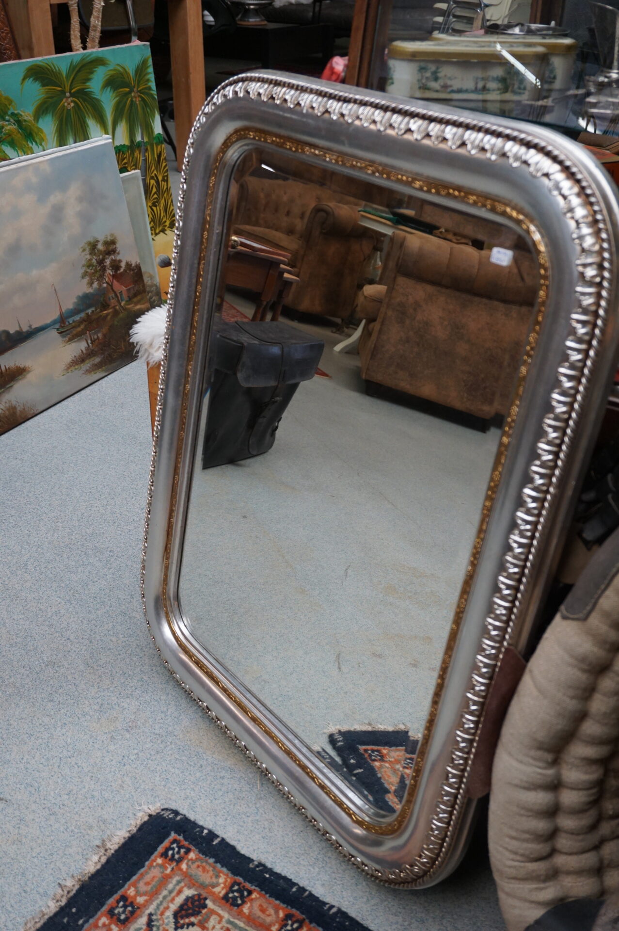 Prachtige facet geslepen spiegel in lijst. De spiegel is zowel horizontaal als verticaal op te hangen. De lijst is zilverkleurig met goudkleurige elementen. In zeer goede staat.