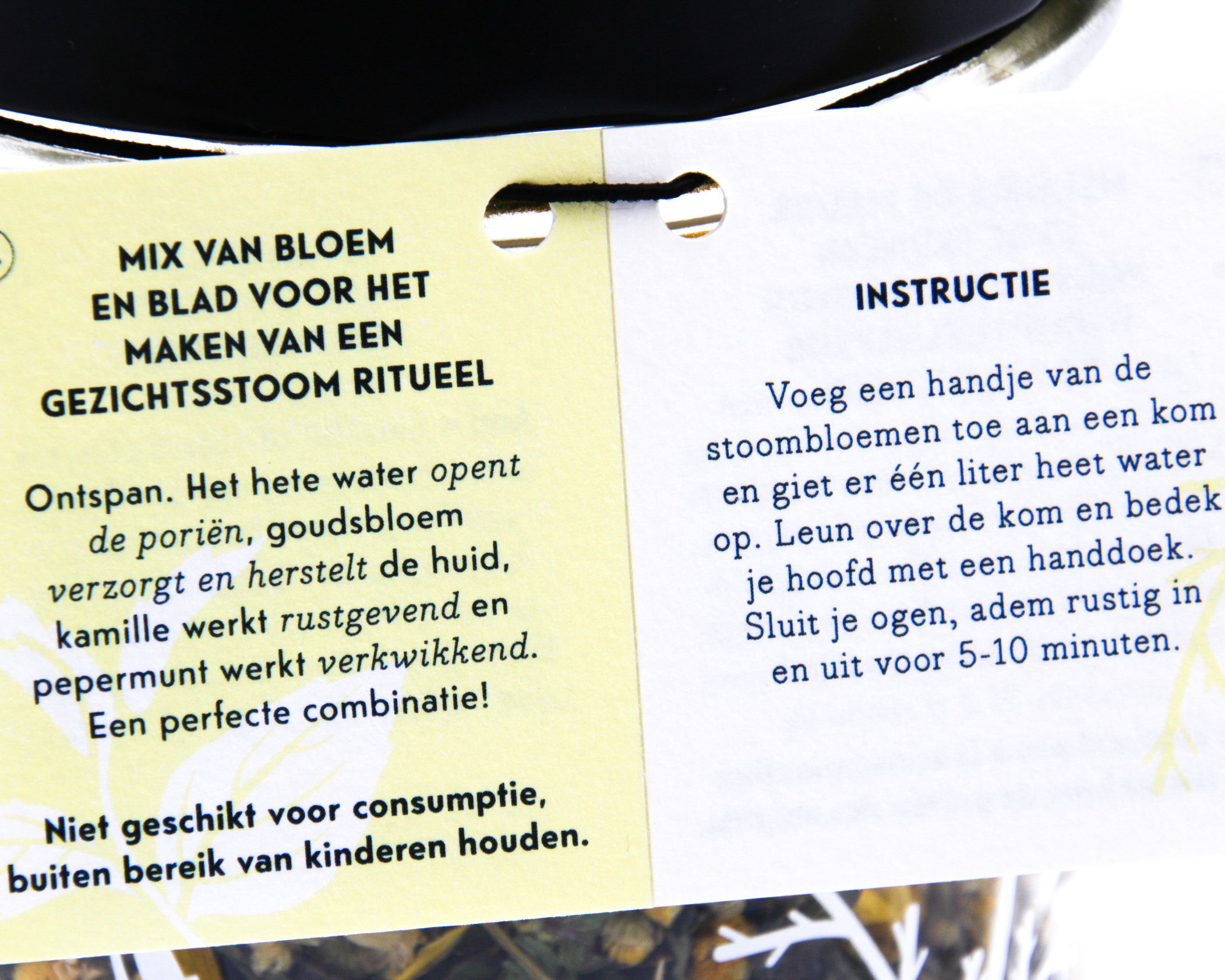 Voeg een handje van de bloemen toe aan een liter heet water. Adem in. Adem uit. Ga ervoor. Leun over de kom, sluit je ogen en laat de dampen zijn werk doen. Van vrijer ademen en minder stress tot een betere huid; stoom is zoveel meer dan waterdamp. Het is even snel herboren worden.