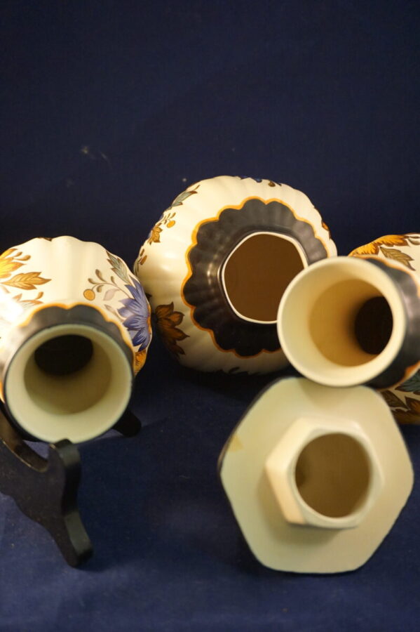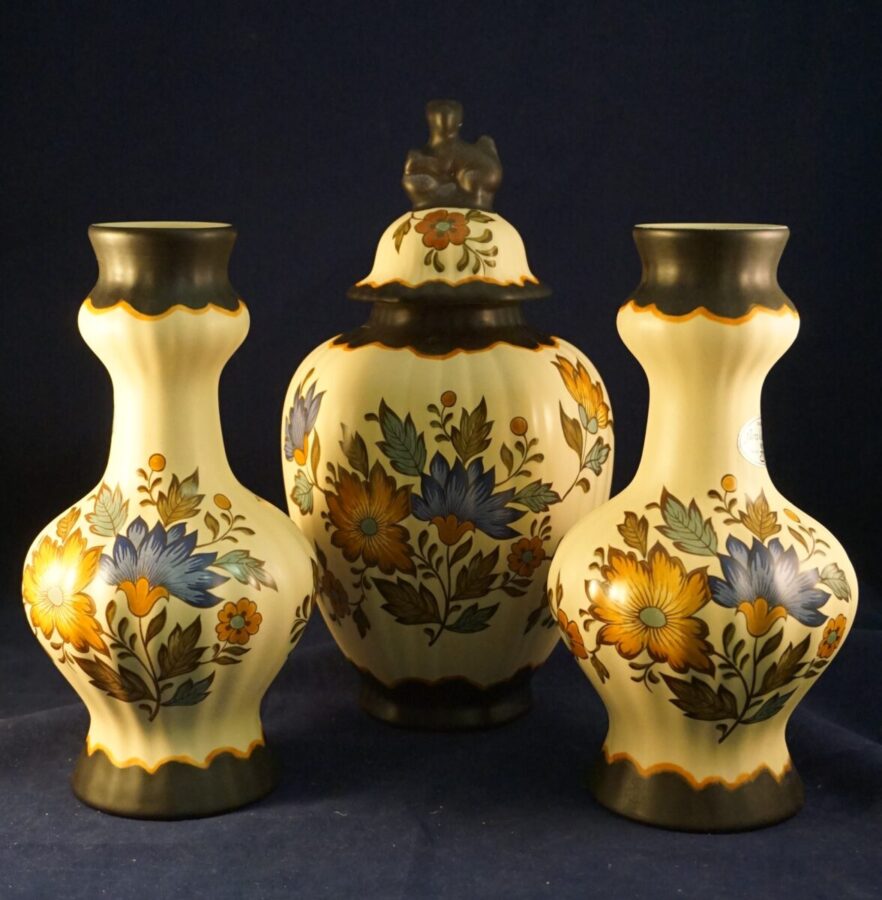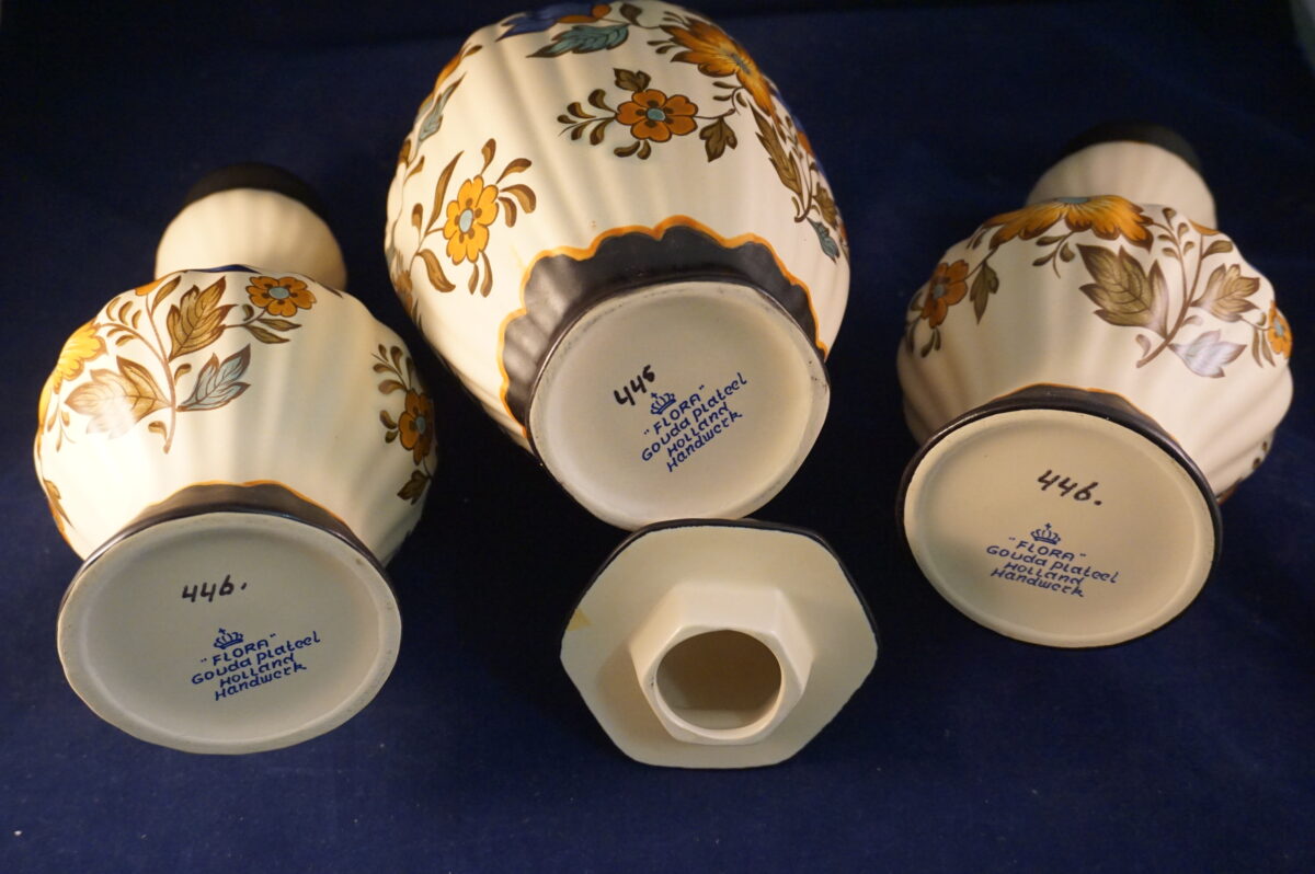 Flora Goude Plateel handpainted vaasjes. Twee bolvaasjes met no 466 en een deksel vaasje no 445. In zeer goede staat. De bolvaasjes zijn 22 cm hoog en hebben een doorsnede op het breedste gedeelte van ongeveer 12 cm. Het dekselvaasje is 28 cm hoog met een doorsnede van ongeveer 15 cm.