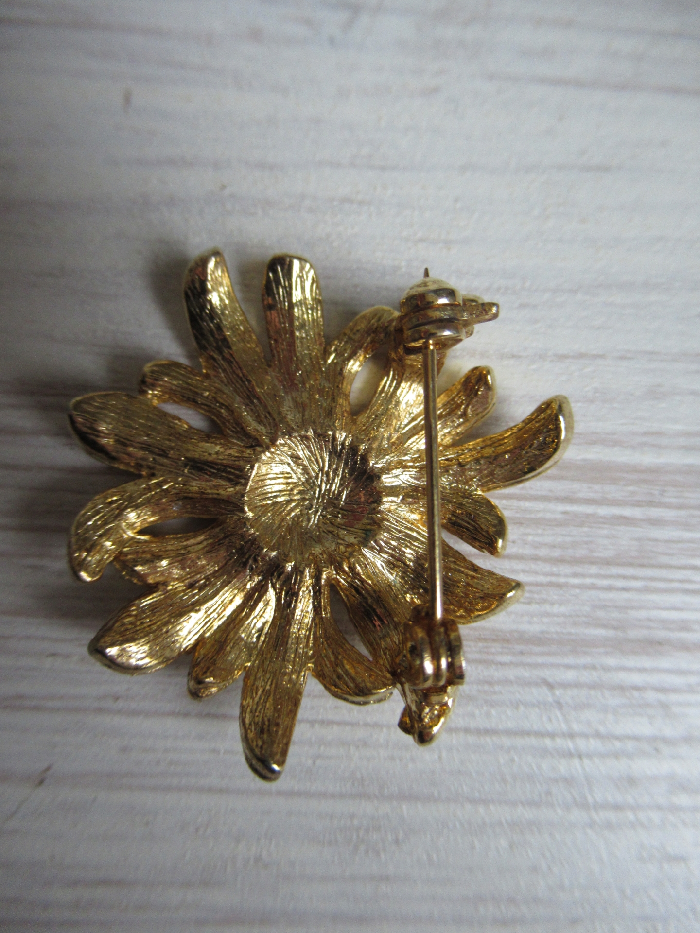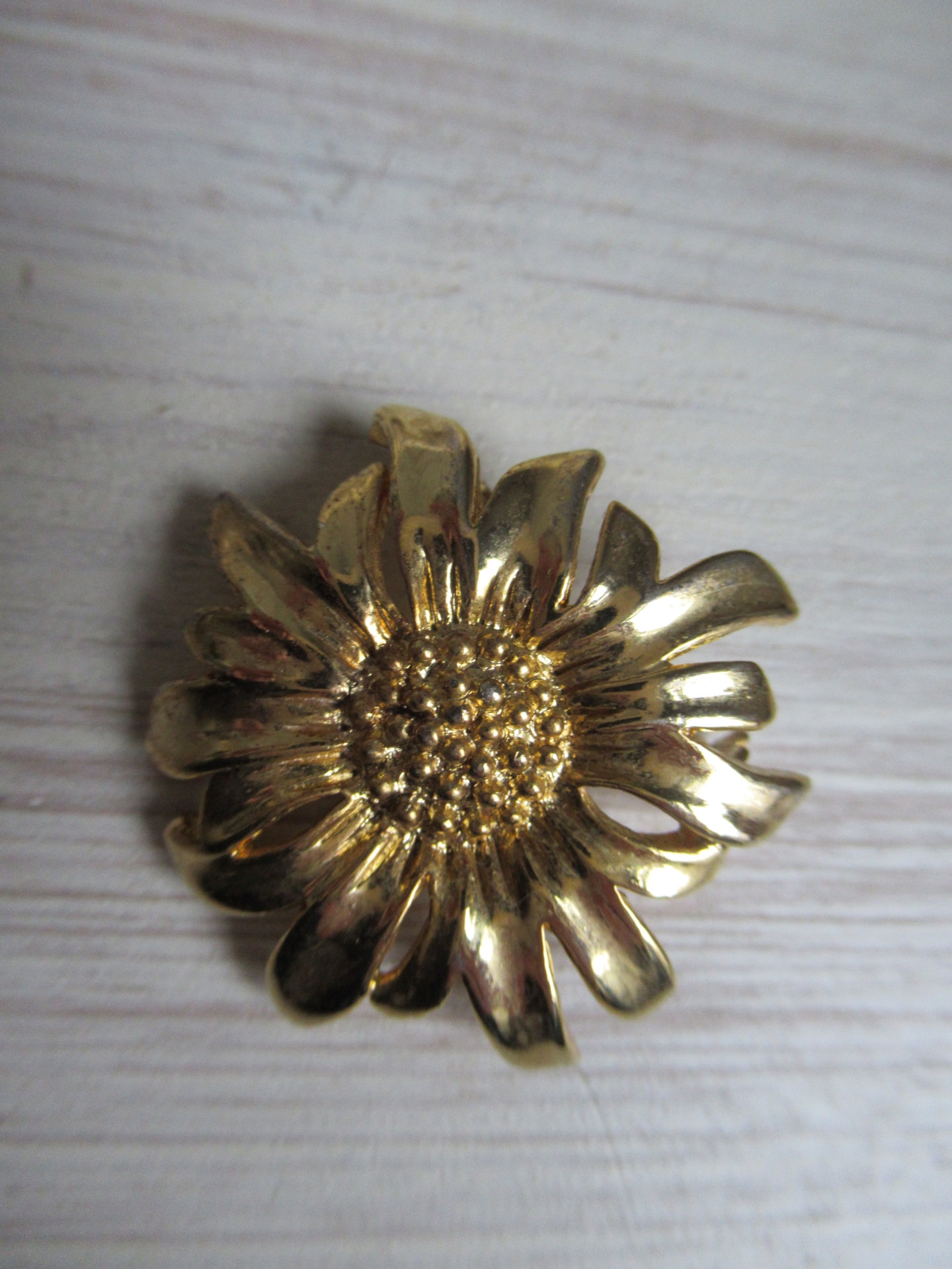 eenvoudige broche, goudkleurig metaal, geen idee hoe oud, met veiligheidssluiting (doorsnede 3 cm)