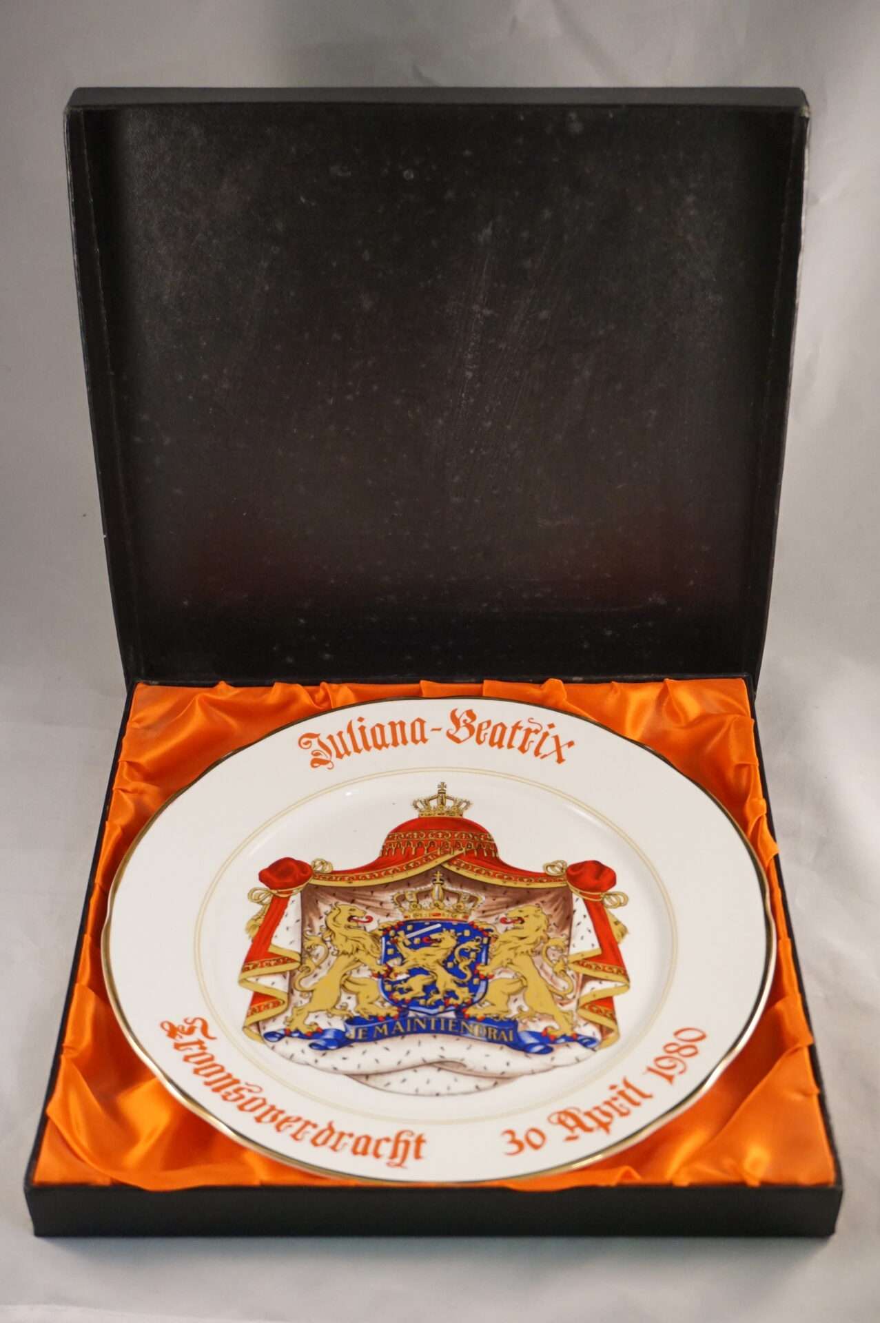 Herdenkingsbord voor de troonsoverdracht van koningin Juliana naar koningin Beatrix in originele doos.