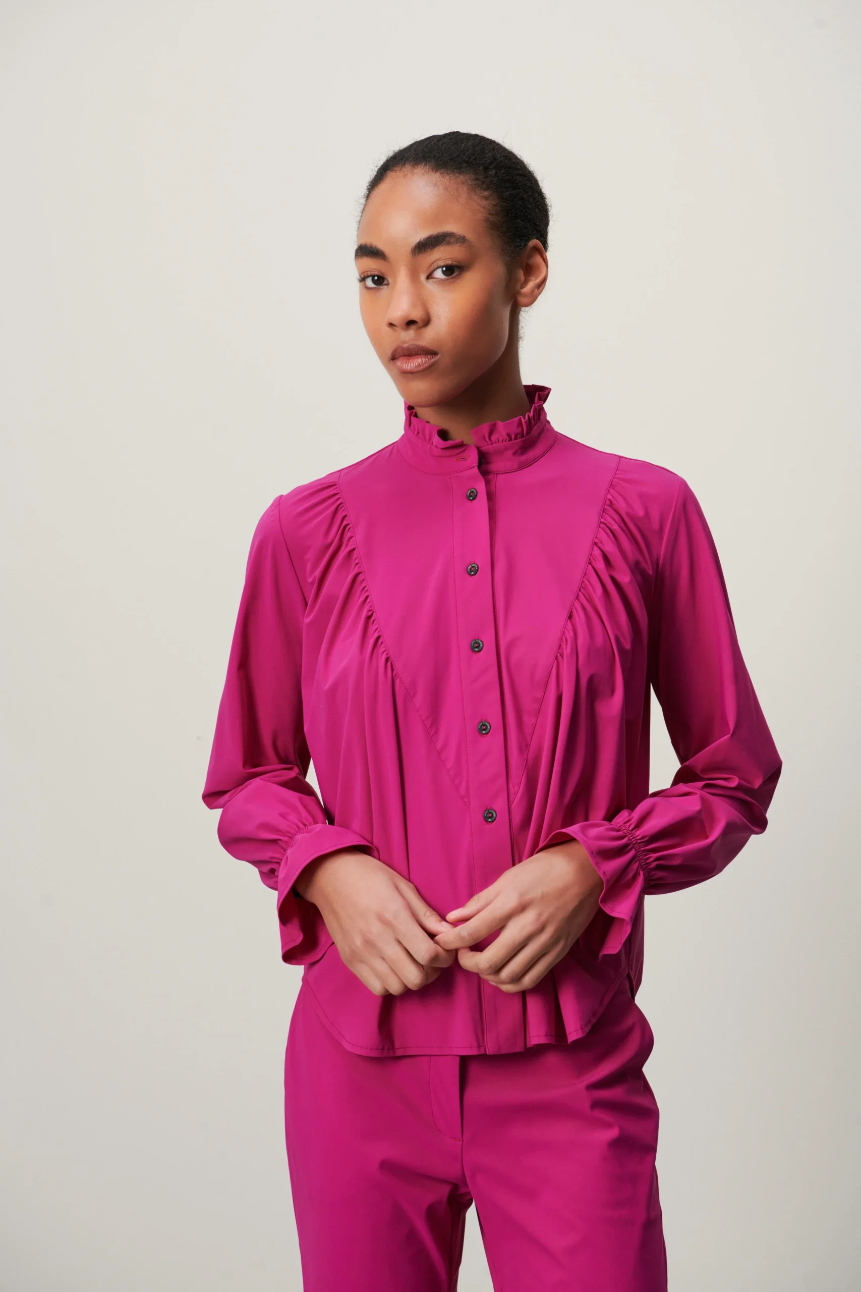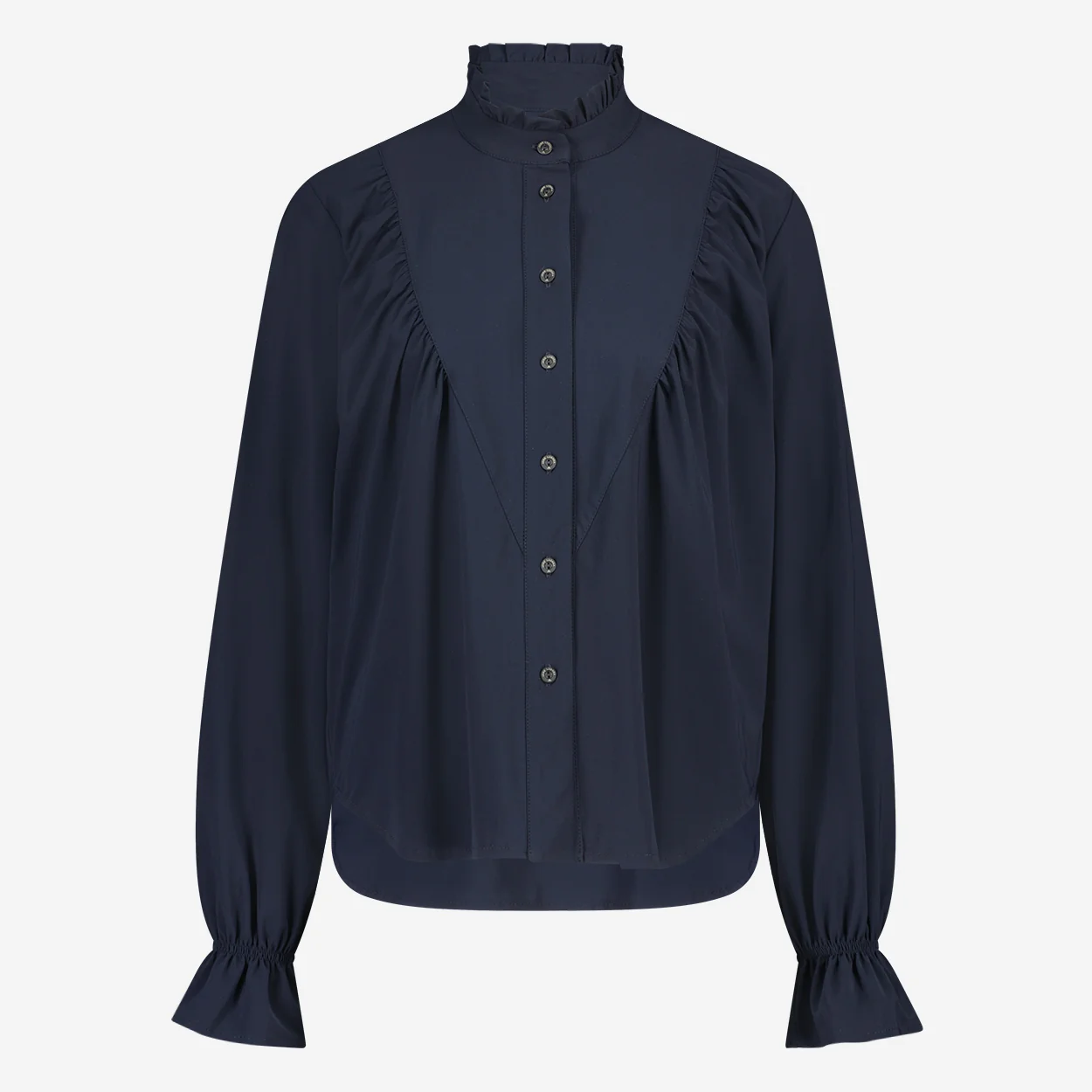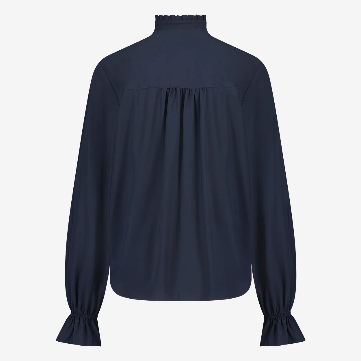 Blouse Roberta is een verfijnde elegante blouse uit de collectie van Jane Lushka, heeft ruffles aan de voorkant, een hoge kraag, lange mouwen en donkere knoopjes. Deze stijlvolle blouse is ook ontzettend mooi om te dragen onder een pak.