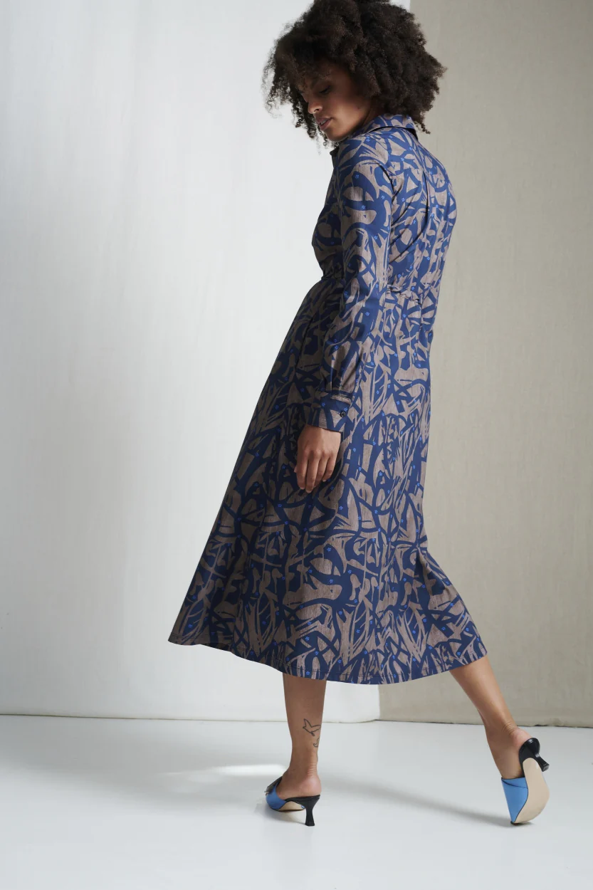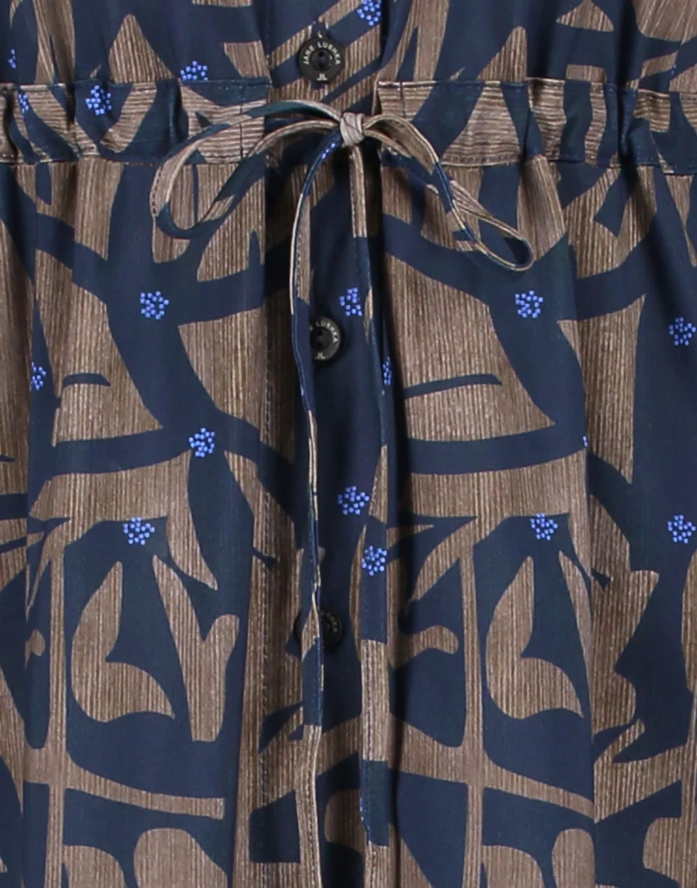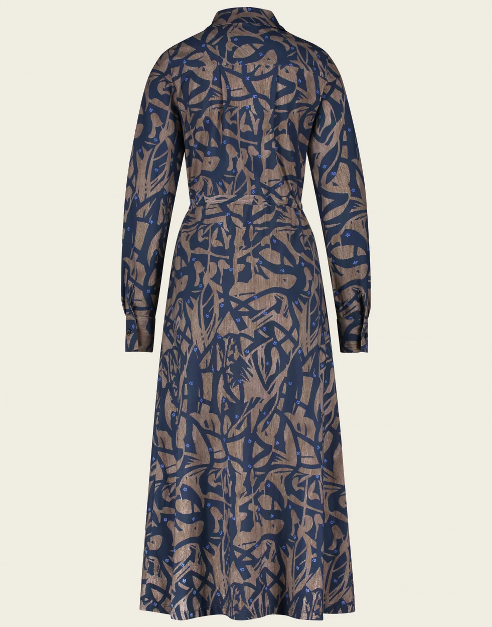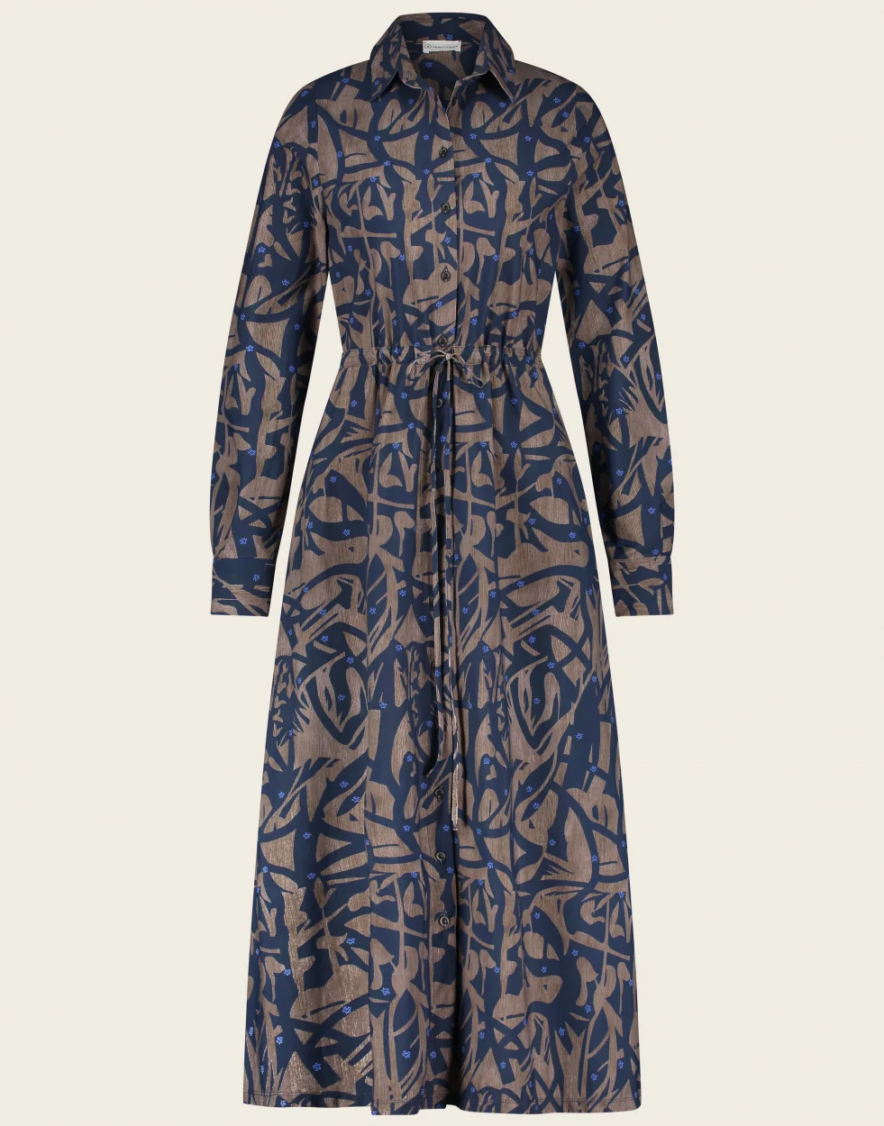 Dress Linna is een prachtige jurk van de bekende travel kwaliteit. Jurk Linna is een lange doorknoopjurk met kraag in print kleurstelling, bruin, donkerblauw en fel blauw als klein detail. Jurk heeft lange mouwen en een rijgkoord in de taille.