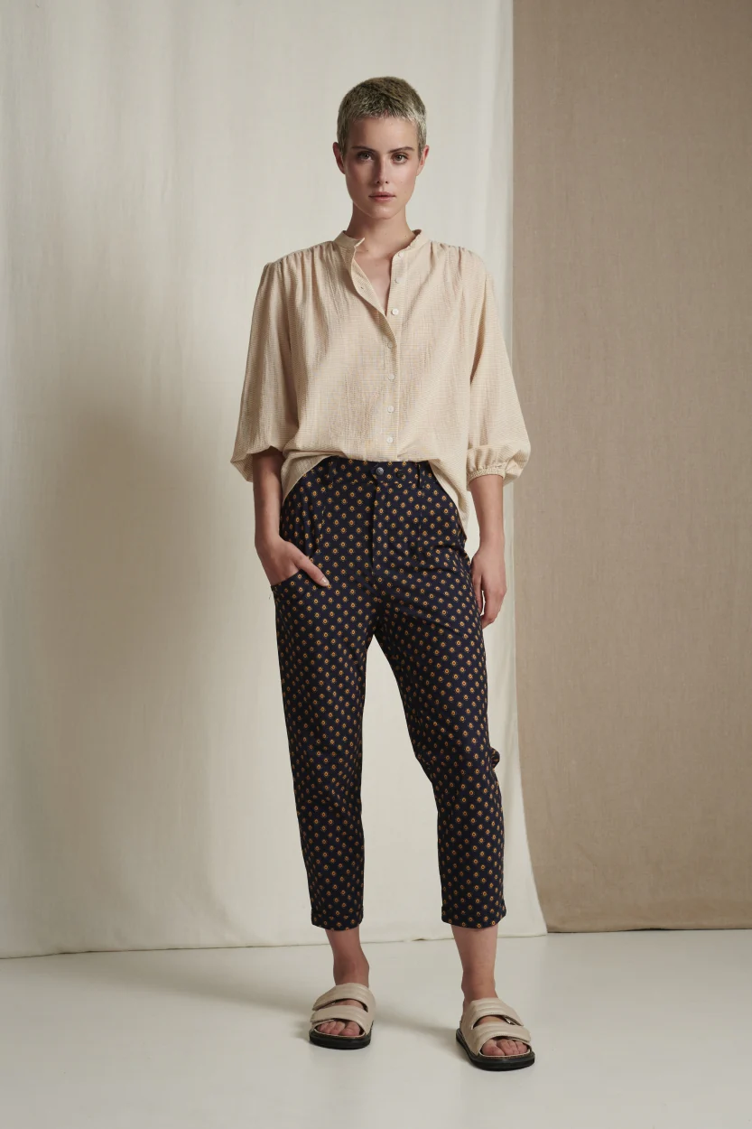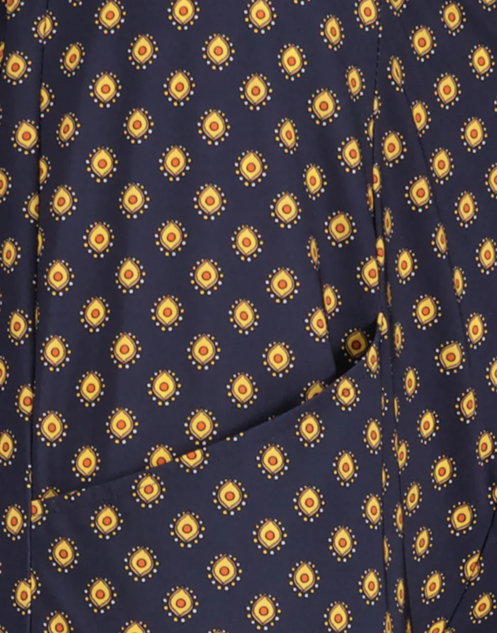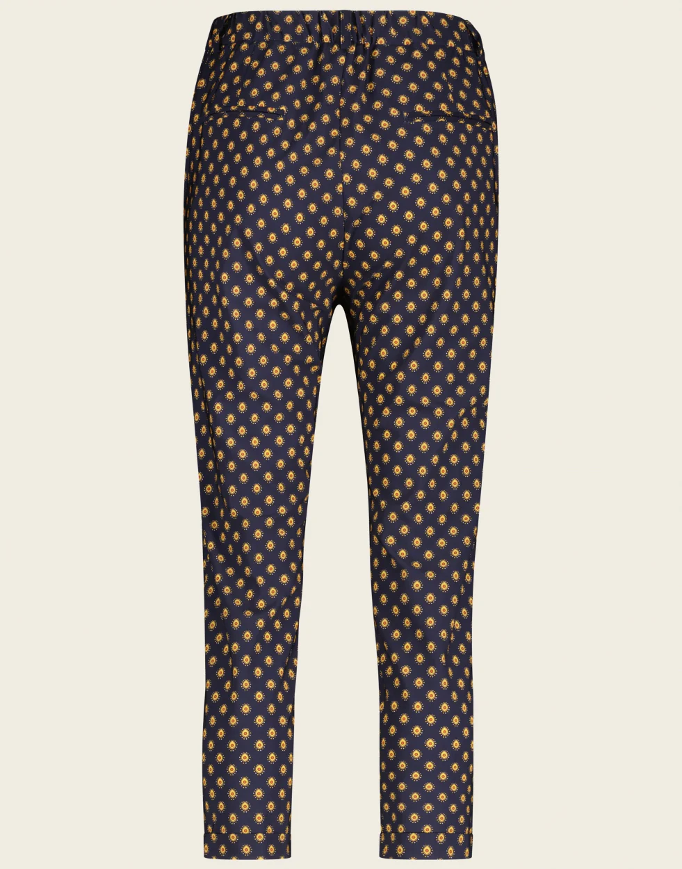 Travelkwaliteit blauwe broek met print. Pants Hazel UD22226085, heeft een knoopsluiting met rits en steekzakken. De broekspijp heeft een kleine omslag en op de achterkant zitten twee paspelzakken.