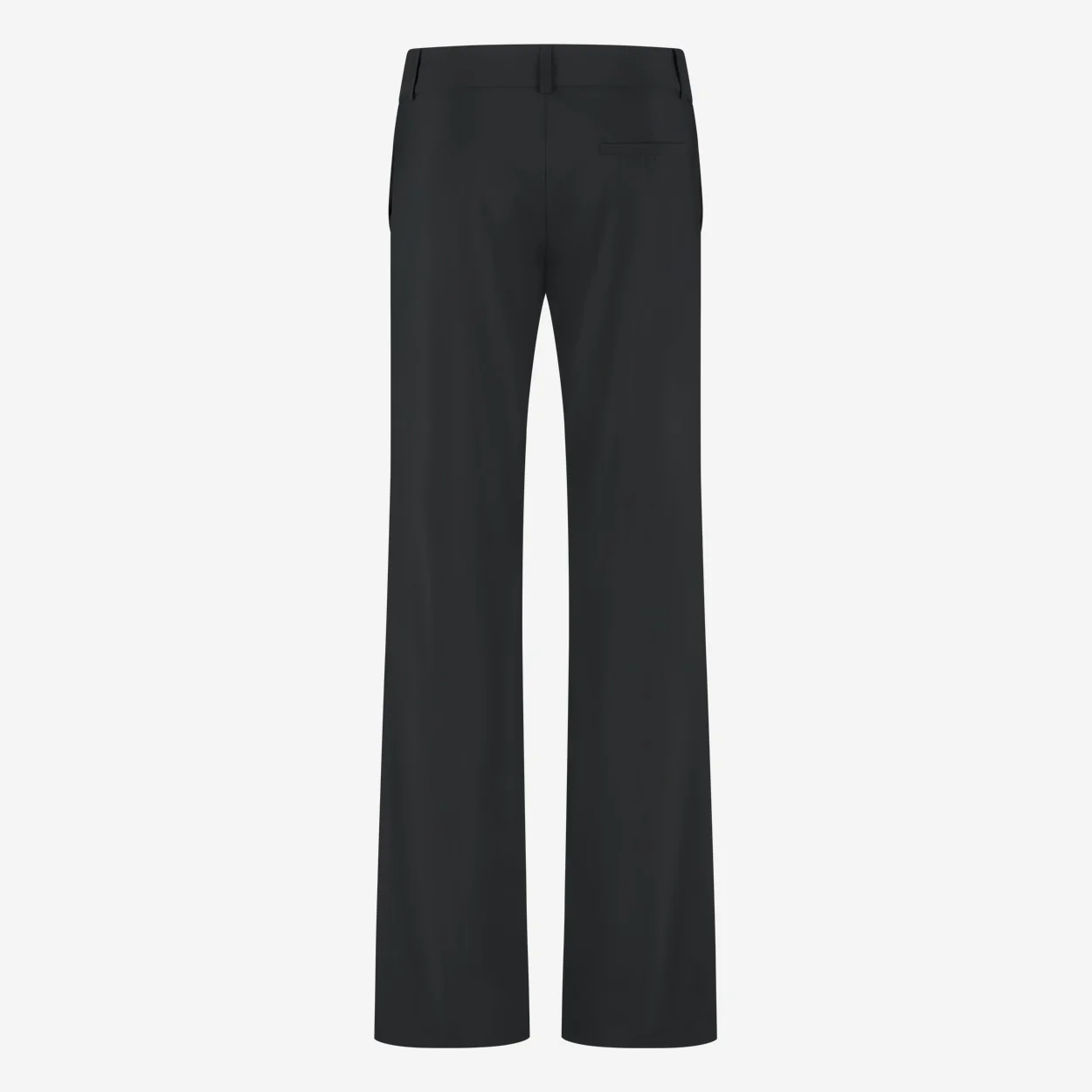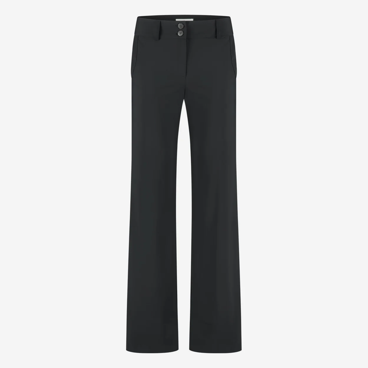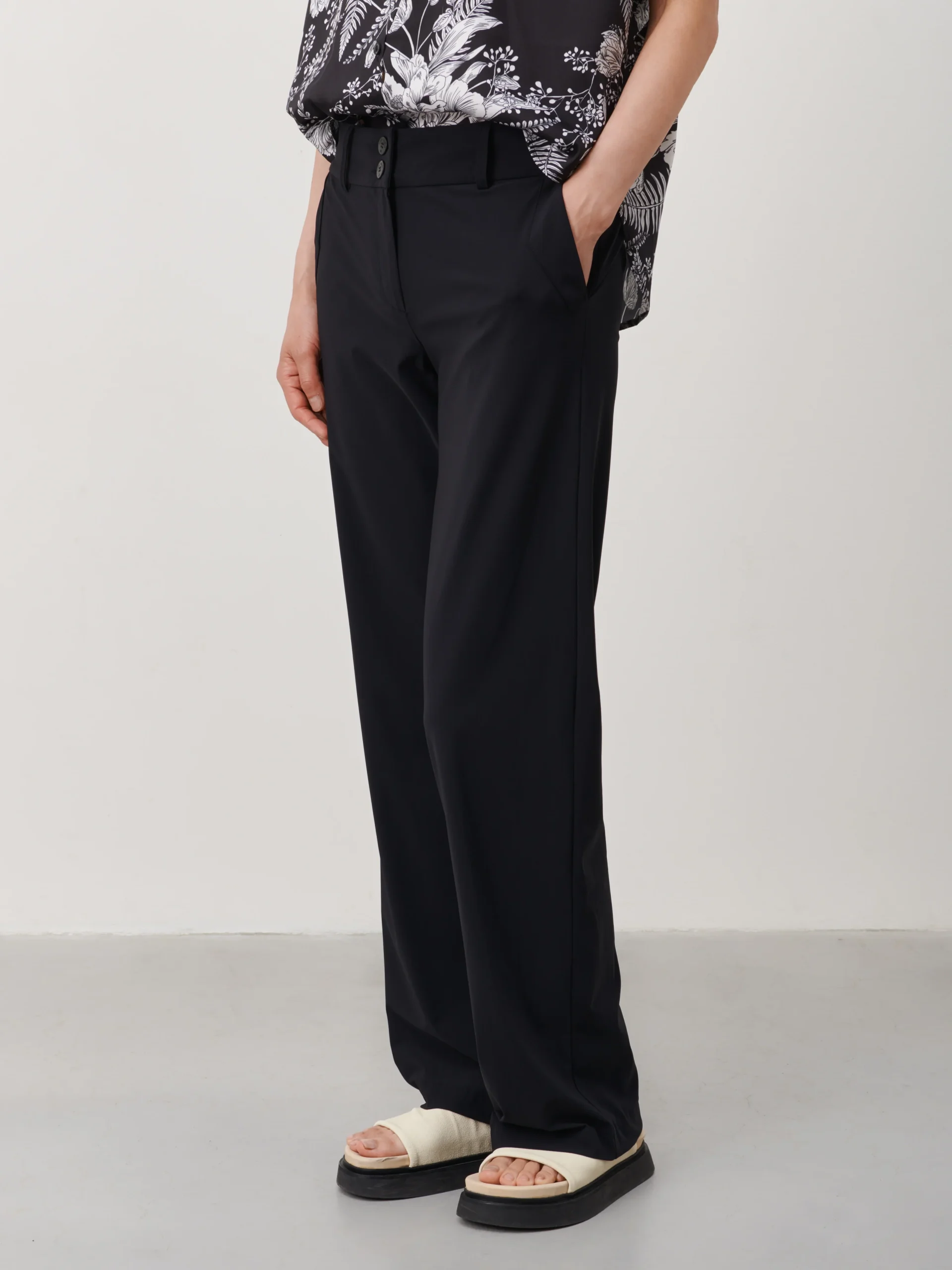 Zwarte Broek in travelkwaliteit, Pants Landa is een nette lange broek met rechte pijpen. Broek heeft twee knopen en rits om te sluiten, heeft lussen voor een ceintuur en een paspel zak op de achterkant.
