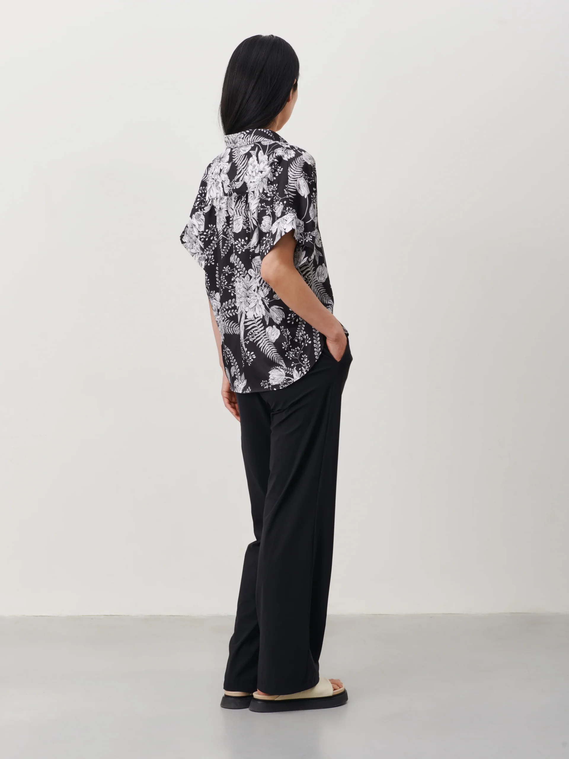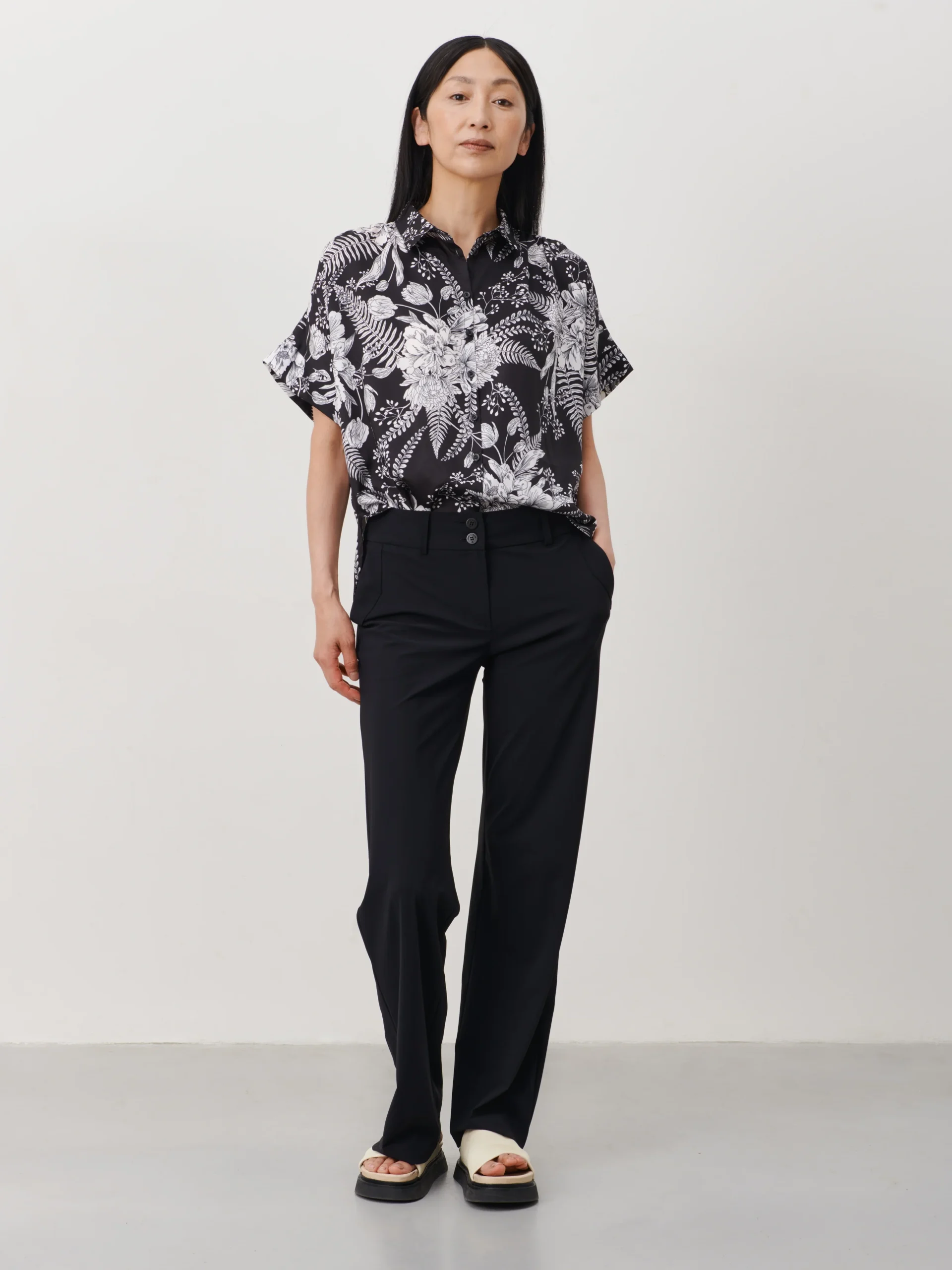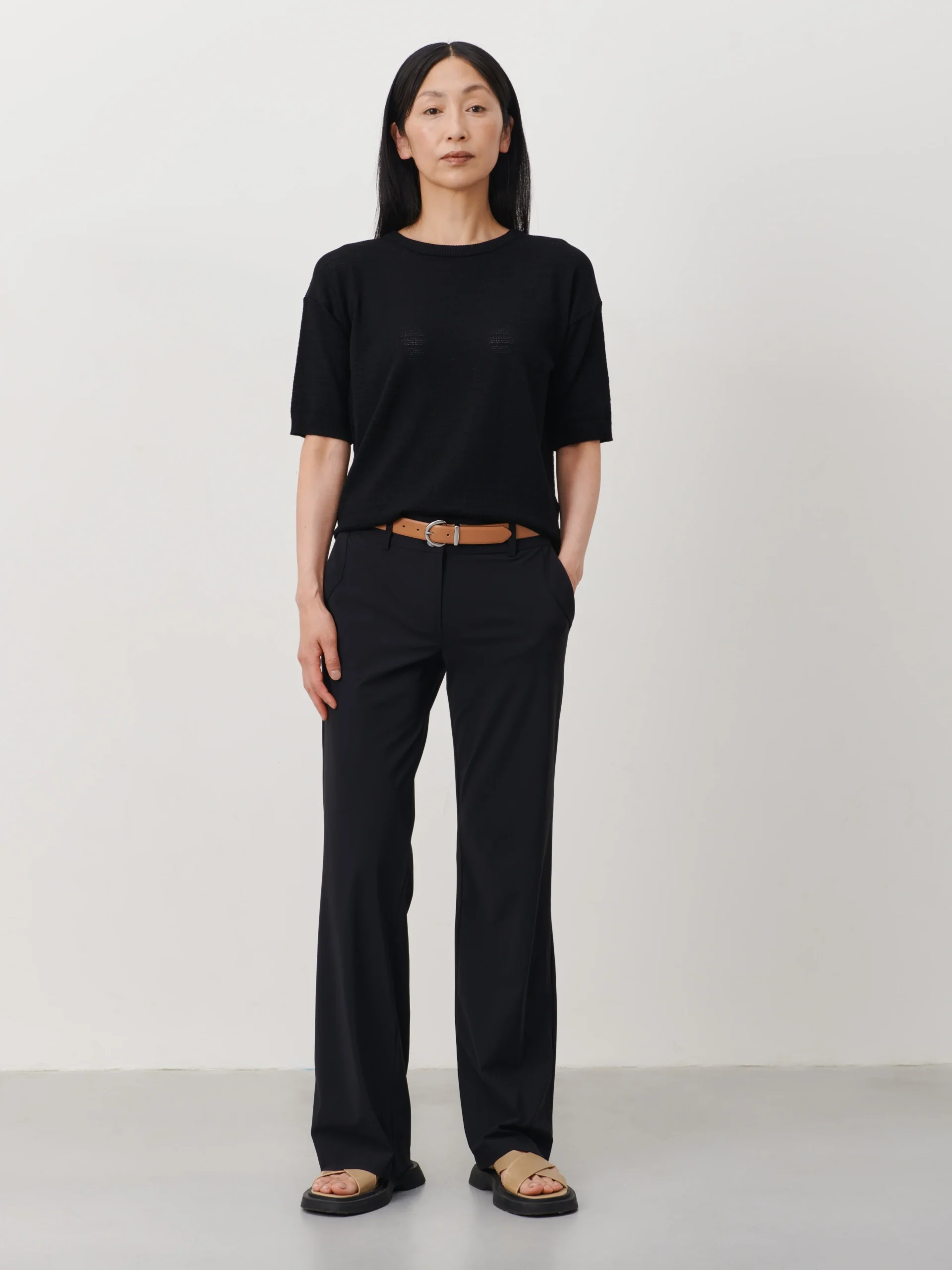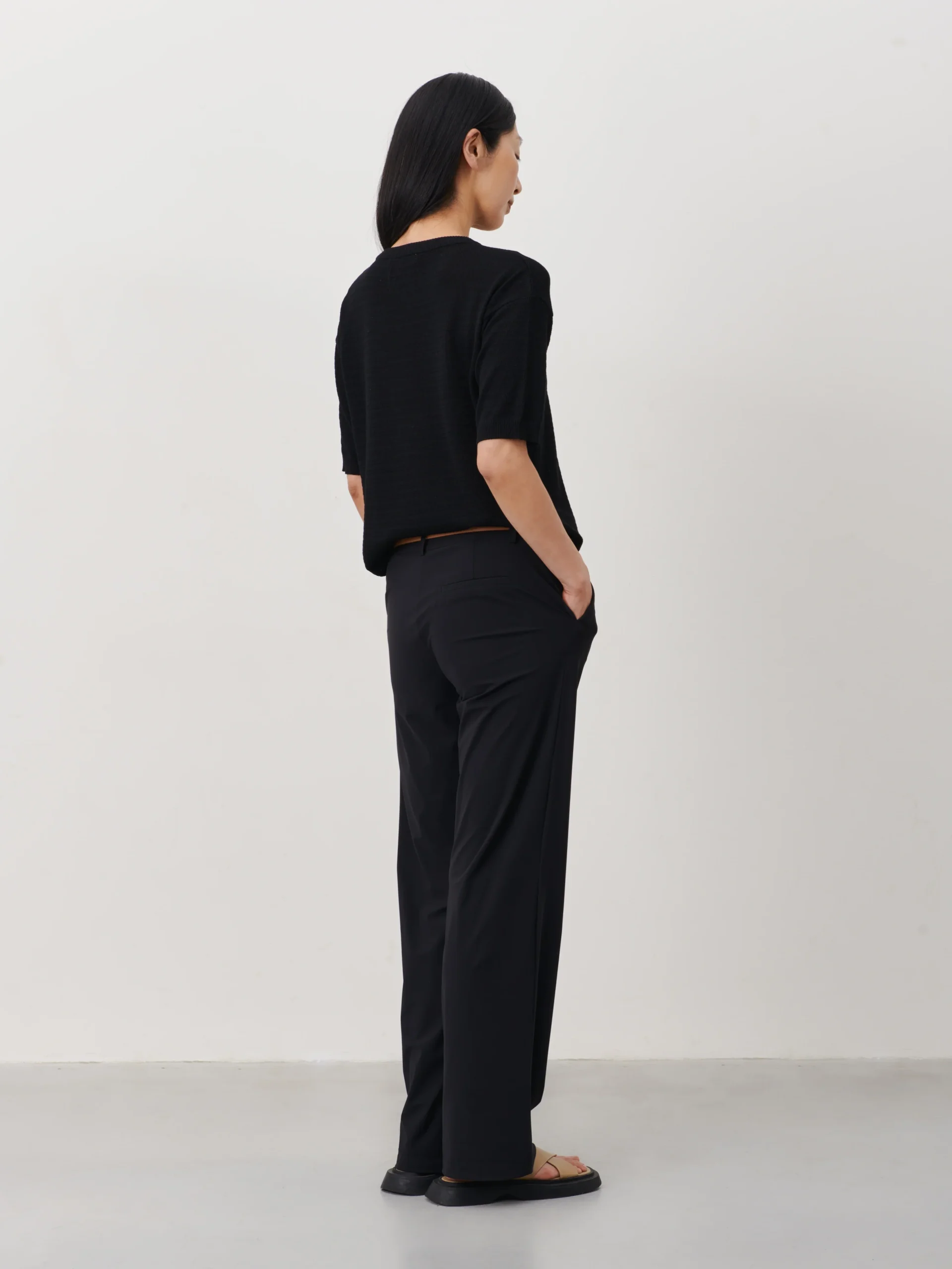 Zwarte Broek in travelkwaliteit, Pants Landa is een nette lange broek met rechte pijpen. Broek heeft twee knopen en rits om te sluiten, heeft lussen voor een ceintuur en een paspel zak op de achterkant.