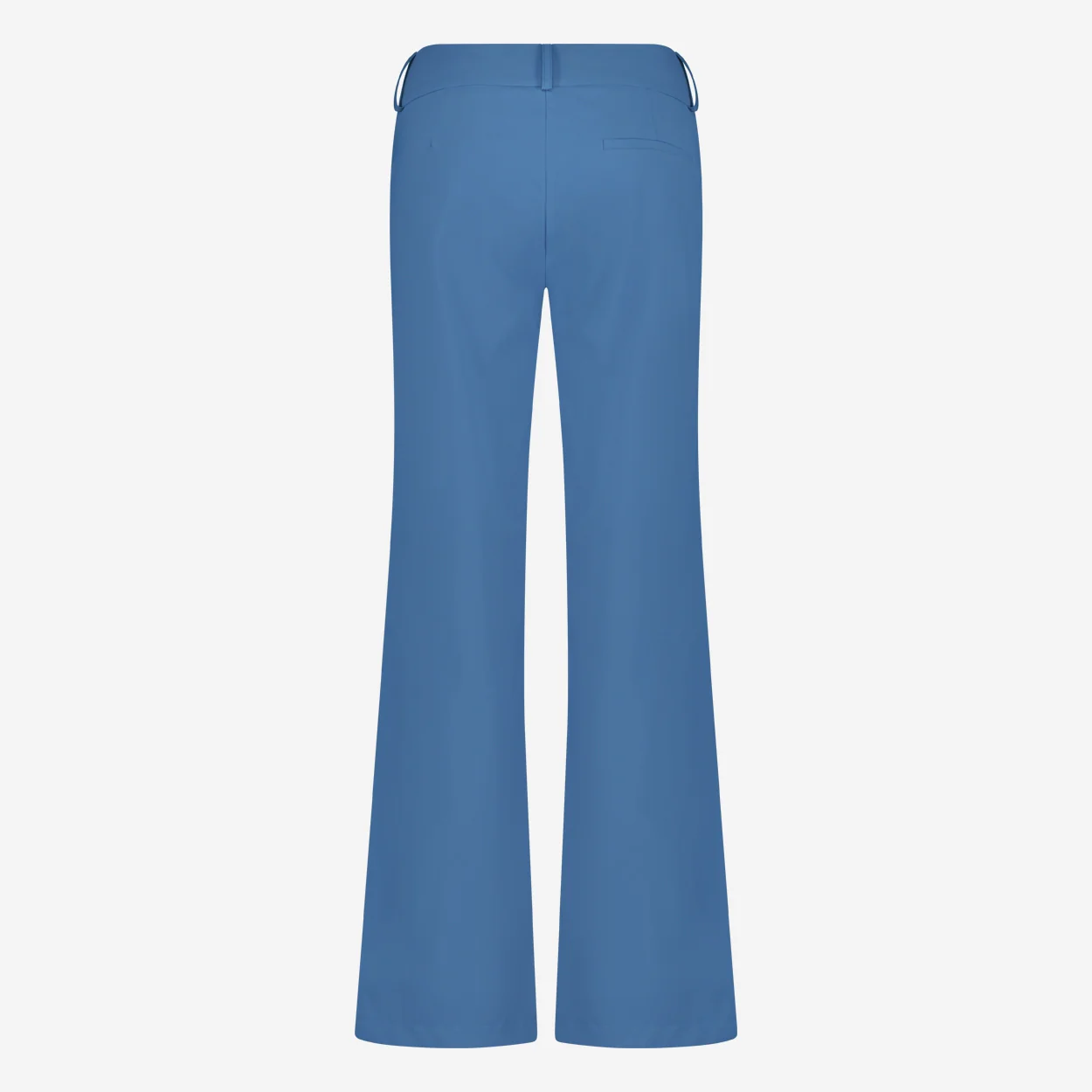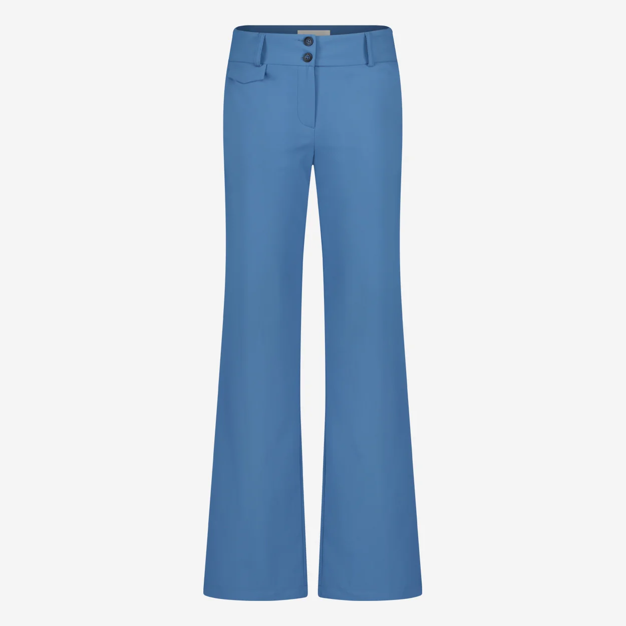 Blauwe Broek in travelkwaliteit, Pants Landa is een nette lange broek met rechte pijpen in een prachtige blauwe kleur. Broek heeft twee knopen en rits om te sluiten, heeft lussen voor een ceintuur en een paspel zak op de achterkant.