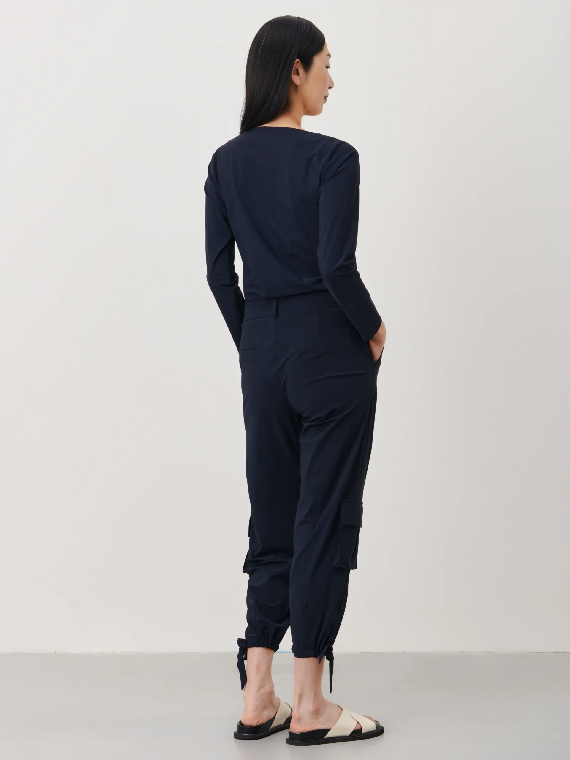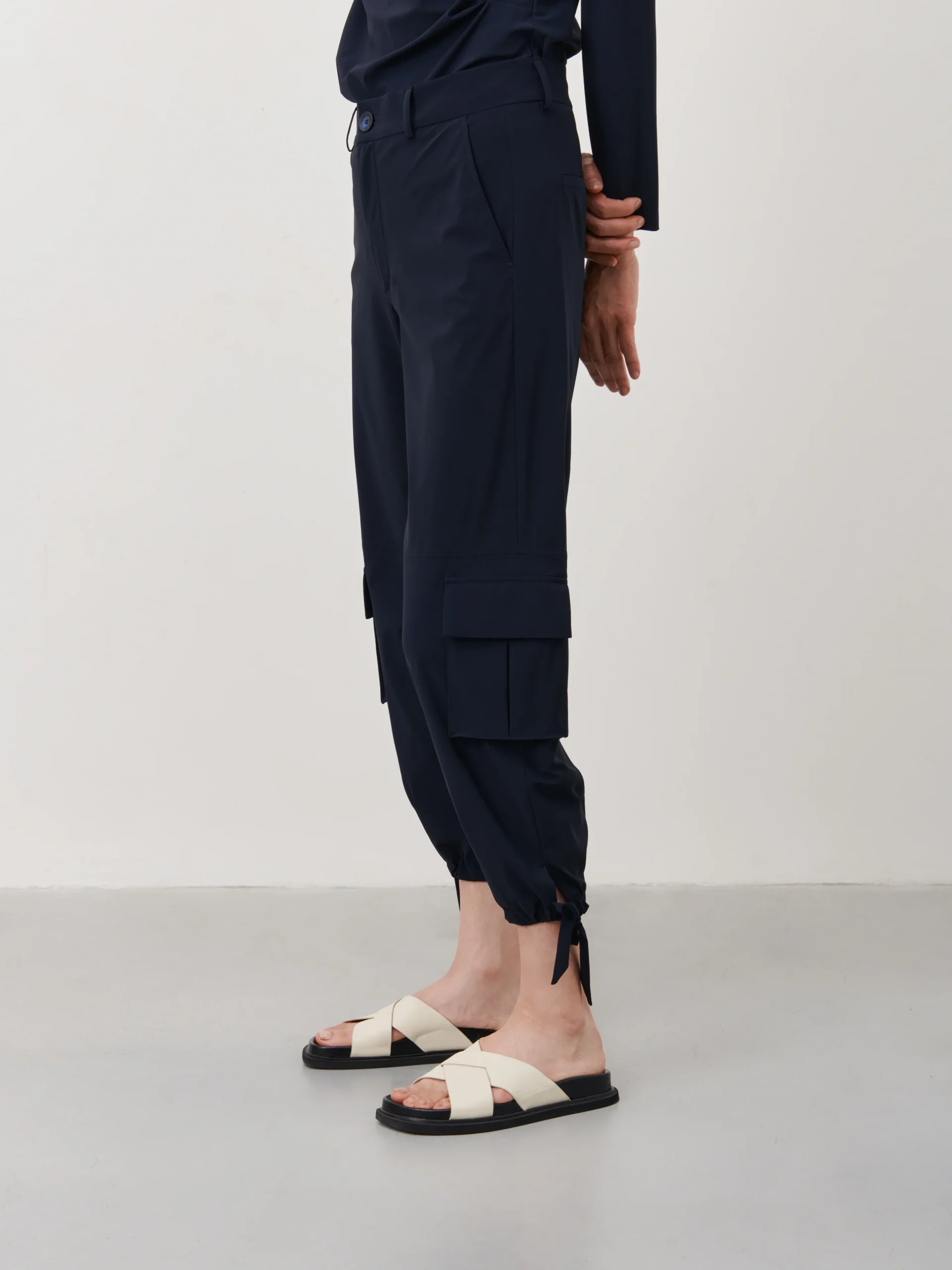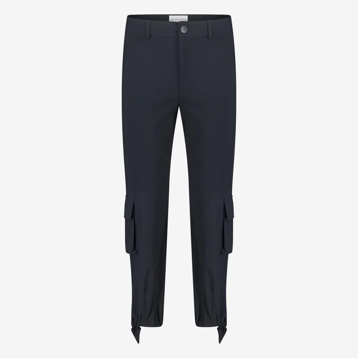 Blauwe Broek in Travelkwaliteit, Trend Pants van Jane Lushka Collectie is een mooie lange nette cargo broek met een rechte losse pijp en strikje onderaan de broek voor een subtiele pof. Trend Broek heeft lusjes voor een ceintuur en een rits en knoop om de broek te sluiten en heeft aan een kant een klepzak en is van de bekende travel kwaliteit.