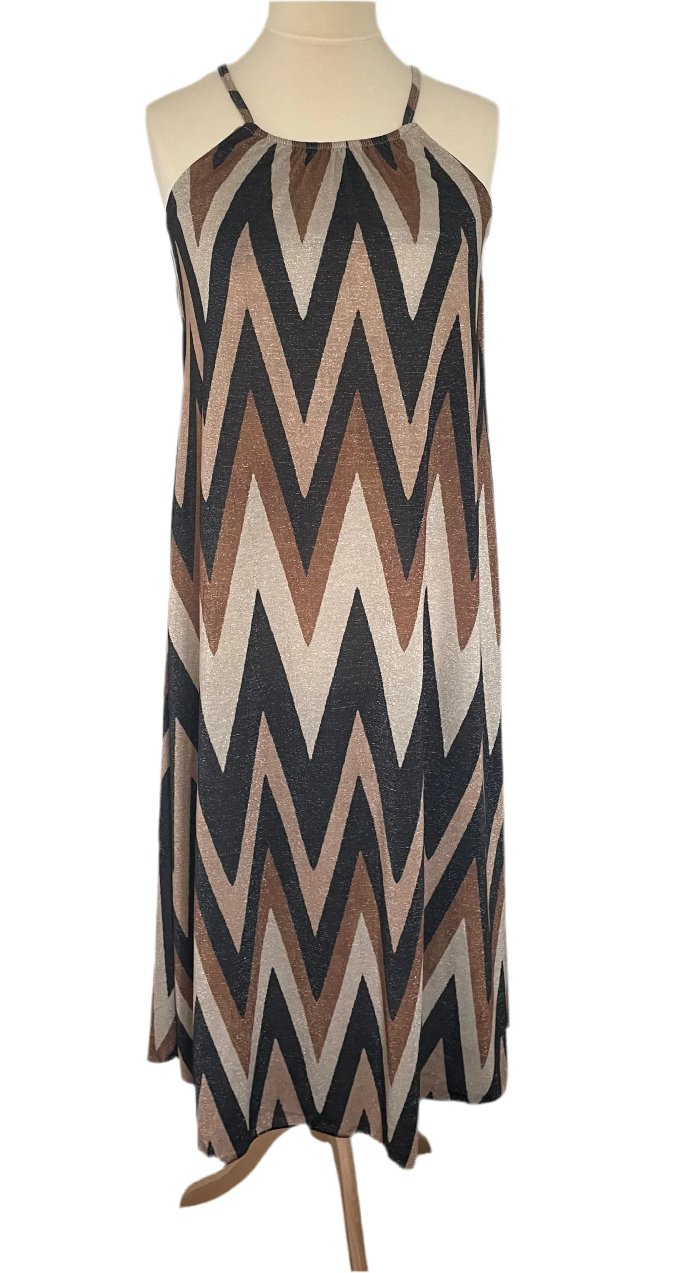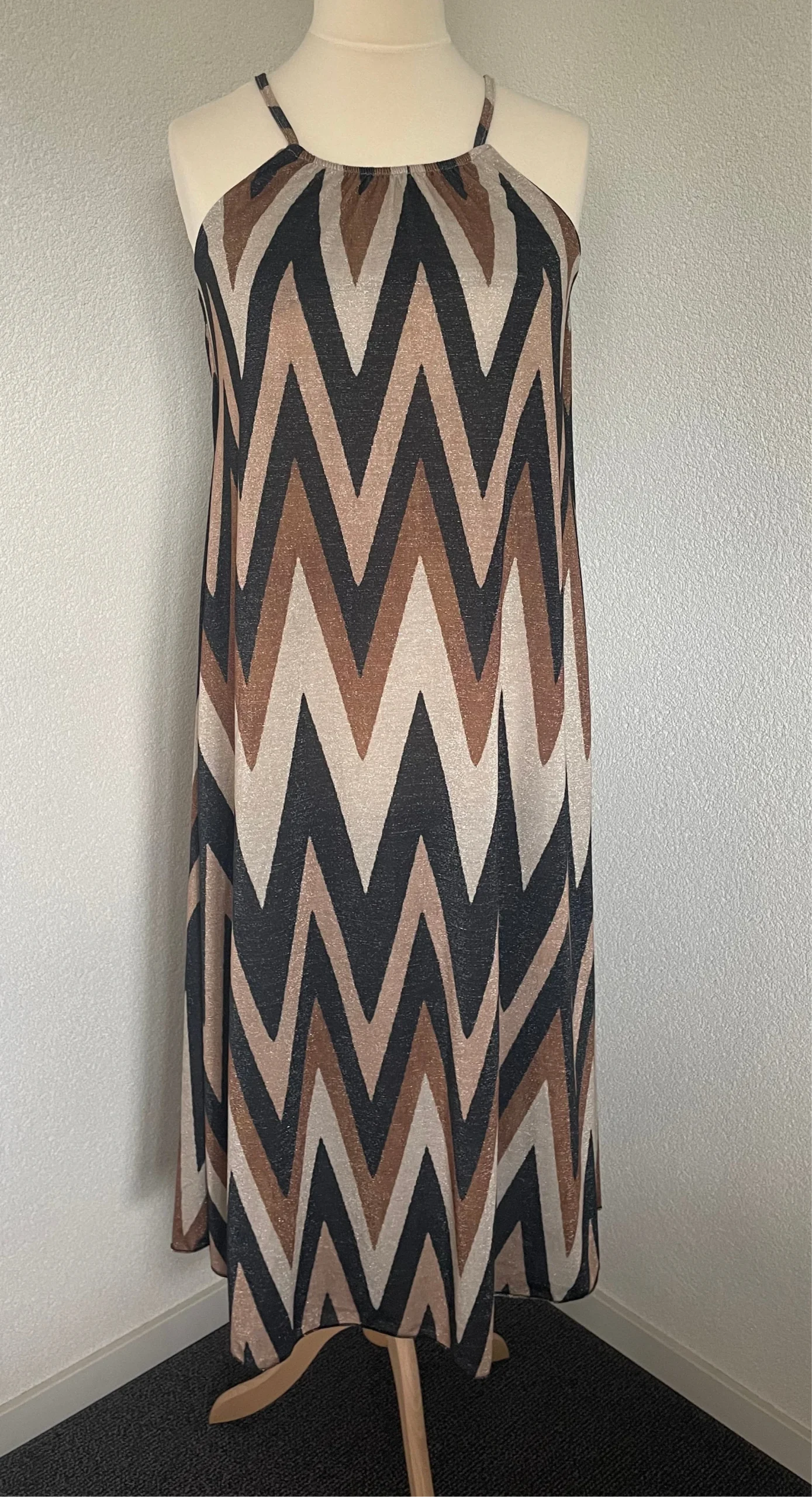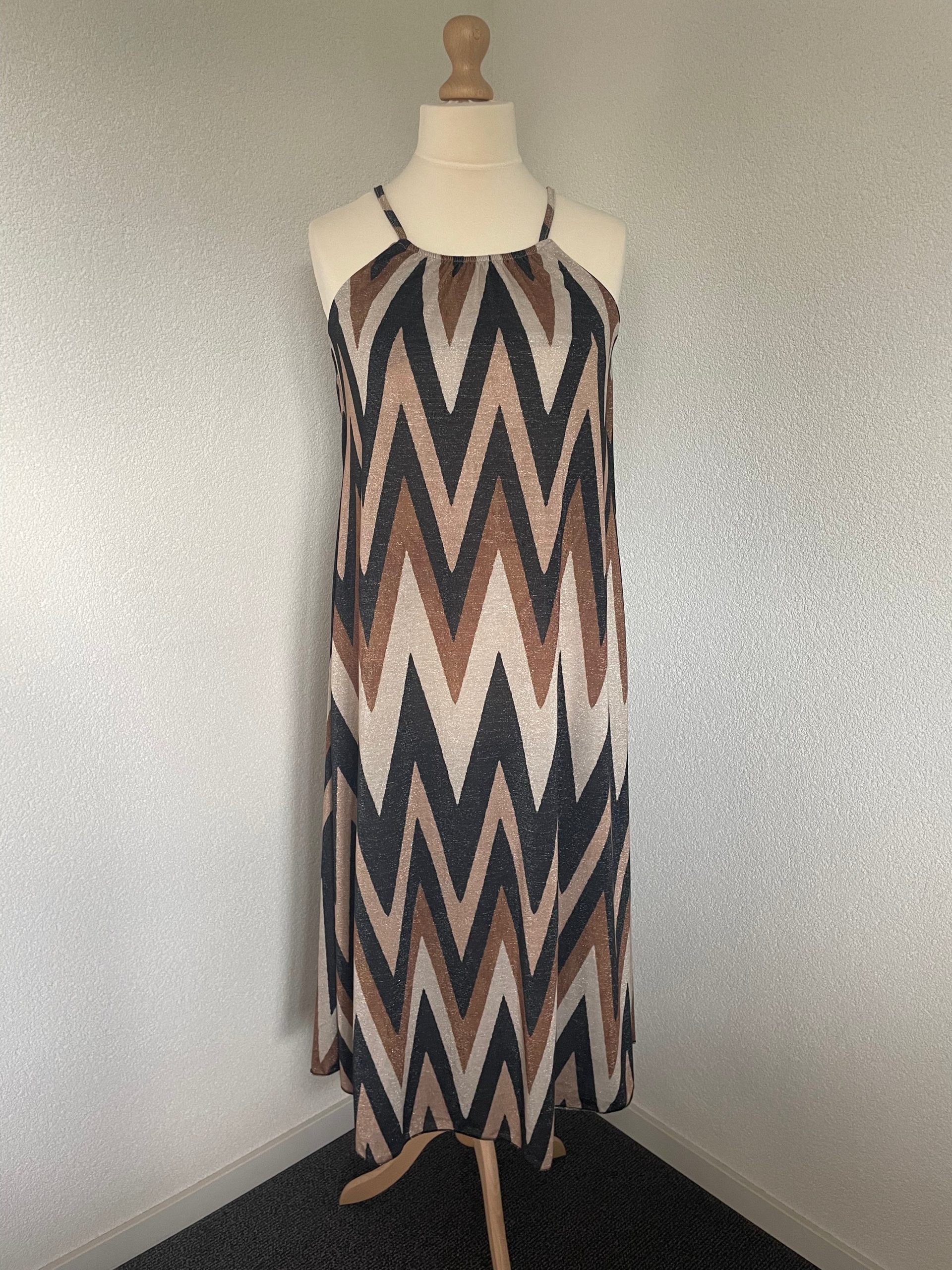 Jurk Maxi Viscose V Patroon is een lange jurk van viscose, in aardetinten met lurex. Jurk heeft veel stretch en zit heerlijk, heeft een ronde hals met elastiek en spaghettibandjes.