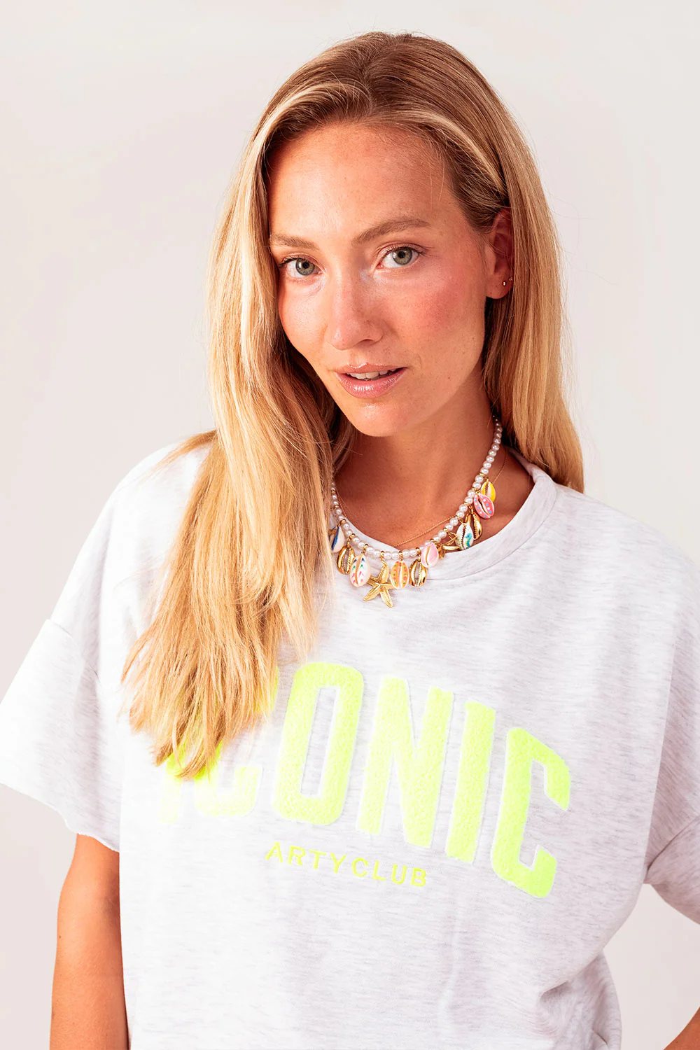 Een korte ketting met witte parels, gekleurde en goudkleurige schelpjes en een hanger van een goudkleurige zeester.