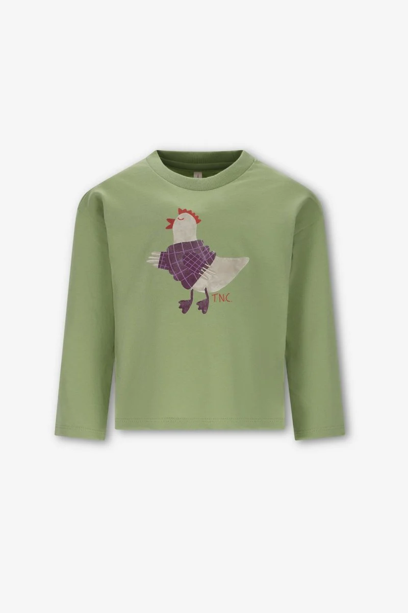 Deze groene Lou longsleeve tovert meteen een glimlach op je gezicht. Op de borst prijkt een vrolijke print van een aangeklede kip – een speels detail waar wij héél blij van worden. Gemaakt van duurzaam katoen en afgewerkt met een zachte ribboord aan de hals voor extra comfort en een mooie pasvorm. Perfect voor elke dag! Dit chapter is ontworpen in samenwerking met @anouskaband.