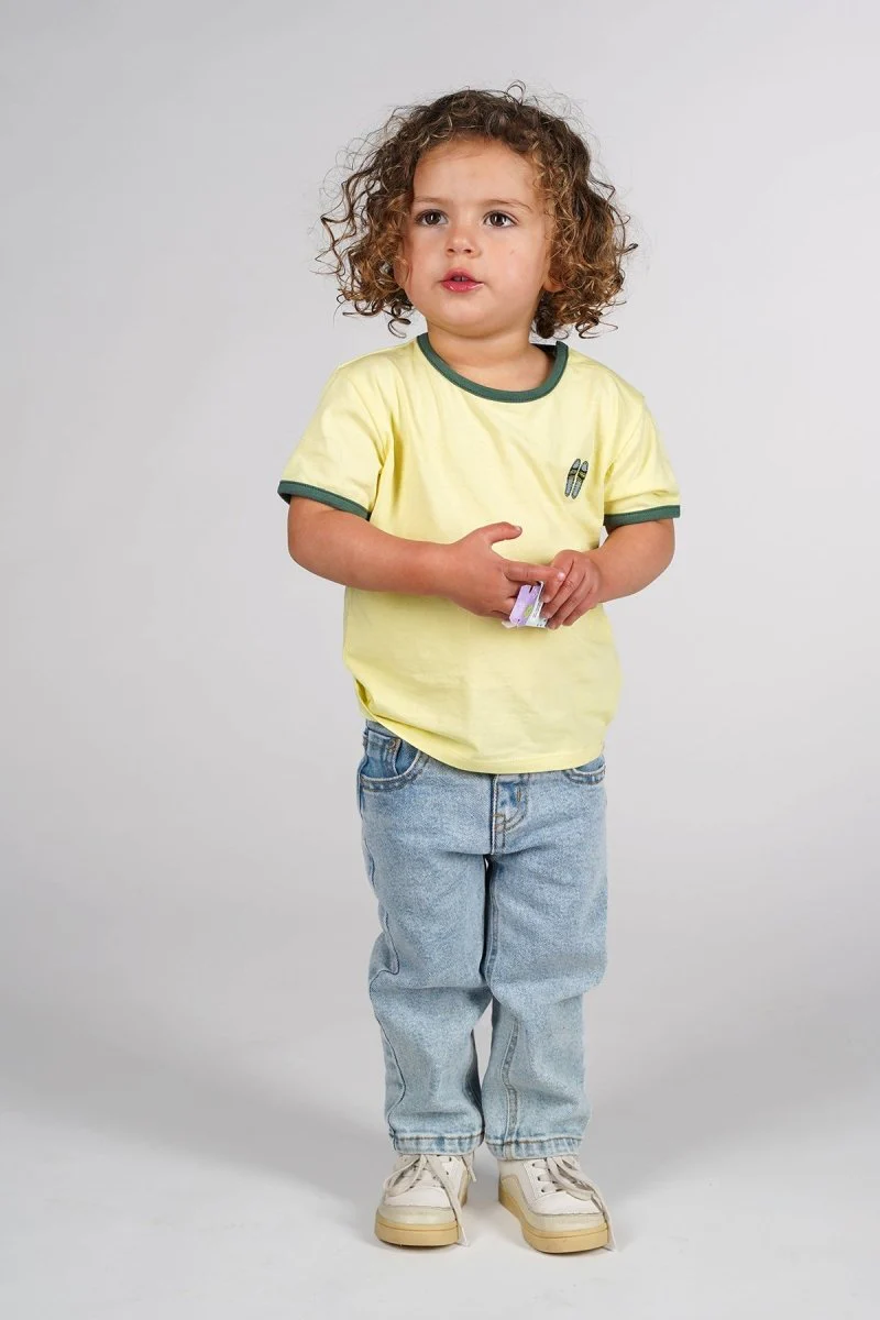 Summer here we come! Dit Manu T-shirt heeft een frisse, gele kleur met donkergroene randen bij de hals en mouwen. Het kleine, speelse borduur van teenslippers geeft een zomerse touch. Een eenvoudig maar vrolijk shirt, perfect voor zonnige dagen! Duurzaam gemaakt. Dit chapter is in samenwerking met @_elisee_o.