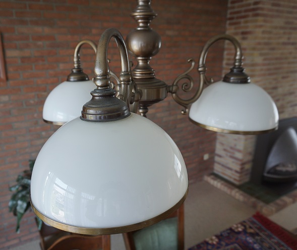 Gebruikte, maar in goede staat verkerende hanglamp met drie lichtpunten met dimmer. Merk: Massive. De hanglamp wordt gekenmerkt door een antiek accent, doordat de metalen elementen een enigszins onregelmatige oud messingtint hebben. Of u deze lamp nu boven de eet- of salontafel gebruikt, deze hanglamp staat garant voor zeer aantrekkelijk licht. Afmeting: doorsnede van 70 cm, 50 cm hoog met een ketting met extra hoogte van 40 cm.
