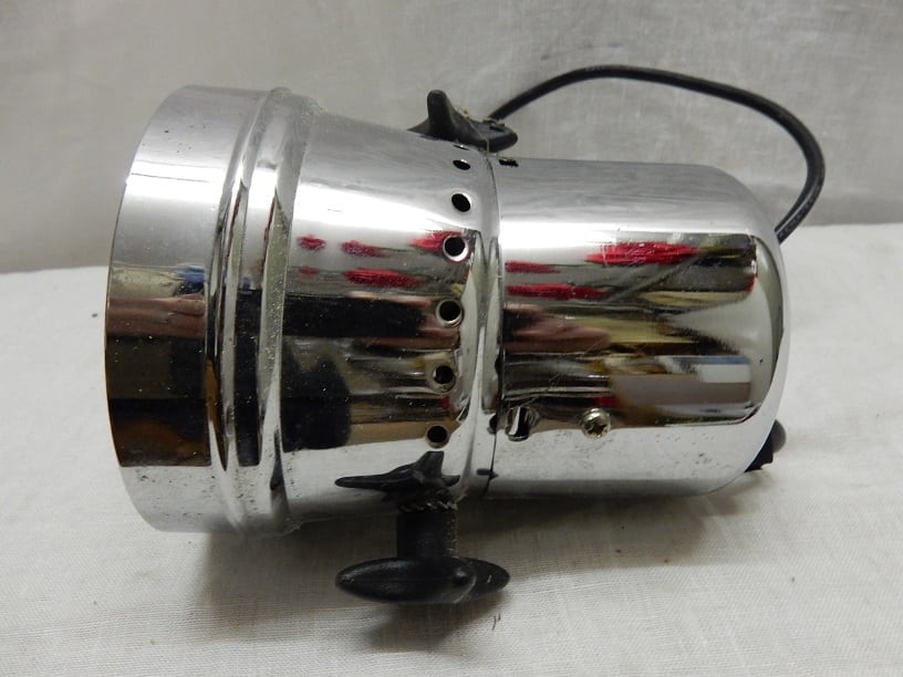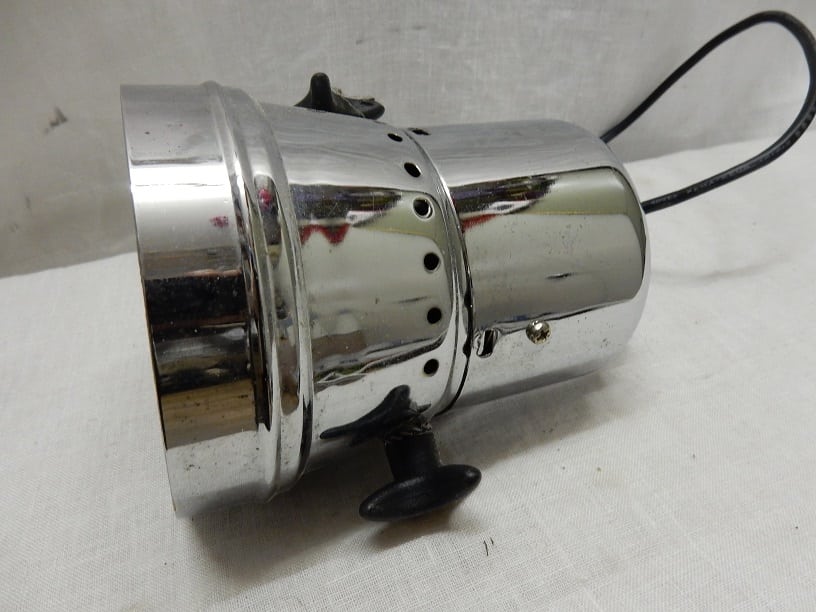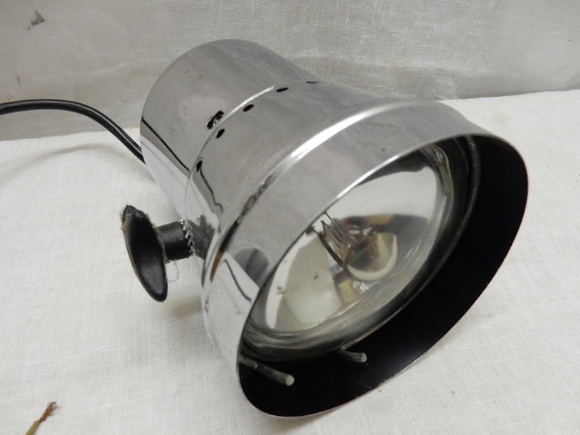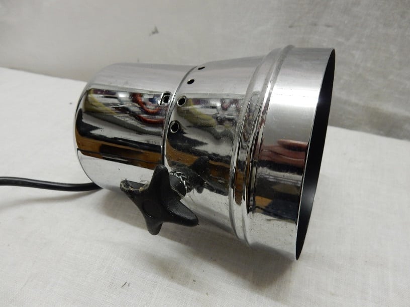 Metalen spot met halogeen verlichting. Afmeting 15 cm hoog en een doorsnede van ongeveer 11.5 cm.